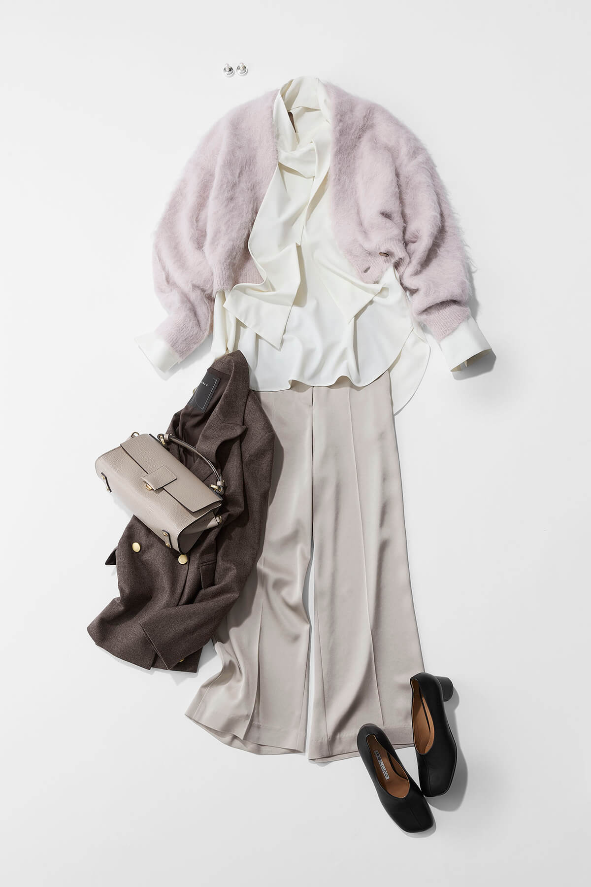 ショート丈がトレンドのニットに、シャツを思いっきりアウトにしたスタイリング。着丈の差を楽しんで、バランス良く仕上げています。ワンピースとあわせて着るのもいいですが、ボウタイやセンタープレスのパンツのような、縦のラインがあるものを合わせると、ボリュームのあるモコモコしたニットが着膨れせず、すっきり着ていただけます。ピンクが主張しすぎないよう、全体的にやわらかいトーンでまとめています。