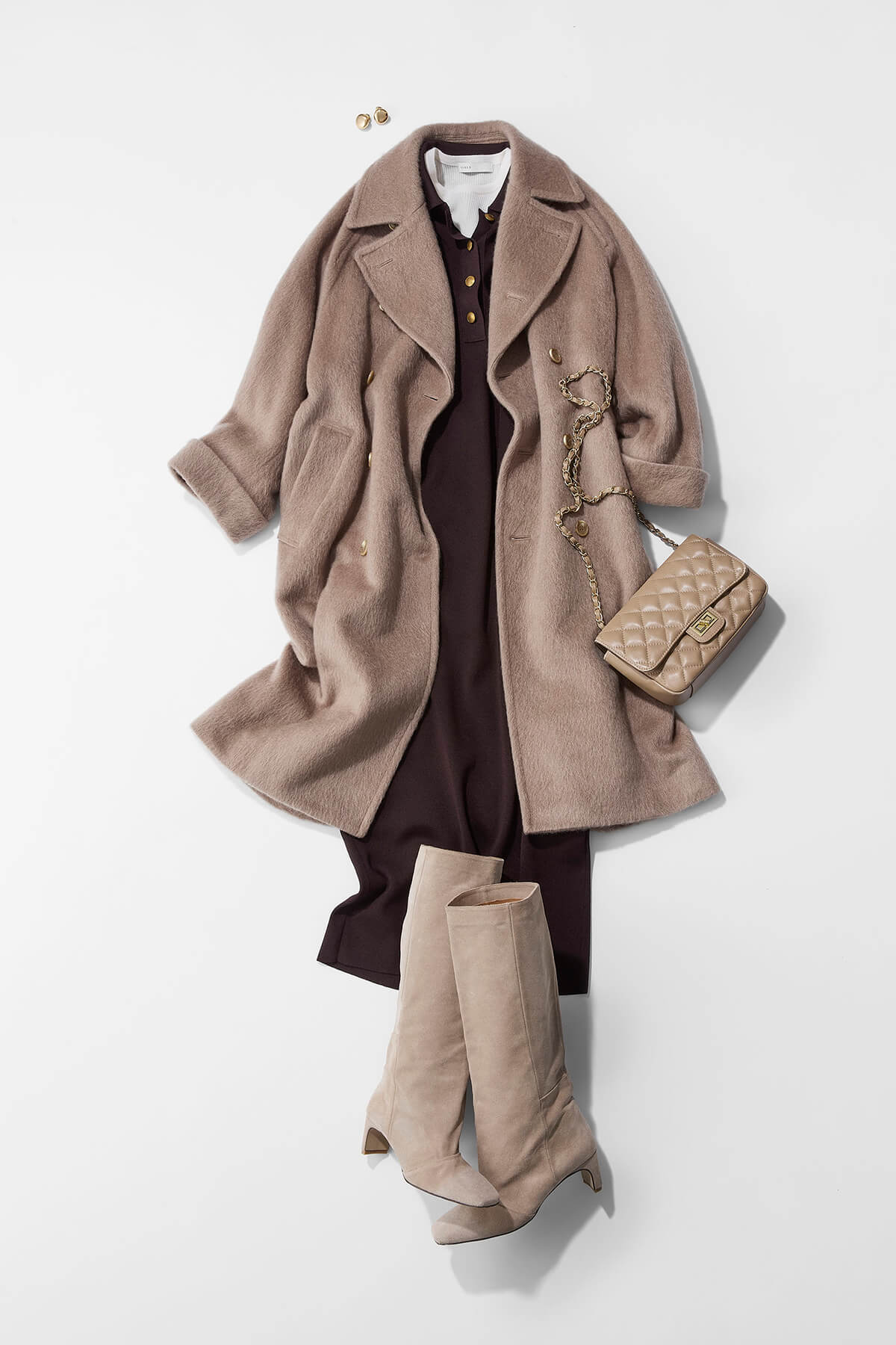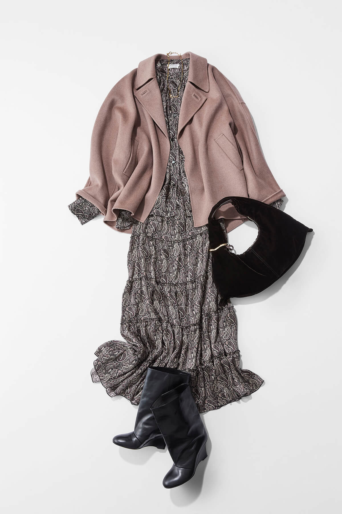 ワンピースのようにセットアップで着た、ペイズリー柄の色味に合わせて、アウターも同系色のベージュでトレンドのモカムースの世界観を。アウターは黒でもいいのですが、明るめのベージュを着ると柔らかくなり、柄の良さも引き立ちます。柄物を着るときは、その中に入っている色味でコーデを組むのがおすすめ。バッグやシューズも、柄の中から抽出した濃色を意識して合わせて、メリハリをつけています。