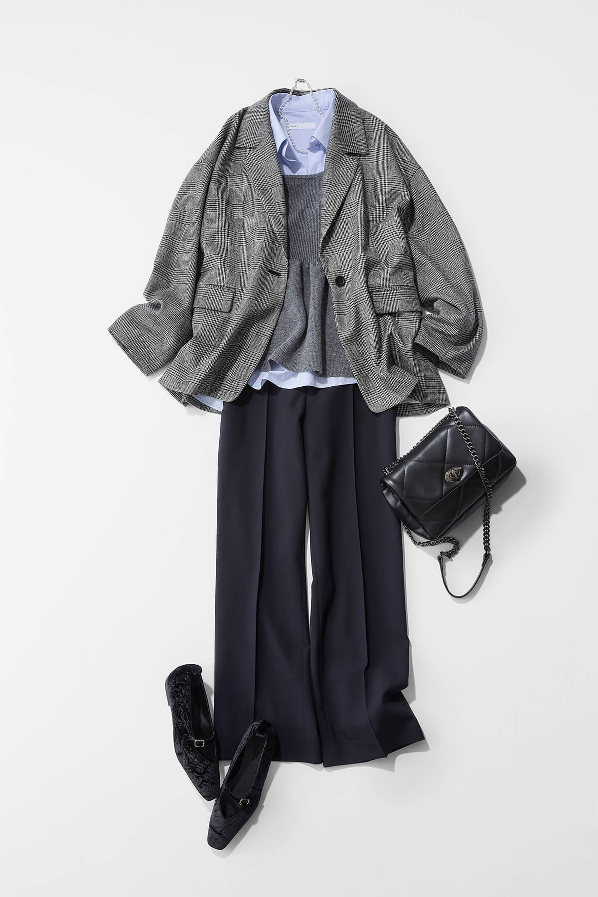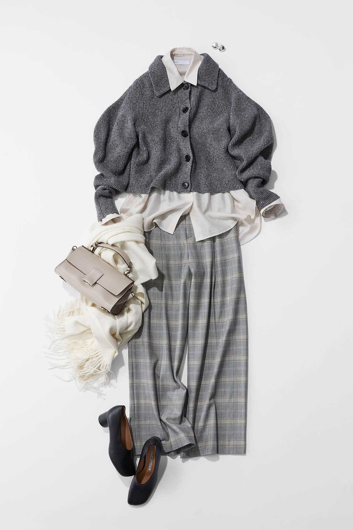 チェックパンツを主役に、グレーとオフホワイトのグラデーションでまとめて。ニットは流行りの襟付きデザインで、一枚で着ても主役級の可愛さがありますが、中にタートルを着ちゃうと少しほっこりしてしまうため、シアーなシャツなどの異なる素材をレイヤードしてあげると、スタイリッシュに決まります。冬は重ね着する季節なので、シャツはアウトしてレイヤードを楽しんでもらうのがおすすめです。