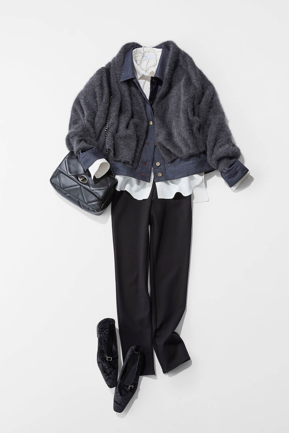 大人には挑戦アイテムである可愛いニットビスチェを、あえてマニッシュなシャツ・ジャケット・パンツで甘さを引き締めて、「 自分ならこう着るかな」 と思ってスタイリングしました。ビスチェのデザインがペプラムになっていてボリュームがあるため、パンツはワイドではなく、センタープレスの入った縦のラインを協調してくれるすっきりしたシルエットのものがおすすめです。足元にはトレンドのメリージェーンで、女っぽさも足しています。