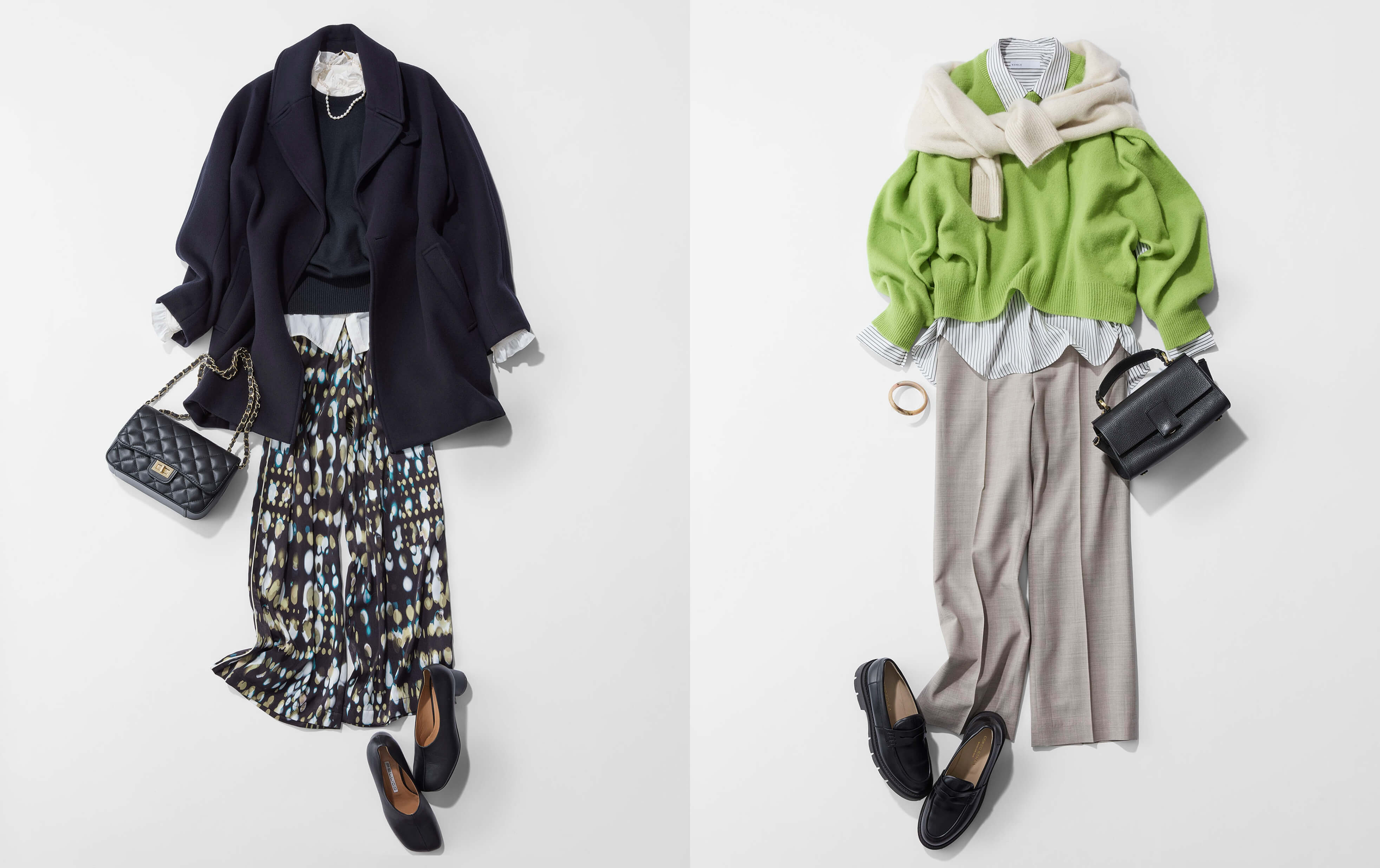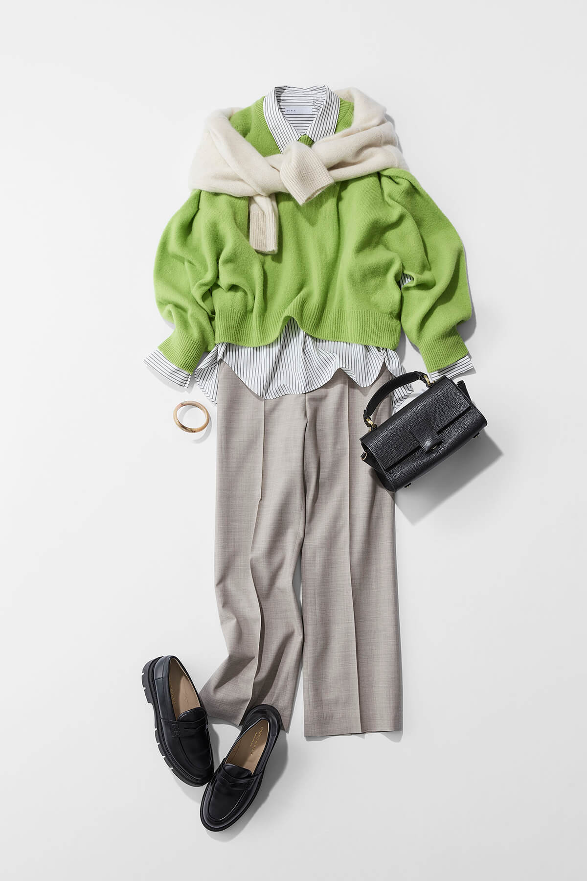鮮やかなグリーンのニットに、ストライプのシャツを合わせることで印象が和らぐため、色物にチャレンジしたい方におススメのレイヤードスタイル。淡いカラーのボトムス合わせで、さらに優しく仕上げています。ストールのようにニットを肩掛けして、トラッドな雰囲気が出ると秋らしさが出て可愛いなと。ニット× ニットだから、パンツは少し光沢のある素材を。バッグとローファーを黒で引き締めると、よりトラッド感が引き立ちます。
