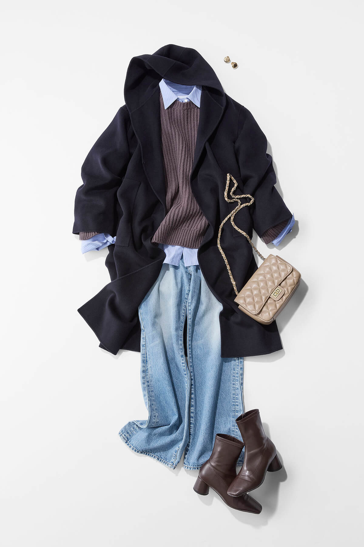 上質で肌触りのいい、リバーフーディーコートは、ゆったりとしたシルエットで中に着こめる余裕があるので、厚手のニットを着てもモコモコして見えないのがうれしい。ニットは編み目がはっきりしているから、のっぺり見えなくていいですね。編み目が目立つ立体的なニットは、レイヤードをする冬の着こなしに奥行を出してくれます。ウェアの素材で温かみを出しながら、チェーンバッグで華やかな軽やかさもプラスしています。
