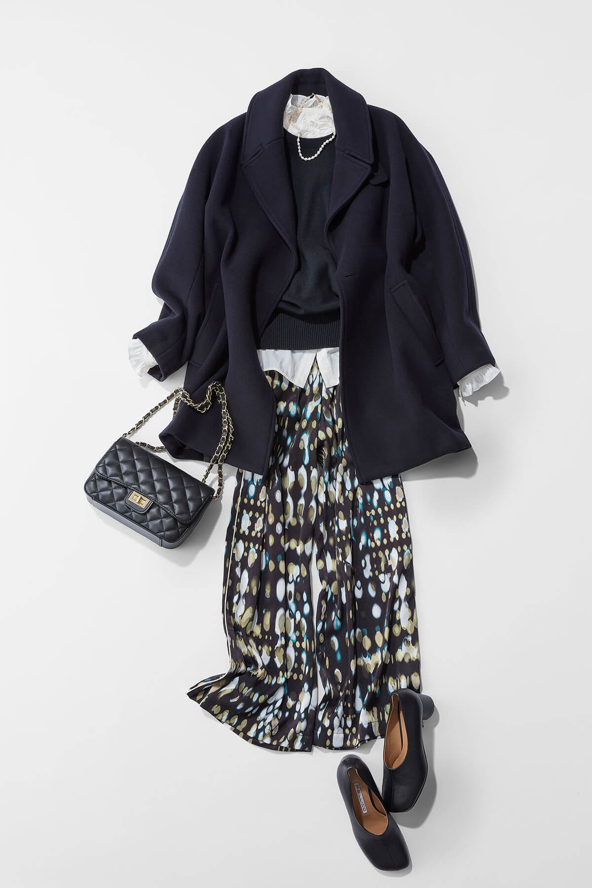 街中のライトをイメージしたプリントパンツは、一見スタイリングが難しく感じるかもしれませんが、ブラックベースなので意外と合わせやすいのでおすすめ。パンツを主役にしながら、色合わせをネイビーでまとめると大人っぽく仕上がります。シンプルなシャツではなく、フリルディテールがあるシャツで遊びを入れて、コートはスタンダードなものを選ぶと、よりプリントやフリルディテールが引き立ちます。
