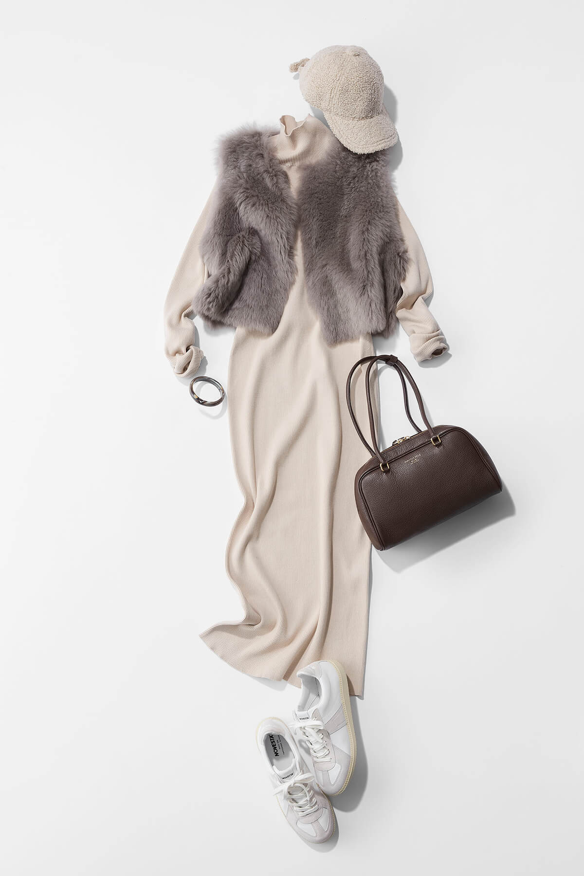 身体を覆う細リブのニットワンピースは、のっぺりとして見せないようにするのがコツだと思っていて、今回はトレンドのファーアイテムの中から、コンパクトかつボリューミーなジレをレイヤード。ボリュームのあるファーとIラインのニットワンピースは、お互いに相性が良いアイテム。同じトーンでまとめることで、ファーのアッパーさも和らげてくれます。ブーツなどで女っぽくするのもいいですが、コンサバすぎないようスニーカーとキャップでカジュアルに外して。