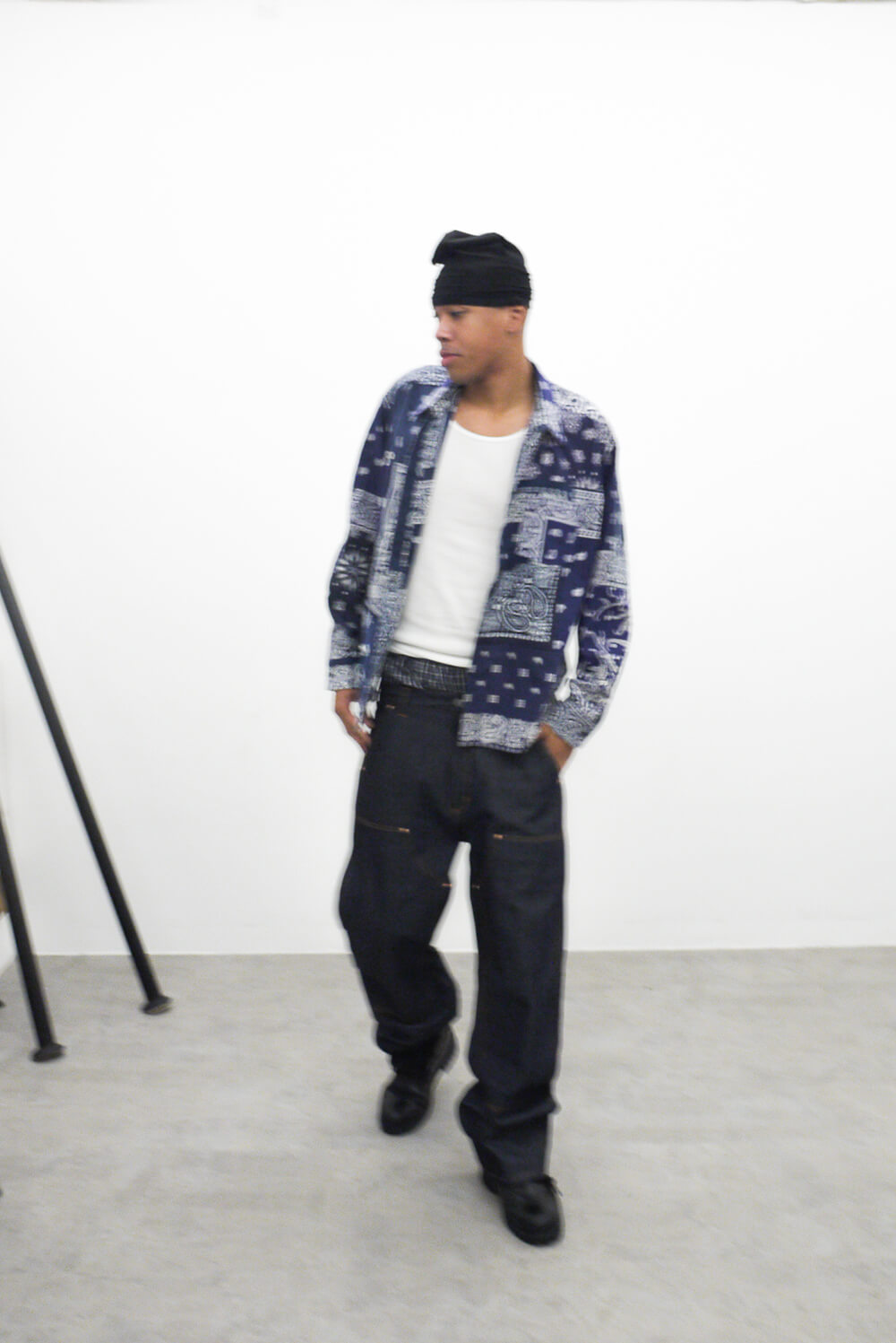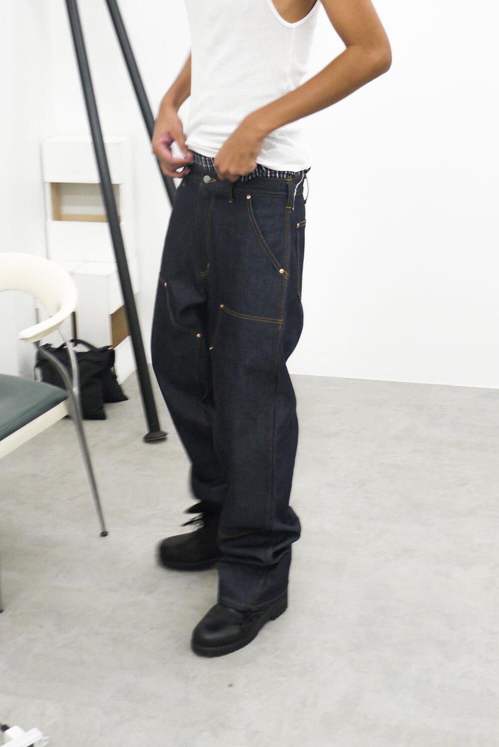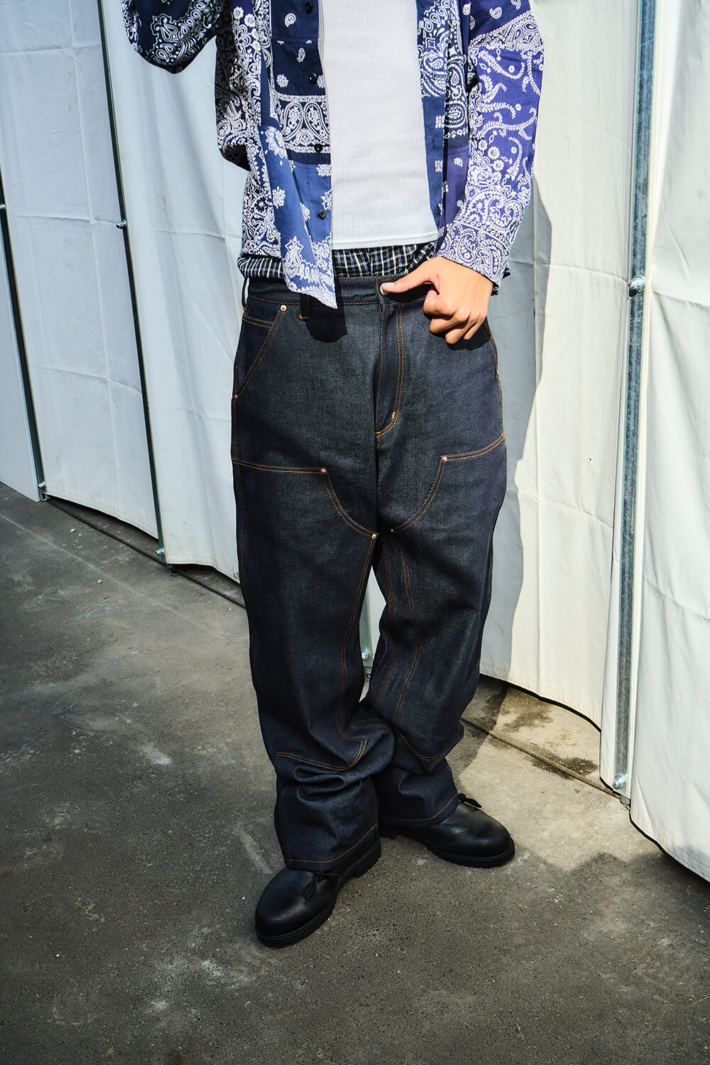 クリーンな印象のリジットデニムと、ダブルニーのデザイン感が程よくマッチしており、