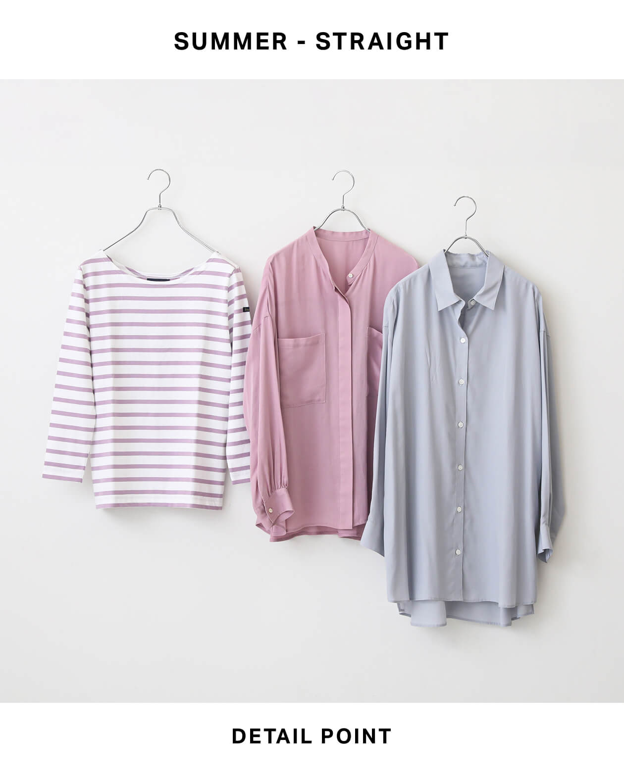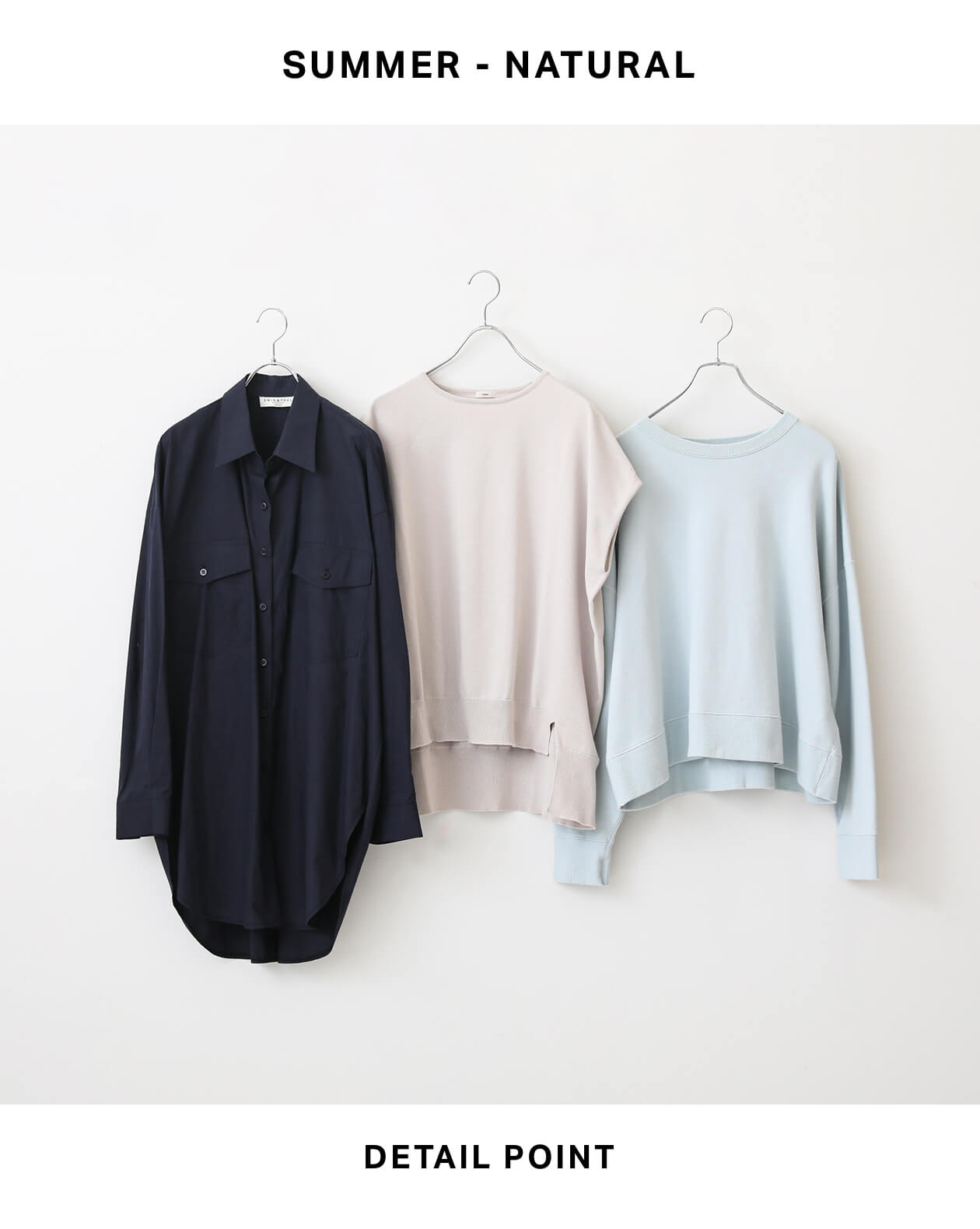 ベーシックなシャツやプルオーバーは、ナチュラルタイプらしいオーバーなサイズ感でこなれた印象にまとめて。サマータイプはキレイめな色が多いので、ドロップショルダーのデザインを選ぶか、えり抜きなどのこなしであえてラフに着崩すのが今っぽいスタイルバランス。 - SLOBE IENA【EMIN&PAUL/エミンアンドポール】BACK GATHERED シャツ◆¥18,150(税込)
