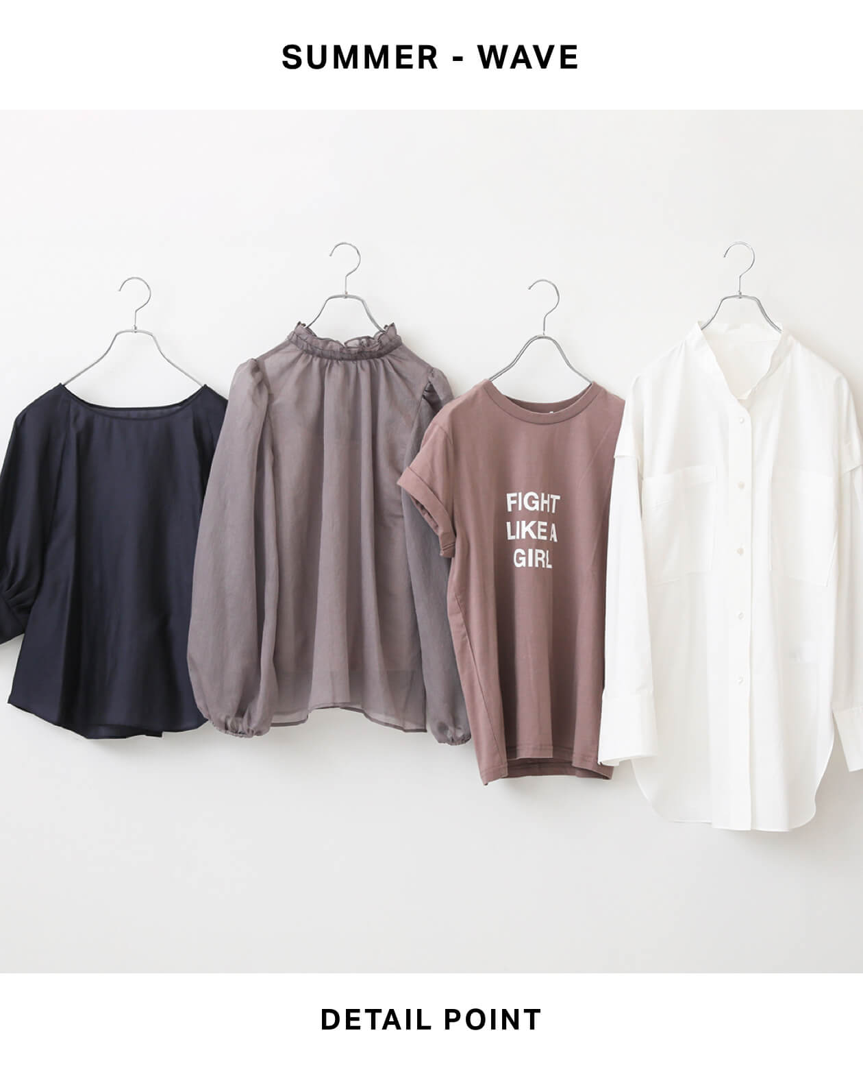 フロントにリボンをあしらったフェミニンなオーガンジーブラウスをはじめ、上半身がさみしくならない、ポイントの効いた首元や袖のデザインがウェーブタイプにぴったり。Tシャツやシャツなどのカジュアルなアイテムを着るときも同じく、袖などにデザインがあるか、“着られている感”の出ない薄く柔らかな素材かどうかをチェックしてみて。 - Spick and Spanライトクロス タックスリーブブラウス◆¥16,500(税込)