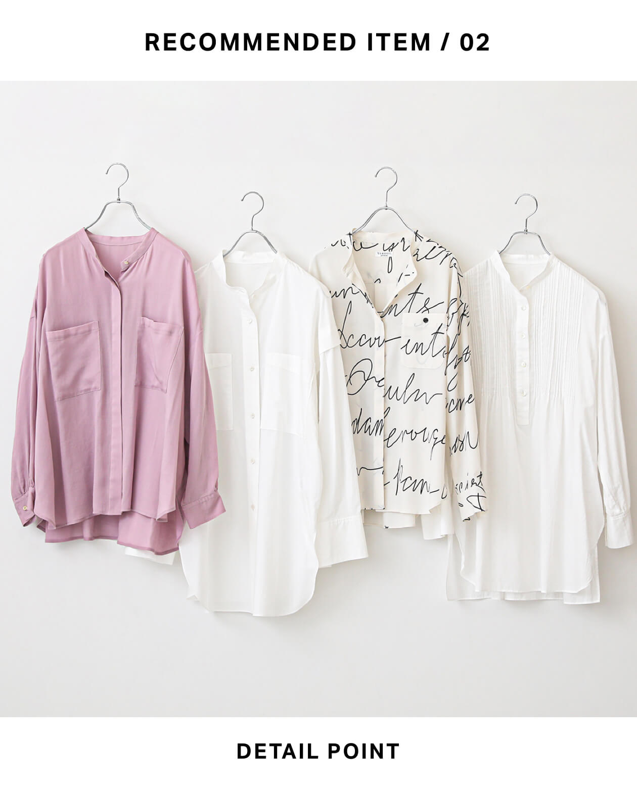着回し力のあるベーシックなホワイトシャツも、バンドカラーでスタイリッシュに。サマータイプなら、曇り空のようにややけむったマシュマロホワイトがおすすめ。サマーさんの持つやわらかい雰囲気をさらに引き立ててくれます。個性的な手書き風プリントシャツや、シャツだから甘くなり過ぎないパープルのトップスはコーディネートに遊びを加えたいときに。 - Spick and Spanコットンサテンパッチドポケットシャツ◆¥17,600(税込)
