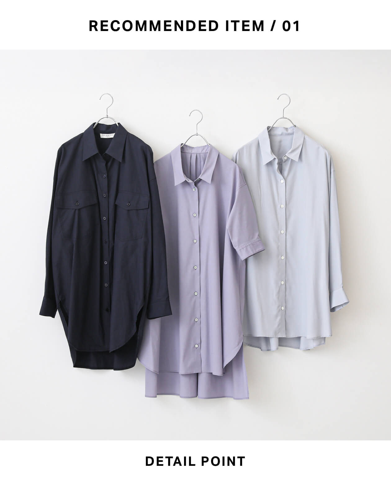サマータイプの涼しげなブルーは着るだけでキリリと潔いスタイルに。ラベンダー色ならより女性らしく、ベースがブルーなので甘くなり過ぎず爽やかに着こなせます。ヒップが隠れるオーバーサイズのチュニックはイージーに羽織って、大人の余裕を醸して。 - JOURNAL STANDARDスラブストレッチチュニックシャツ◆¥13,200(税込)