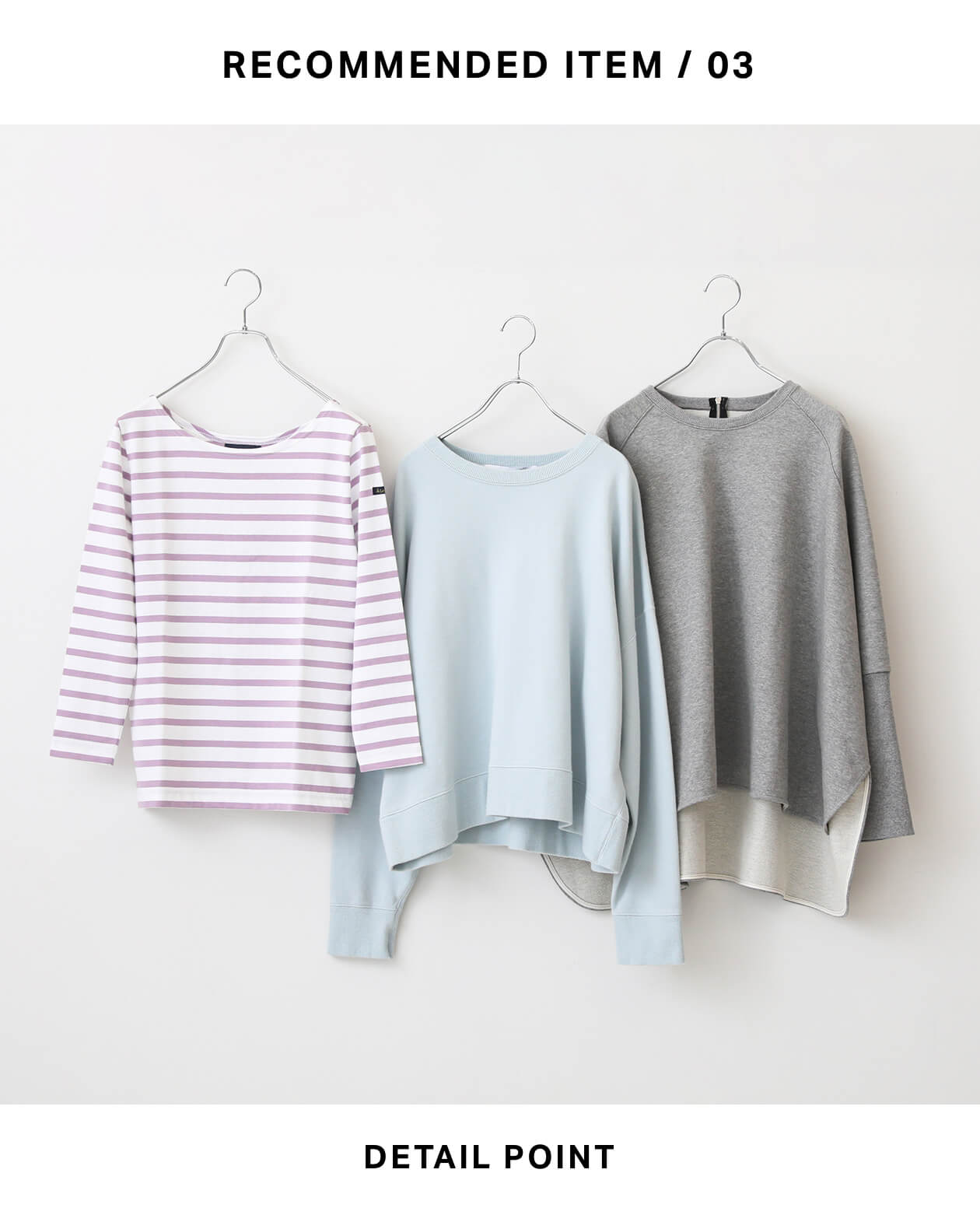 カジュアルコーデに欠かせないロンT&スウェットも、サマータイプのキレイ色を選べばどこか上品さの残るコーディネートに。一見シンプルだけど立体的なフォルムが魅力のデザインをチョイス。ボーダーなどのカジュアルな柄は、コントラストが弱いコンビネーションを選べば大人っぽく見えます。 - IENA【LE MINOR/ルミノア】 別注プルオーバー◆¥12,100(税込)