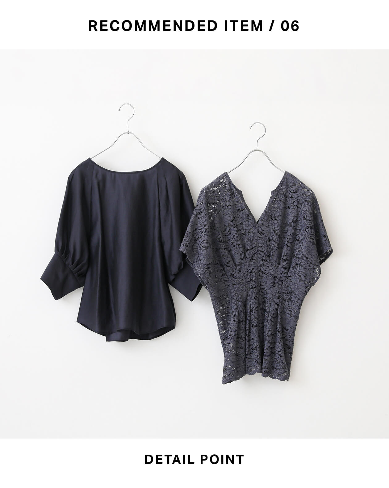 知的なネイビーはレースやボリュームスリーブなど、思い切って女性らしいディテールのものを選んで。サマータイプに合うネイビーは他のシーズンと比べて明るさがあるので、よりエレガントさや女性らしさが引き立ちます。甘さ引き立つVネックレースには、この秋トレンドのエコレザーやスウェードの辛口ボトムスが好相性。 - Spick and Spanライトクロス タックスリーブブラウス◆¥16,500(税込)