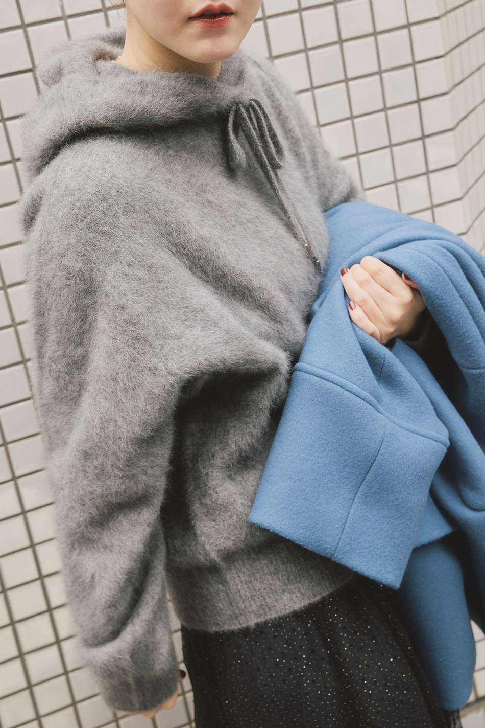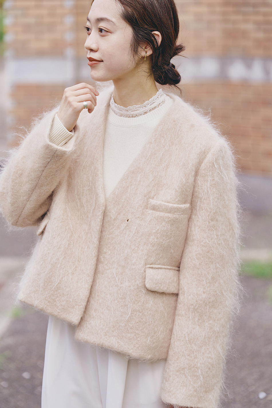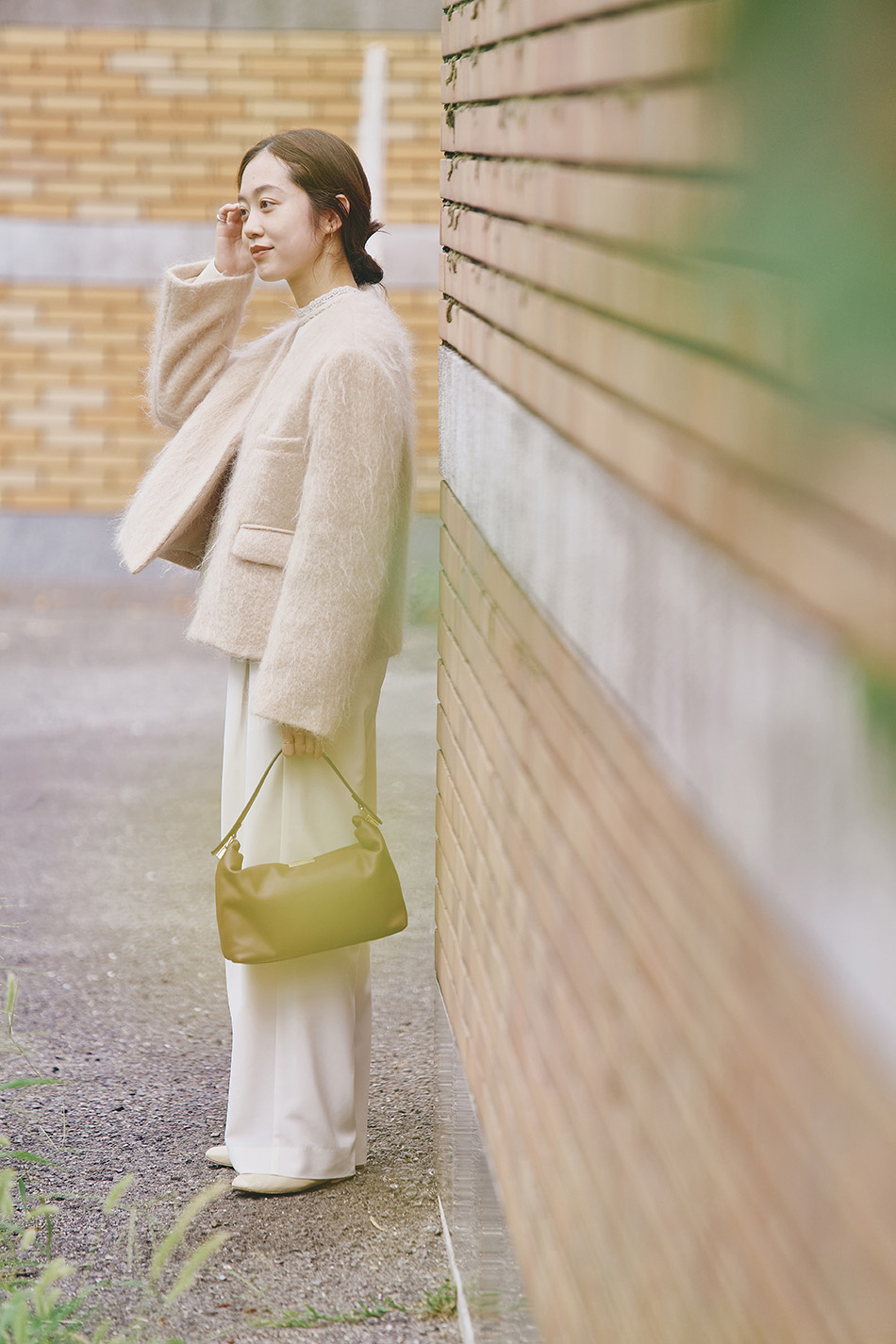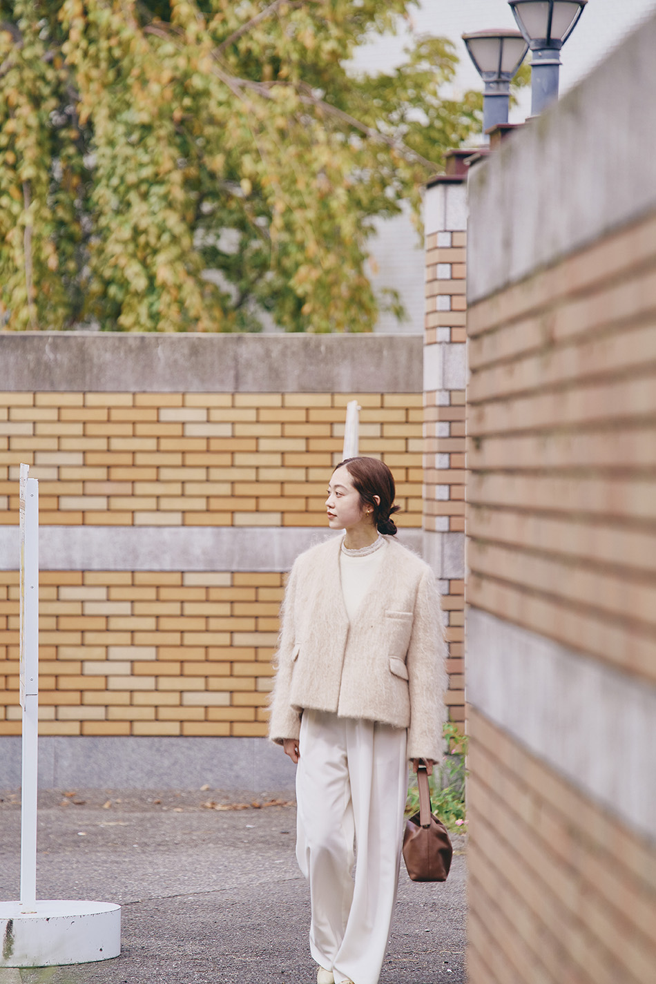 柔らかなピンクベージュのモヘヤシャギーコートを主役にした、冬こそ着たくなる淡色スタイリング。コートはふわふわとボリューム感のあるシルエットですが、コンパクトな丈感なので、ワイドパンツと合わせても相性ばっちり。ニットの中にレースブラウスを忍ばせて首元に華やかさをプラスしてみました。全体的に柔らかい色味のスタイリングは、ブラウンのバッグでメリハリをつけるのもこだわりポイントです。