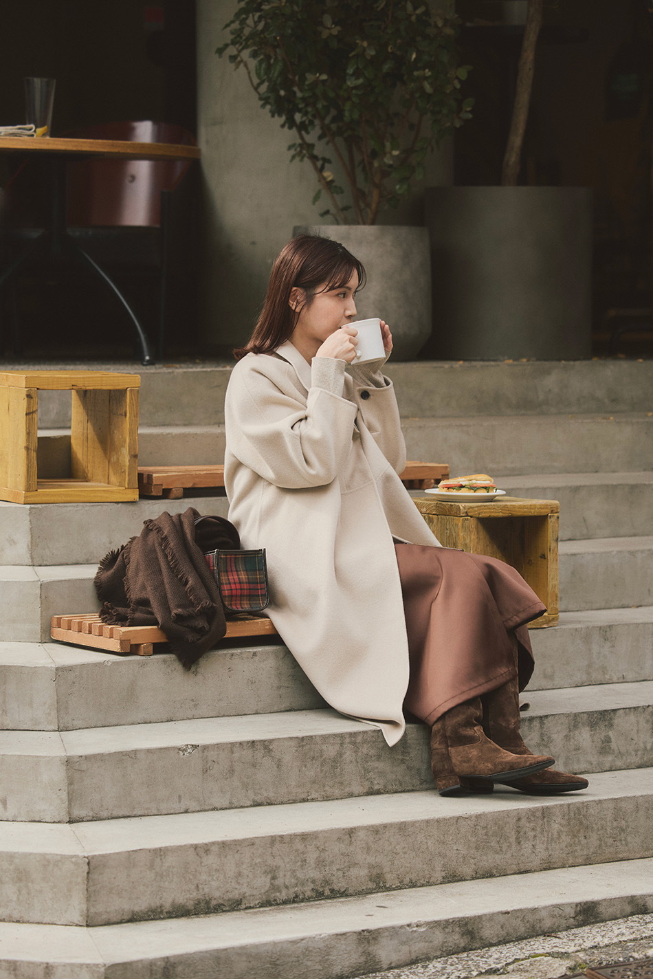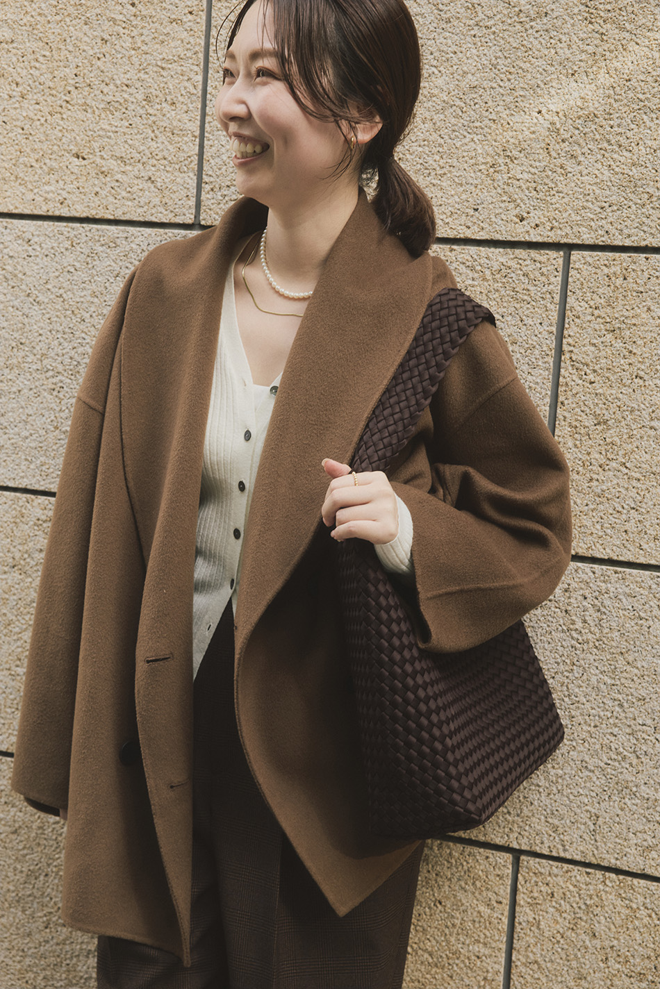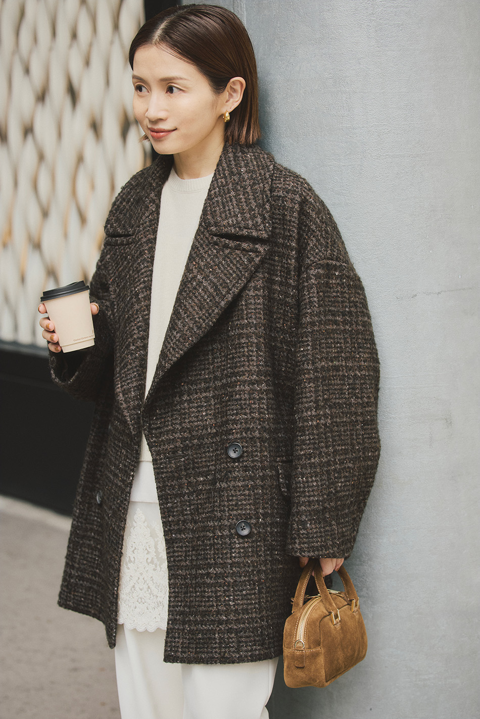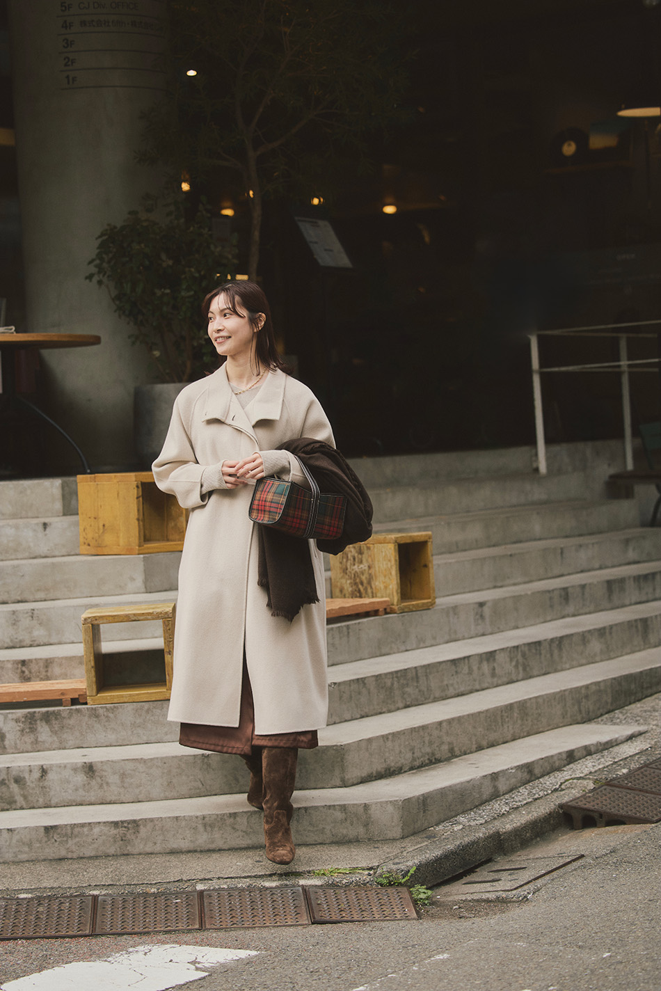 上質なコートが引き立つように、ベージュ×ブラウンでシンプルにコーディネート。襟を開けて顔周りがすっきり見えるようにアレンジしました。チェックのバッグでアクセントをプラスしています。