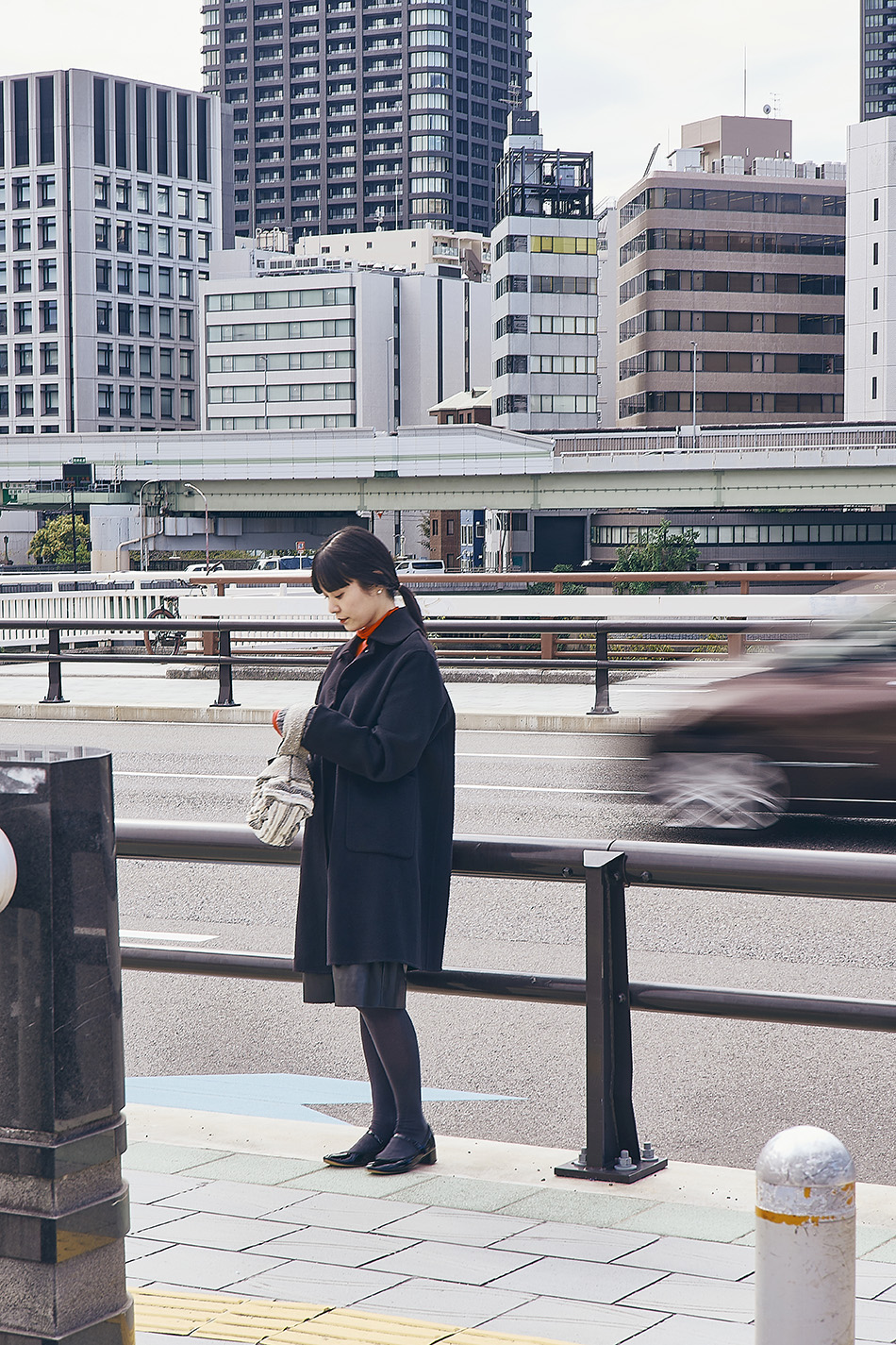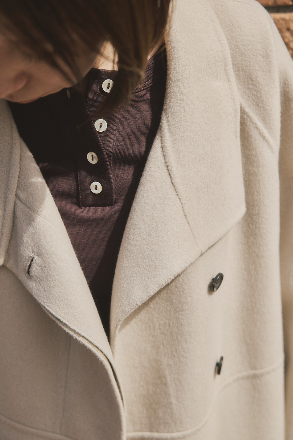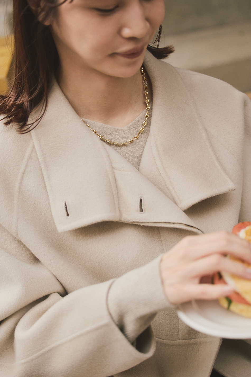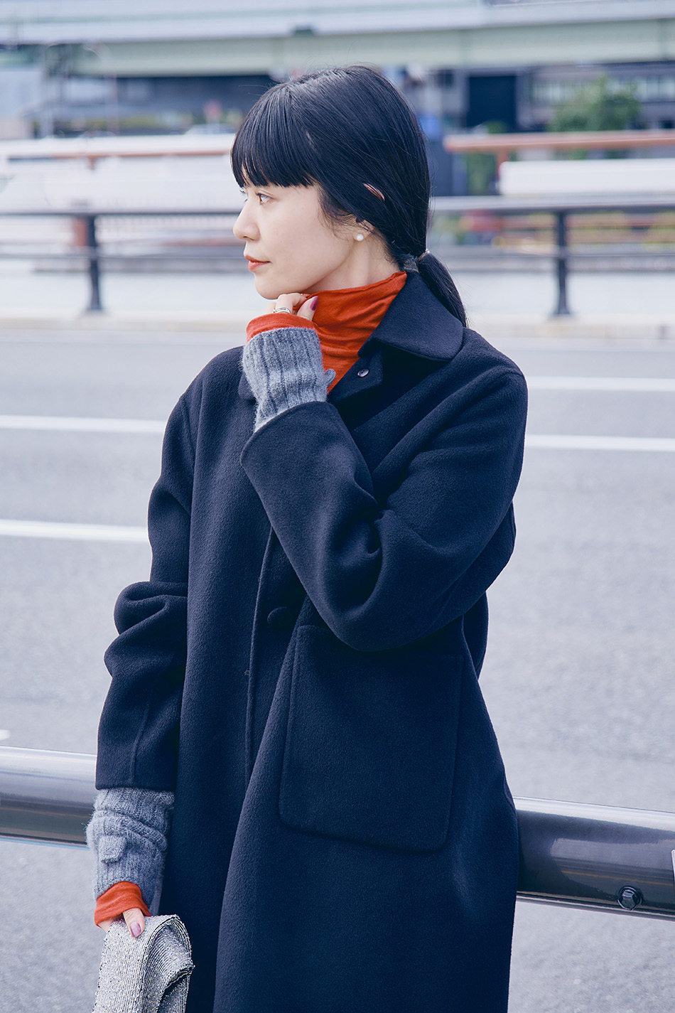 クラッシックな配色と上品な質感のコート。super160ならではの上質な質感のコートはそのままにさらっと羽織るだけで素敵なバランスにしてくれるコートです。丸い襟元とフェミニンな雰囲気のコートに赤とレザーをポイントにしてシックな印象にまとめてみました。気分に合わせて首元を変えてアレンジするのも楽しみです。