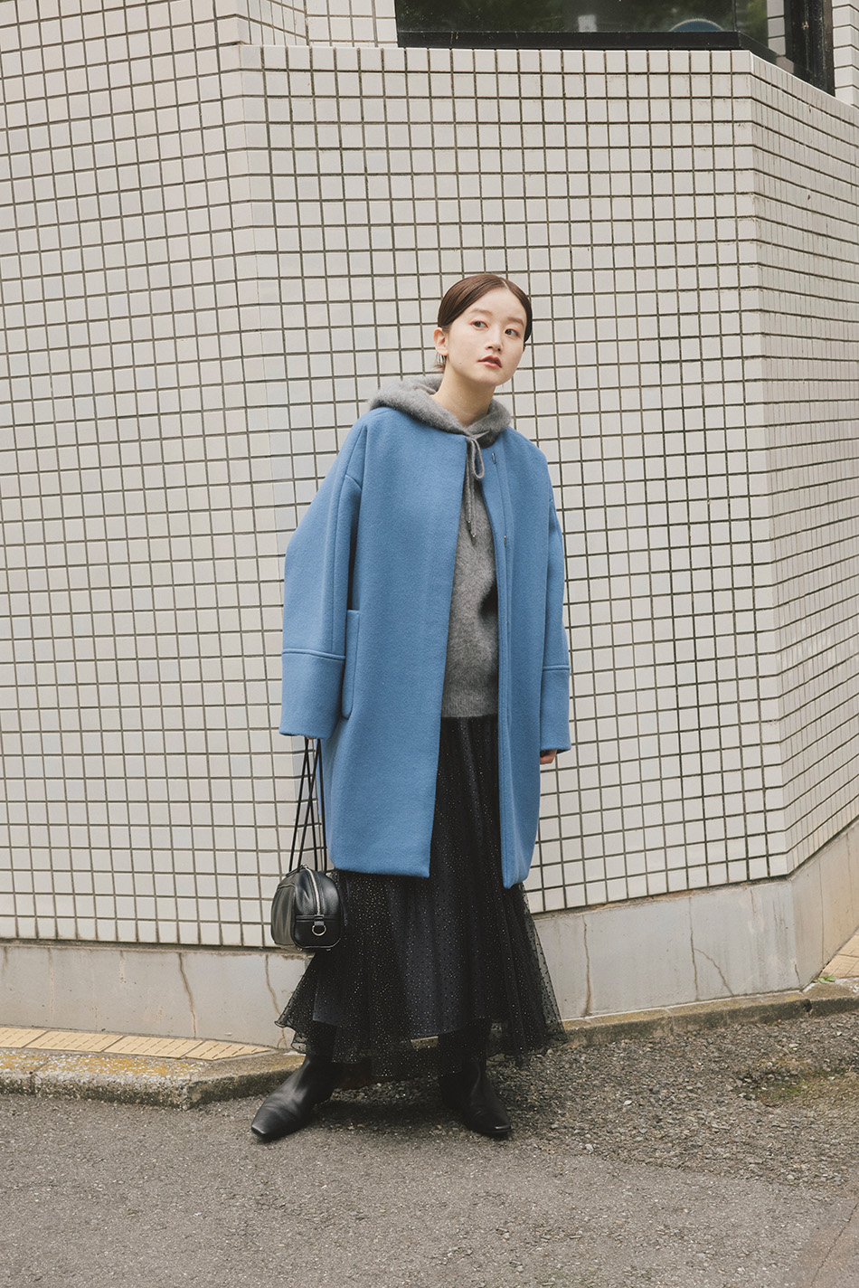 凛としたブルーに惹かれて。寒い日こそ、気分を上げてくれる色を選びました。透け感ラメのスカートと、ふわふわニットの組み合わせは、質感を重ねて、シンプルでも表情がある着こなしに。ブルーのコートが映える、お気に入りの冬のスタイリングです。