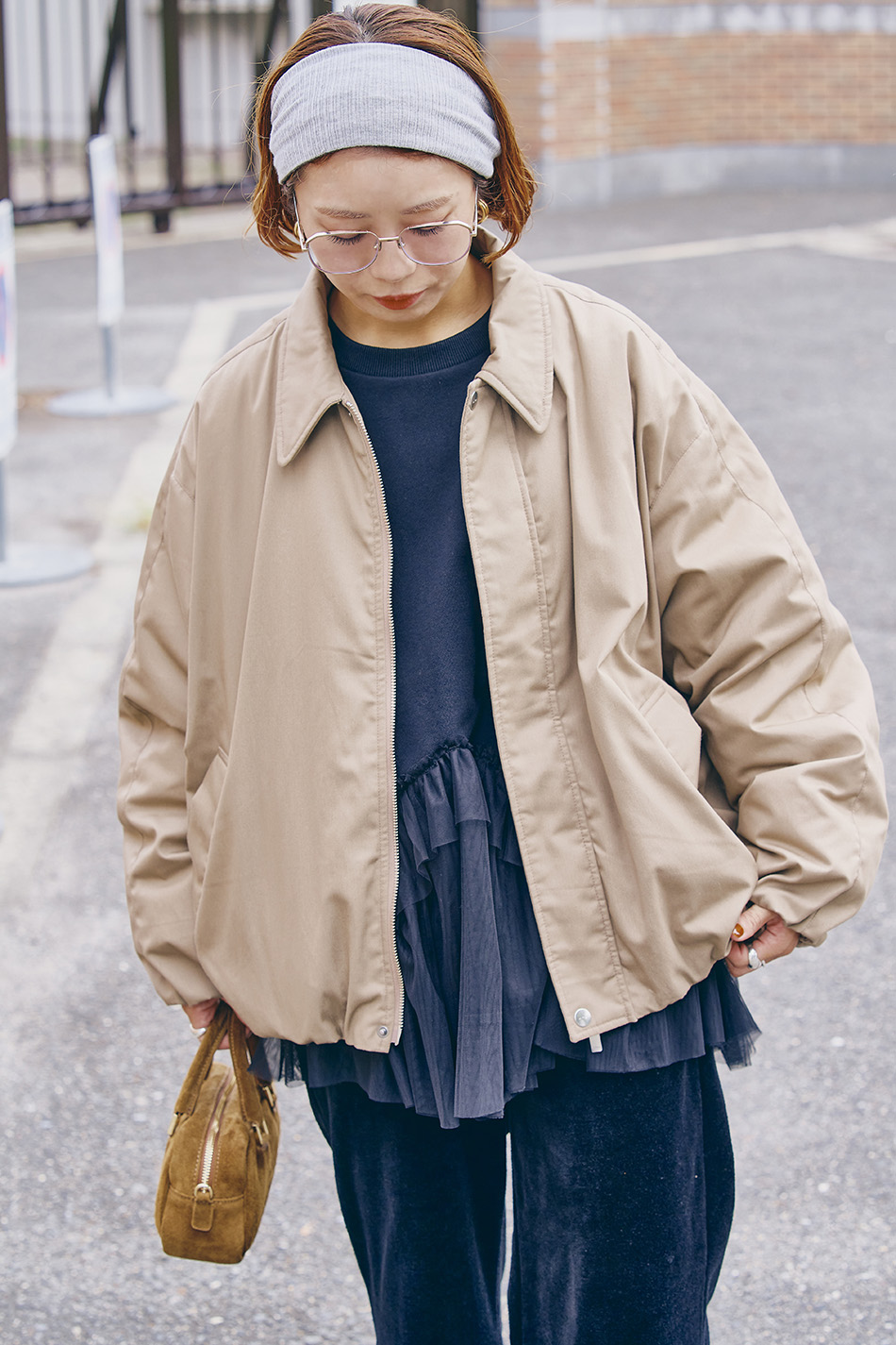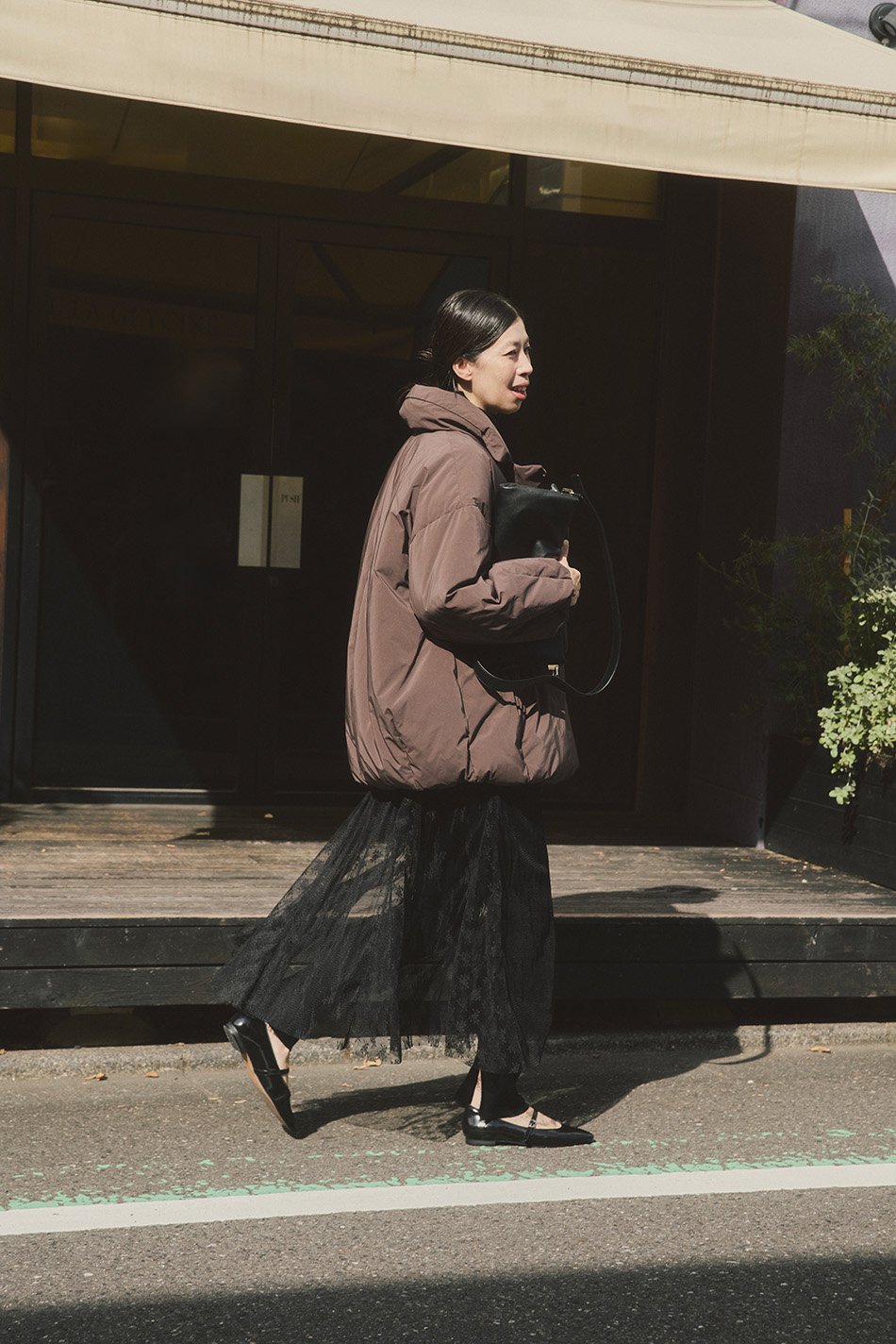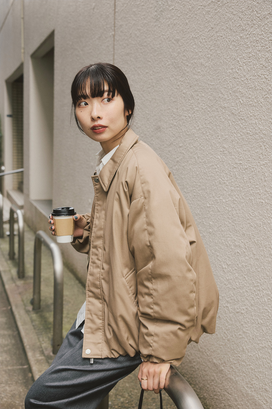 今季トライしてみたかったベージュ×ピンクのカラーリング。上品なベージュカラーがフェミニンスタイルにもマニッシュスタイルにも程よく抜け感を出してくれる万能ダウン。早い時期から着れて身幅も比較的ゆったりしているので、アルパカ素材のフワフワキャミソールに白シャツでレイヤード。中物は軽やかにスタイリングしました。