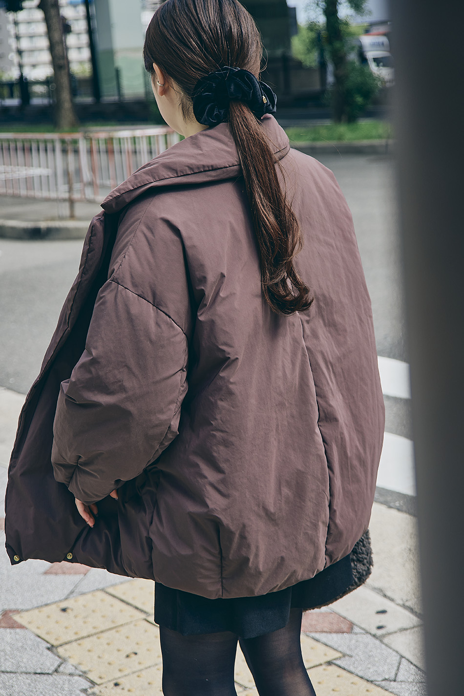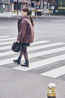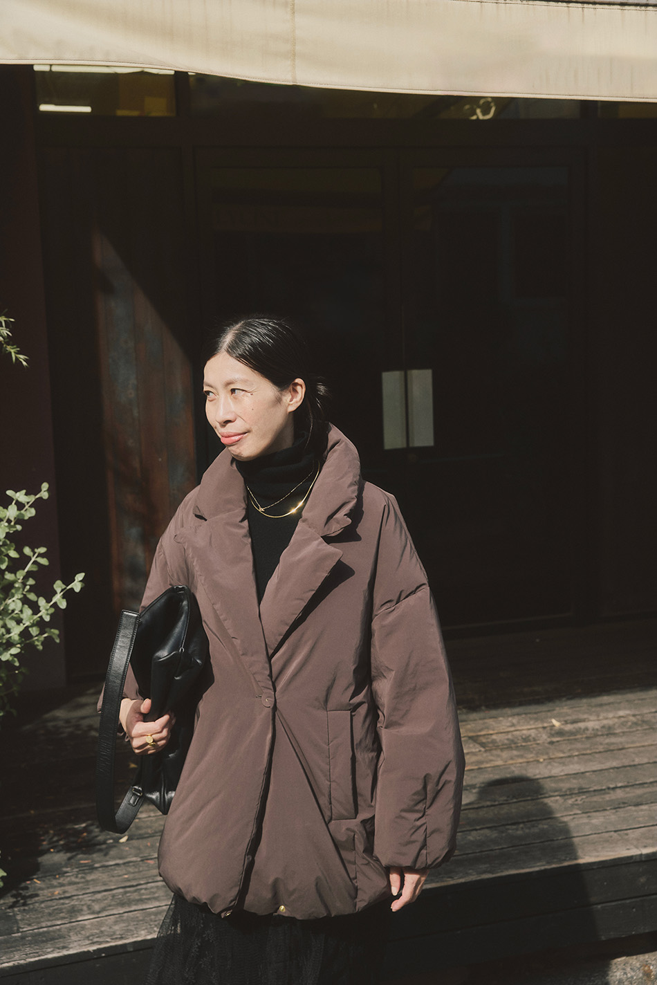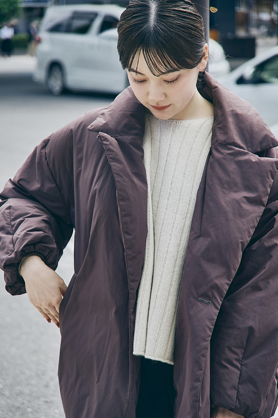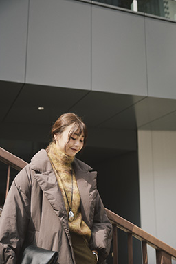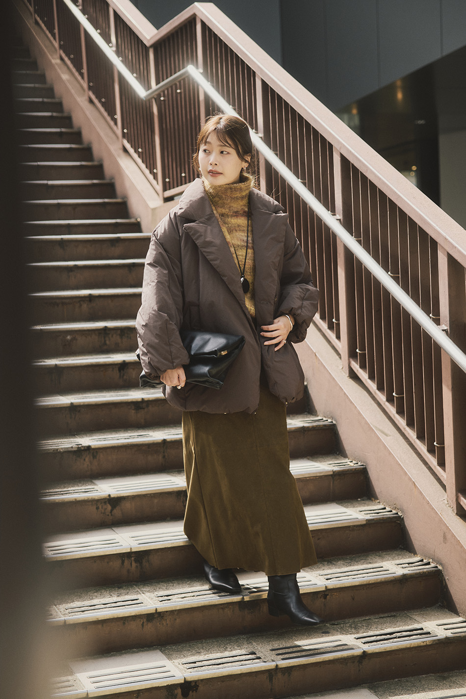 柔らかい素材感と緩やかなコクーンシルエットが素敵なダウンに、今年気になるトレンドのブラウンのワントーンスタイリングにまとめました。ダウンは撥水機能を持ち合わせており、天候が変わりやすいこれからの時期にもぴったりのアイテム。イエローのモヘアニットを差し色に、全体が重たく見えないバランスに。足元はロングブーツ合わせでトレンド感もプラスしながら上品に仕上げました。