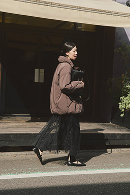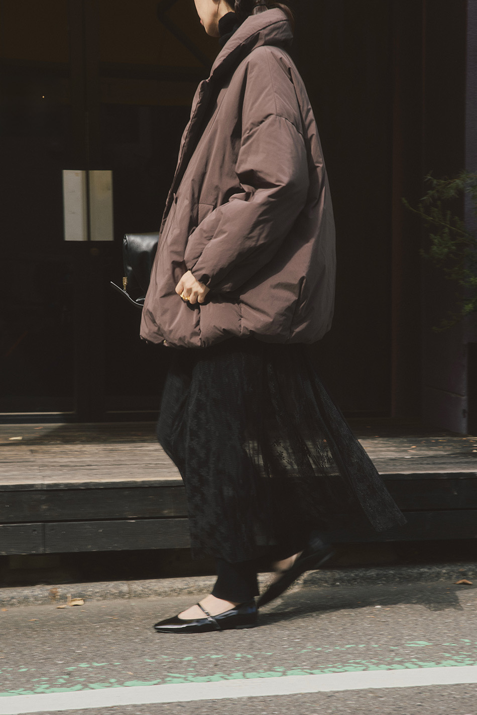 コクーンの曲線きれいなダウンコートに、今年の気分にピッタリのレーススカート×レギンスを合わせました。ダウンのボリューム感を抜け感をだしすっきみせてくれるスタイルとなります。レザー小物でクラシカル感をプラスした、自分には欠かせない気分が上がるレディームードスタイルです。
