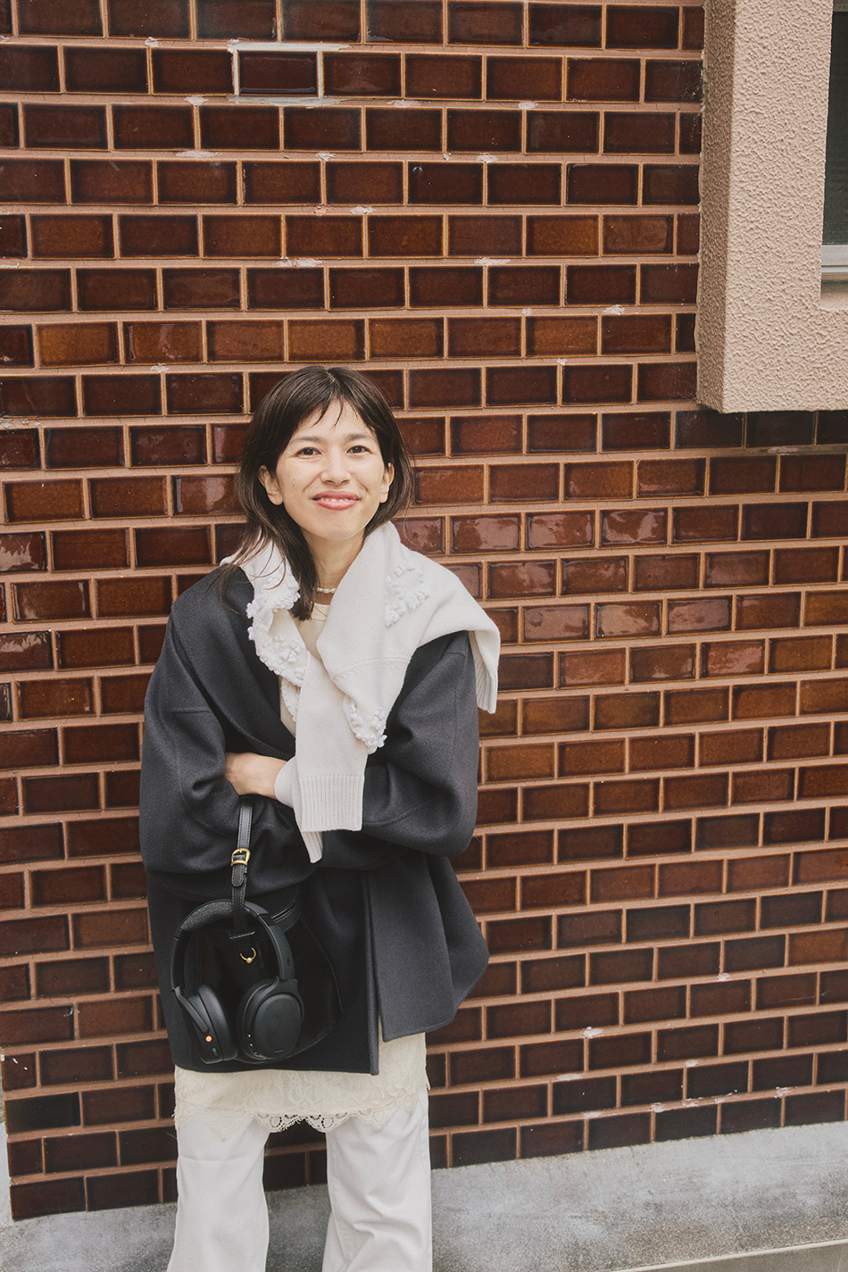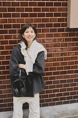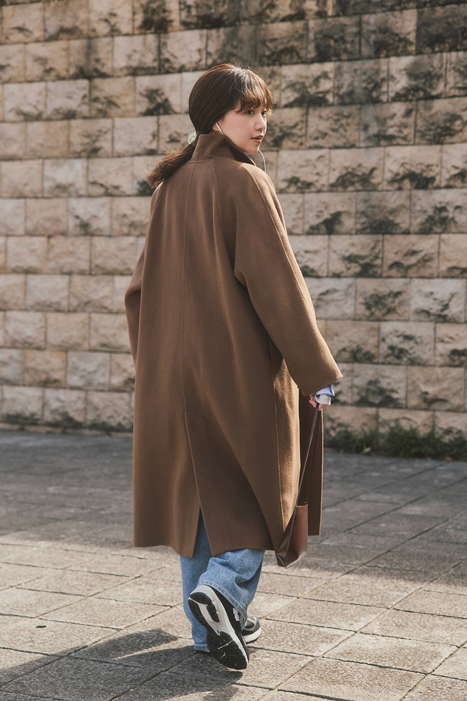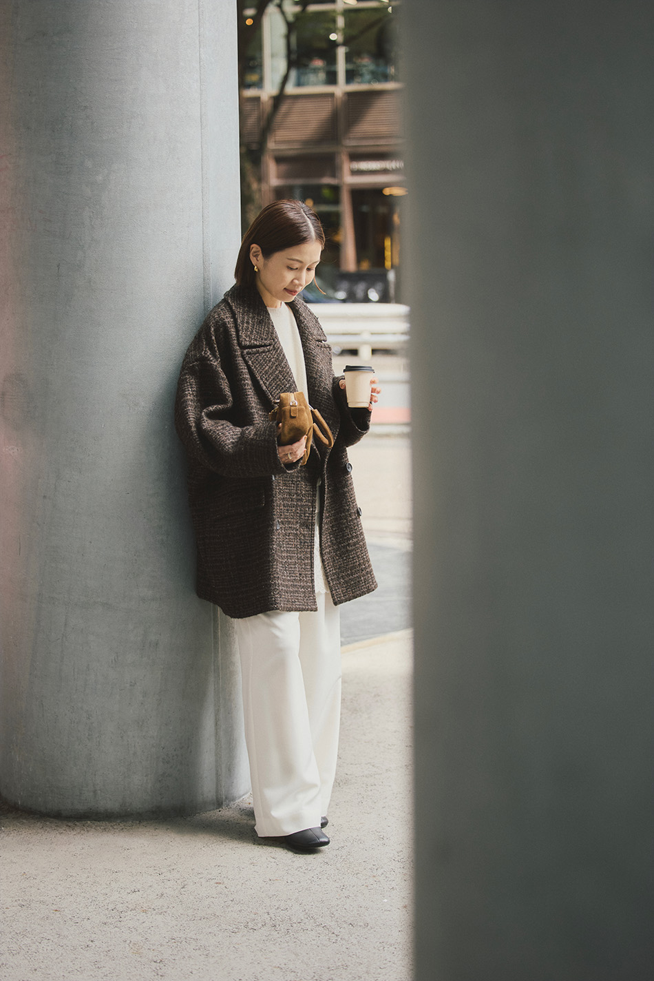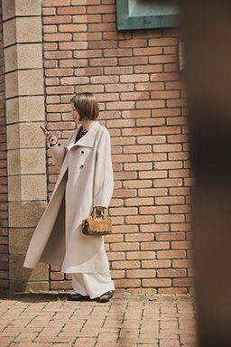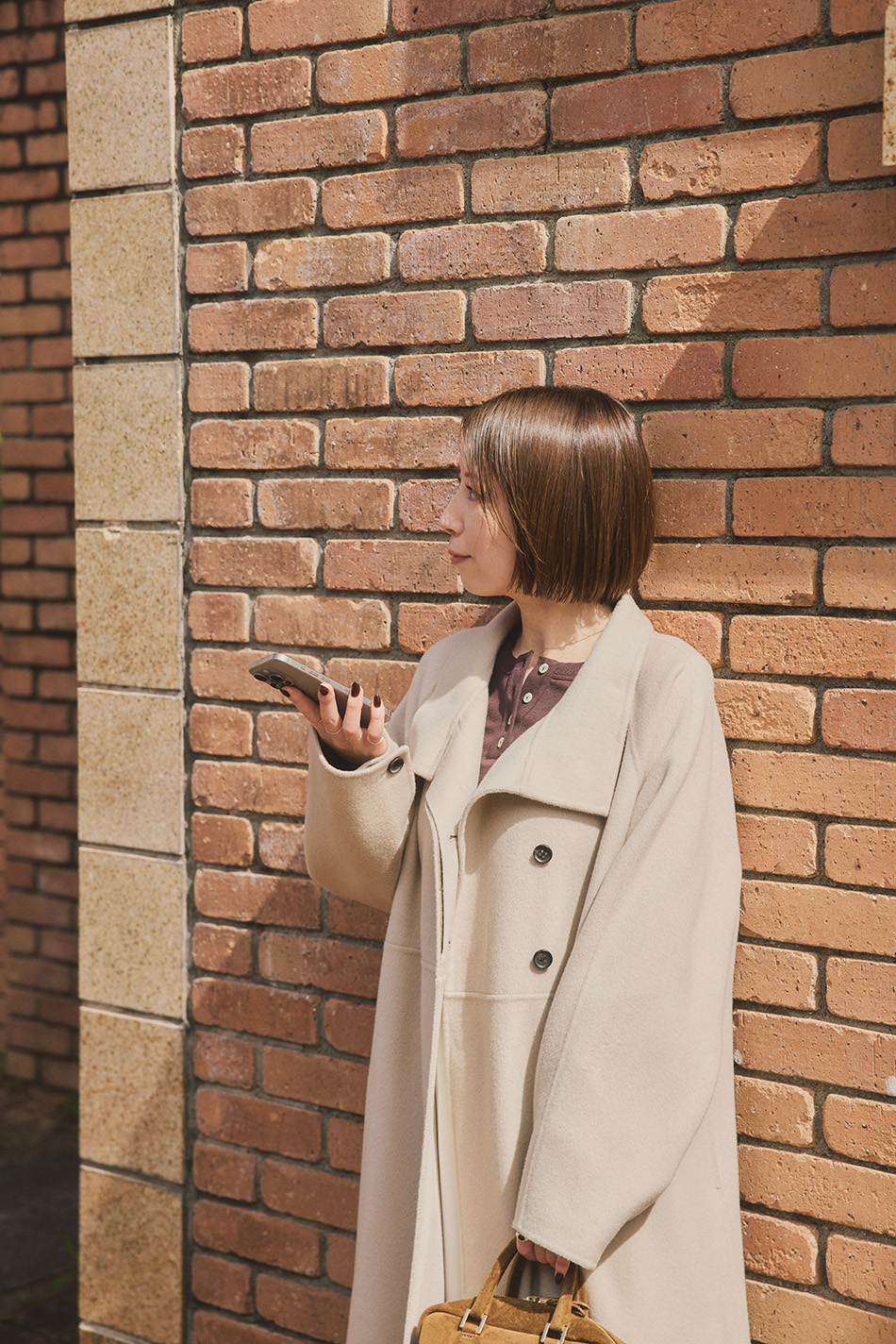 今年はロングコートを取り入れたい気分。IENA定番のSuper160シリーズからスタンドコートを選びました。色は小柄な身長でも軽やかに着られるベージュに。全体的に明るくなるようボトムスも白にしてワントーンでまとめました。トップスは今年らしいブラウンのカットソーで抜け感や自分らしさが出るように。全体のバランスがすっきりコンパクトに見えるように小さめのバッグを合わせました。