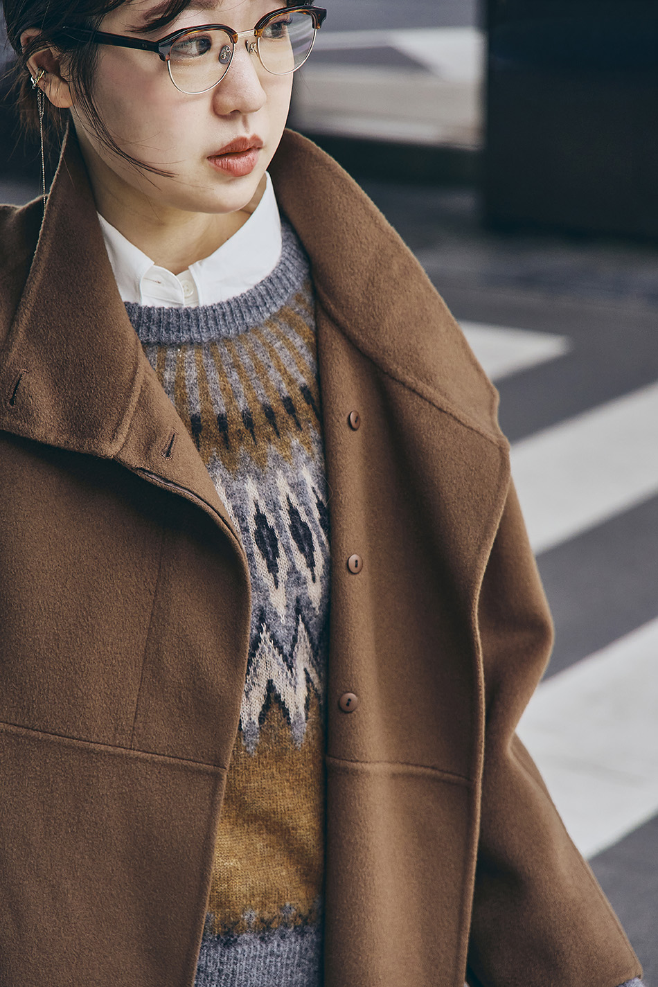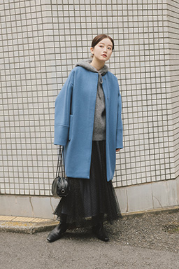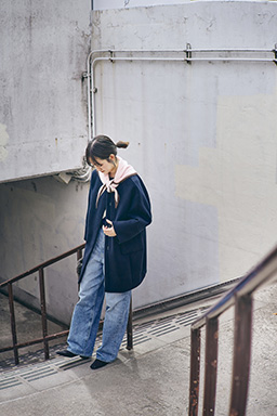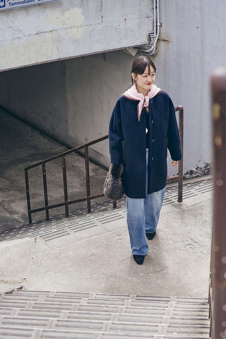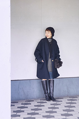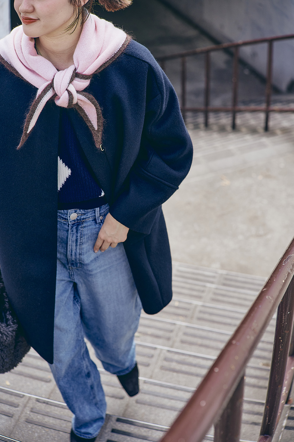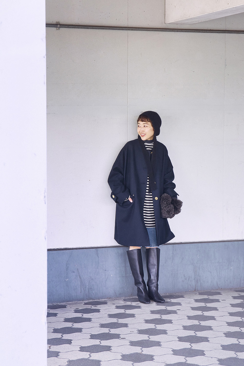 ノーカラーですっきりとしたコートなので、存在感のあるニットベストや、ストール、バッグなどを合わせてコートのベーシックさが引き立つコーディネートにしました。ネイビー×ブルーデニムでワントーンを意識したのがポイントです。合わせるアイテムで雰囲気がガラッと変えられるコートで、この冬重宝しそうです。
