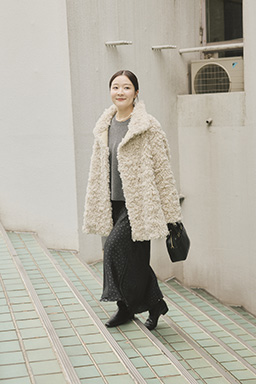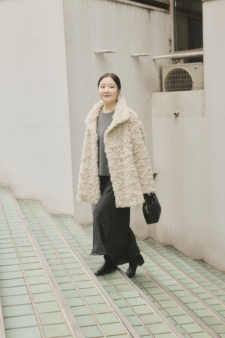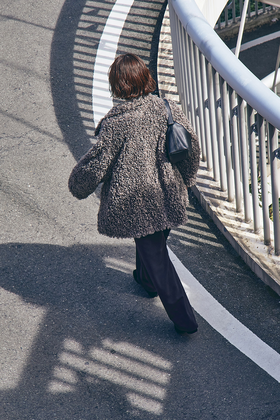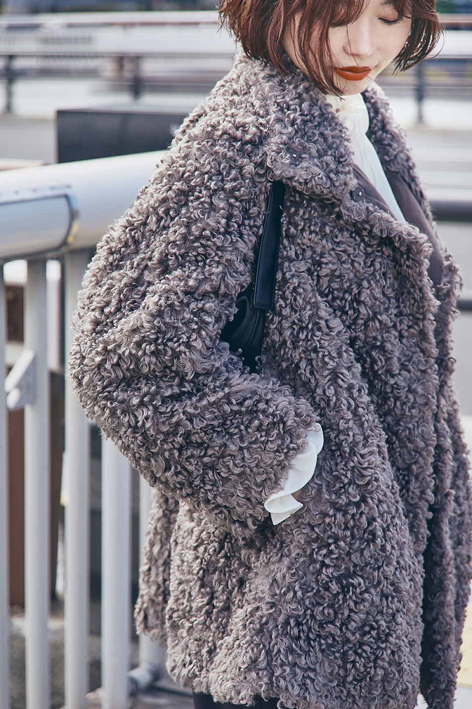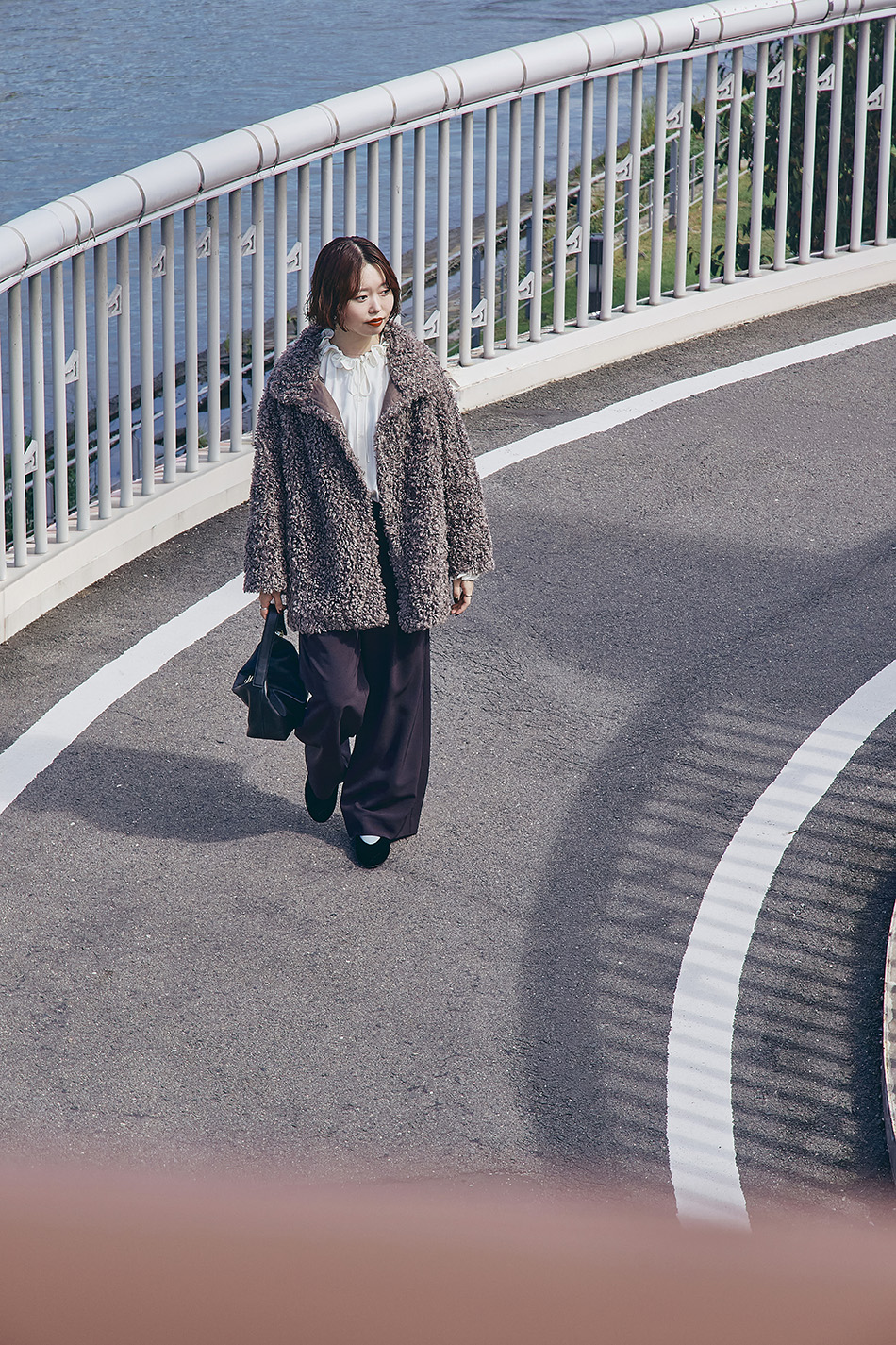 ふんわりとした素材感を楽しめるボアコート。直線的な縦のラインと大きめの襟が凛とした印象に。ミドル丈なので見た目も着用感も軽やかで、様々なコーディネートを楽しめるのもうれしいポイントです。ぷりっと可愛げのあるフリルブラウスに、ワイドパンツとブラックの小物で甘さのバランスをとりました。グレー×ブラウンの今年らしいカラーの組み合わせもお気に入りです。