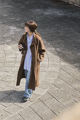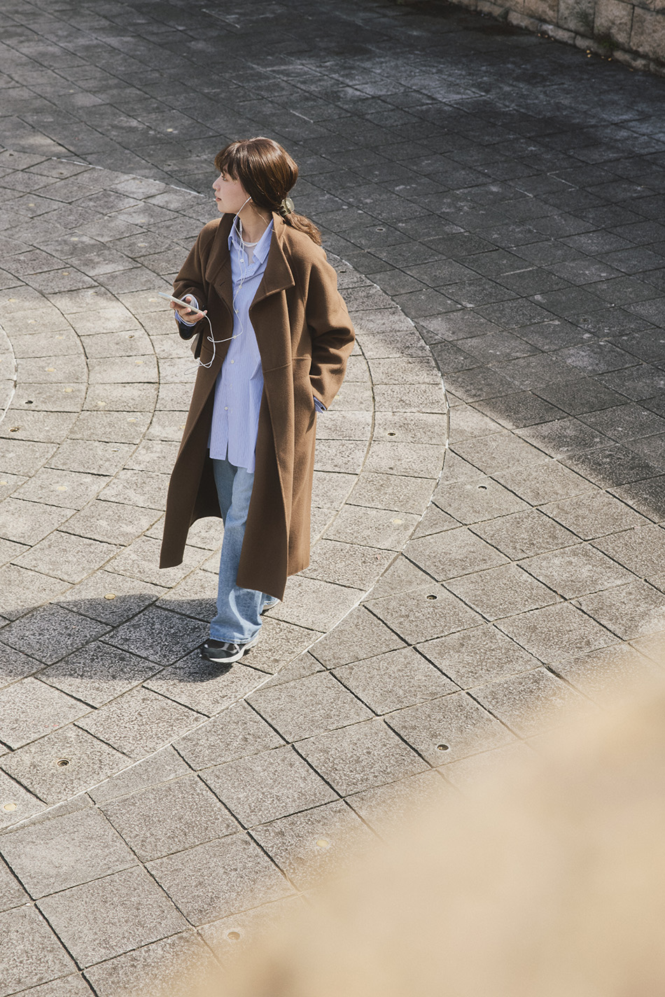 ブラウン×ブルーの上品カラーコントラスト。温かみのあるブラウンコートに、サックスブルーのシャツをレイヤードすることで、重たくなりがちな冬コーデに軽やかさをプラスしてくれます。ゆるめのシルエットを重ねて、足元はスニーカーを。きれいめとカジュアルのバランスがちょうどいい今の気分です。
