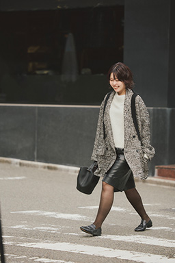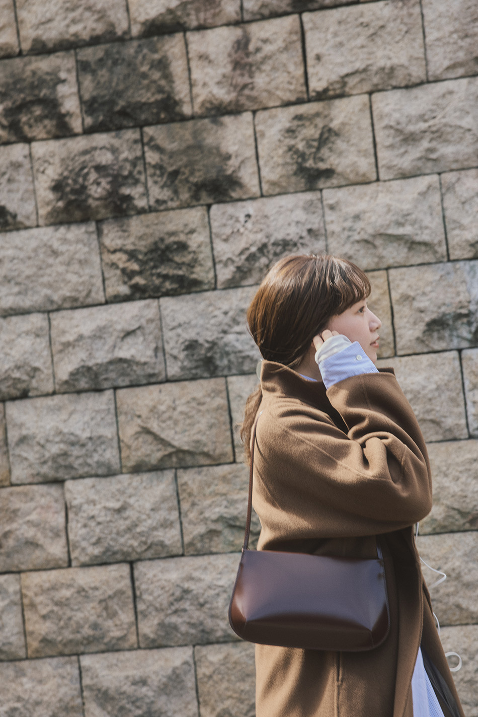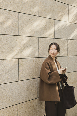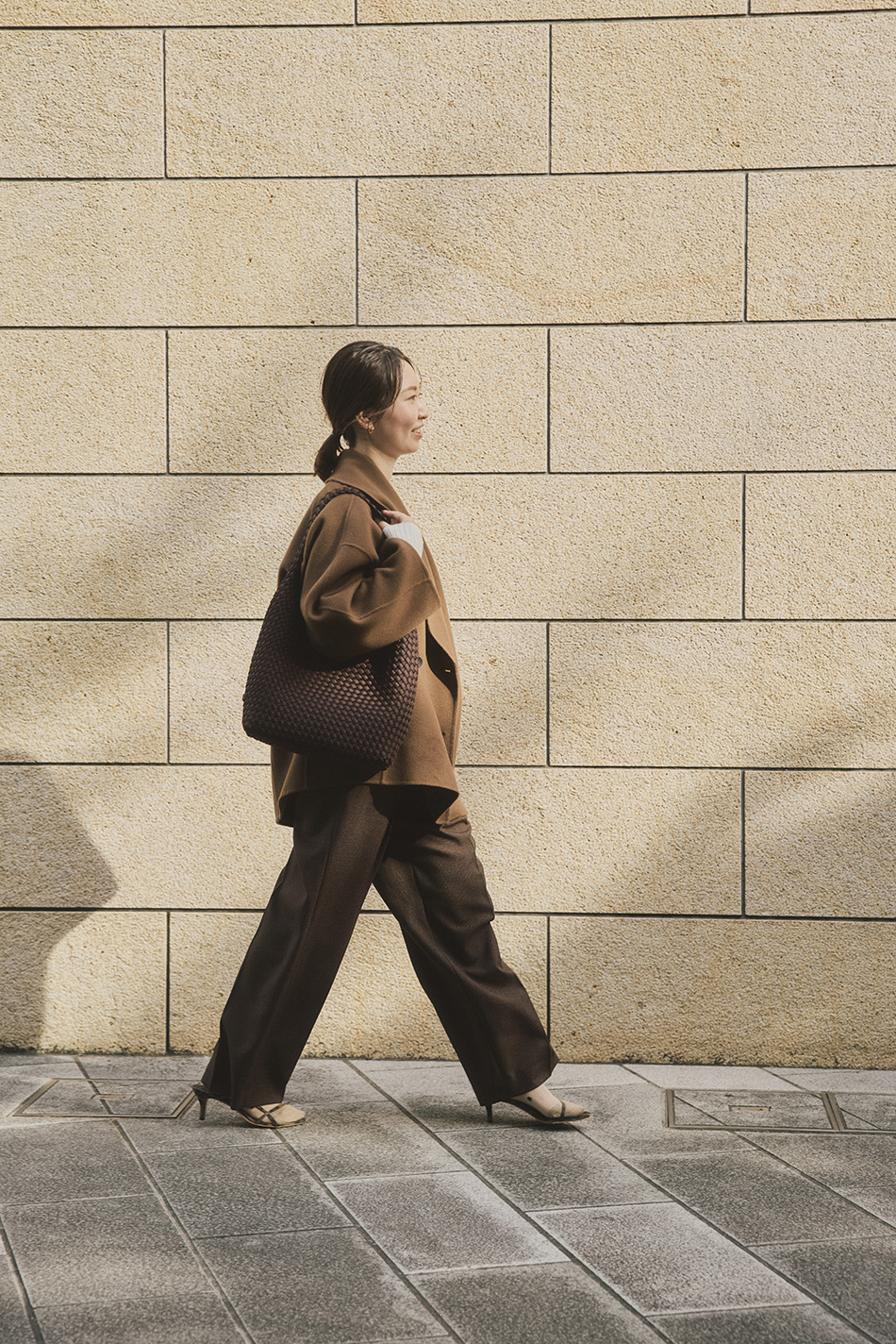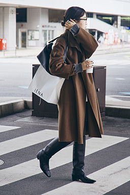 今旬なブラウンを主役にスタイリングを組みました。シンプルながらトレンド感のあるニットに、着るだけで気分の上がるスタンドコートを着て、カフェやショッピングをする私の休日をイメージしました。控えめに感じられるグレーも、温かみのあるブラウンとレザーを合わせ、洗練させた印象に。