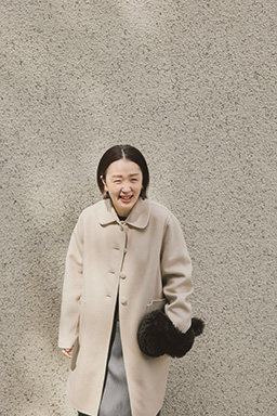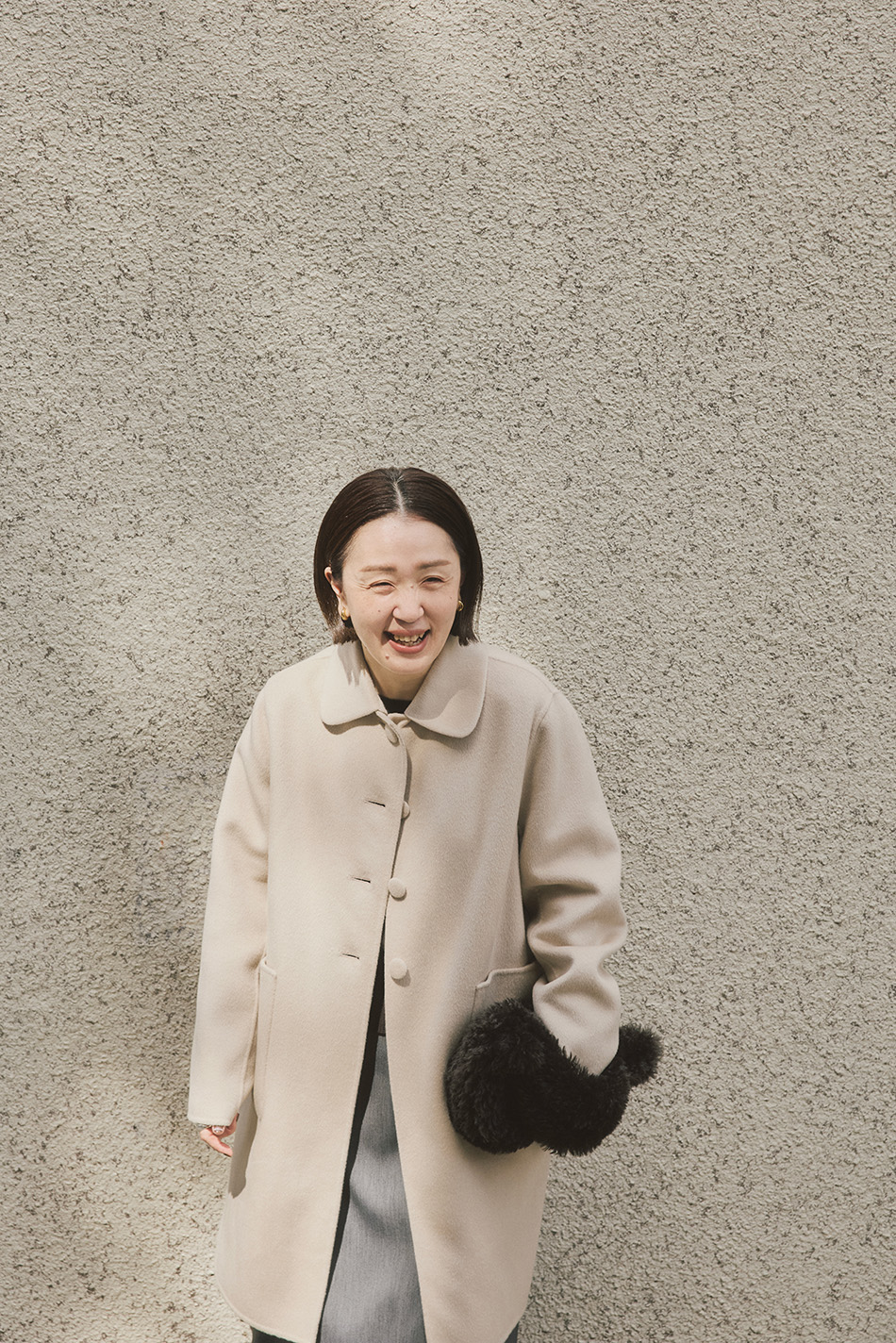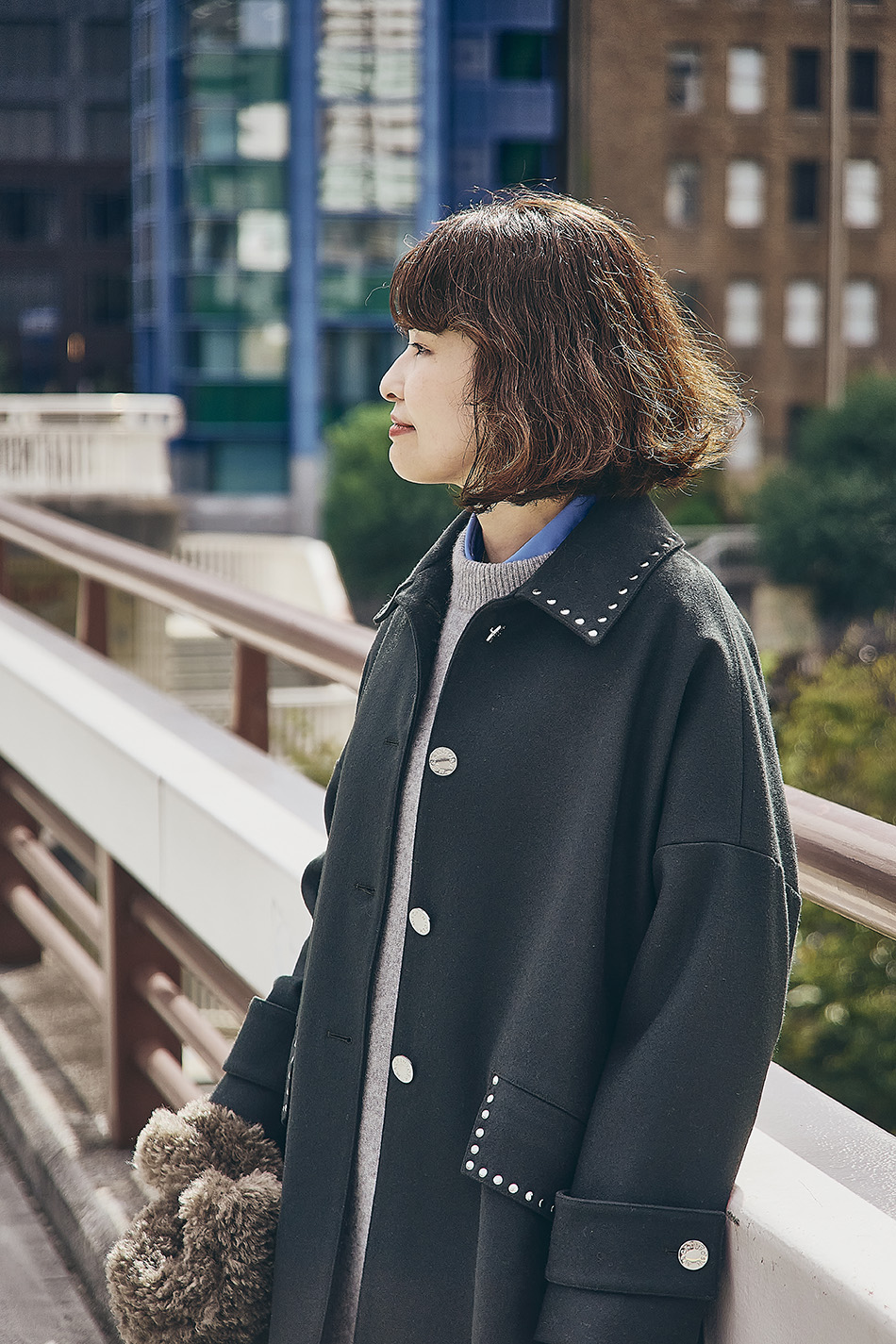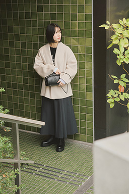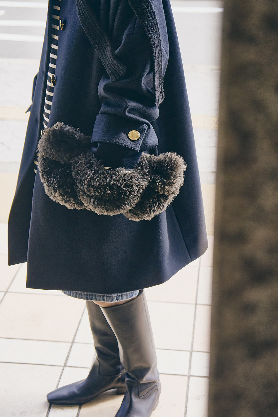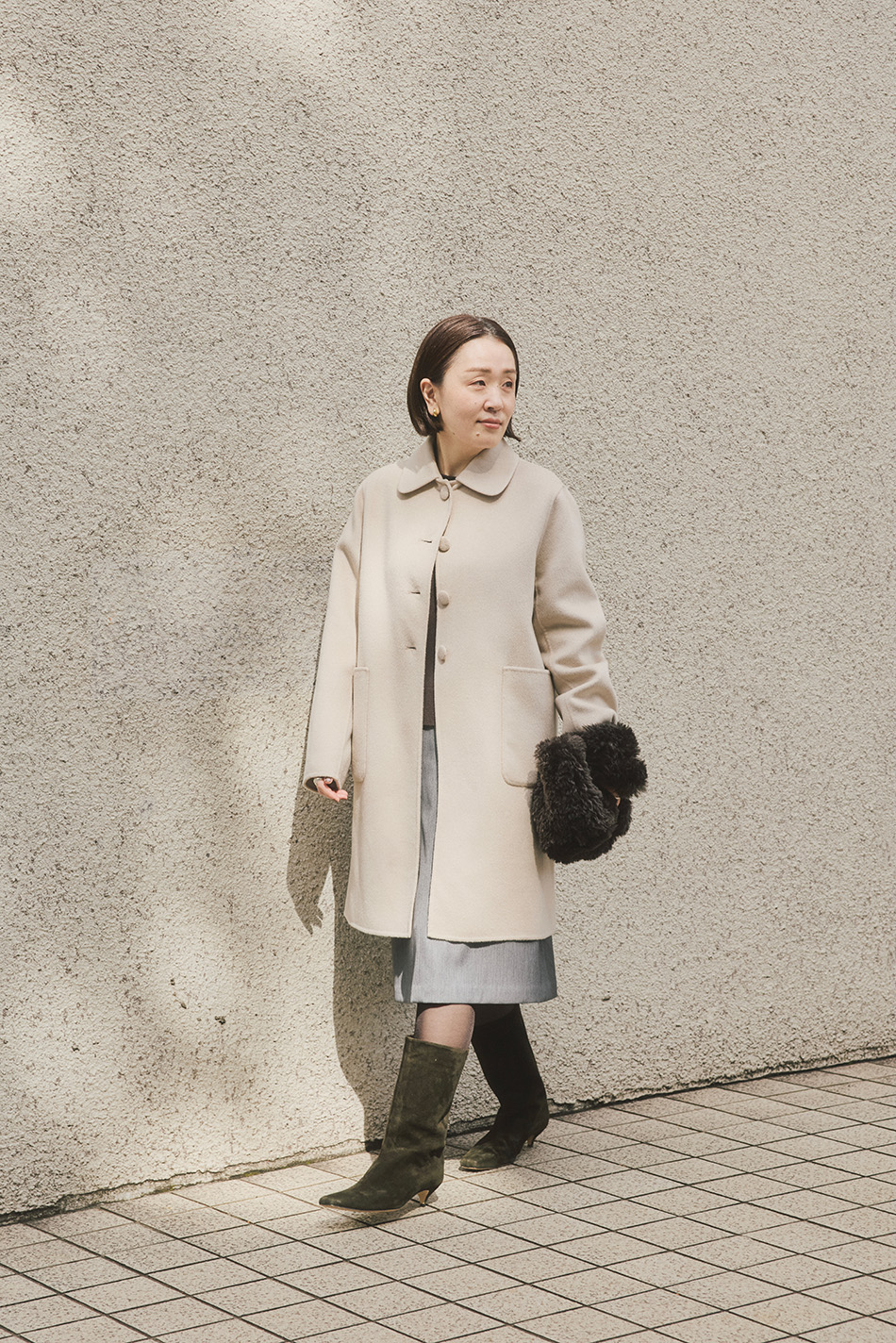 コートワンピースのような1枚で着映えするデザインのコートは、襟が取り外し可能で同色と黒の2種類あり、その日の気分で変えられます。今回は同色の襟を付けて、クラシカルで上品さのある雰囲気に今年らしいバランスでミドル丈のスカートをコーディネートしました。コートを主役に、他のアイテムは深みのあるグレートーンでメリハリを。ふわふわのファーバッグで遊び心のある小物を合わせたのもポイントです。