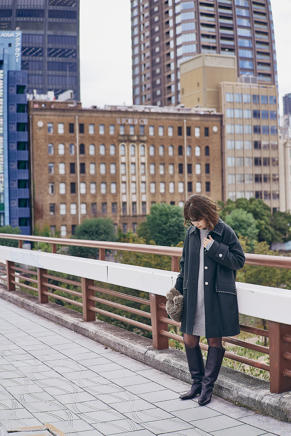MACKINTOSHで人気のHUNBIEにスタッズをポイントにしたモードな印象のコート。羽織るだけでスタイリングが決まる主役になるコートなので、インナーはニットワンピースでシンプルなスタイリングにしてます。冬になると気になるモコモコのファーバックとロングブーツをプラスしてカジュアルにしてます。