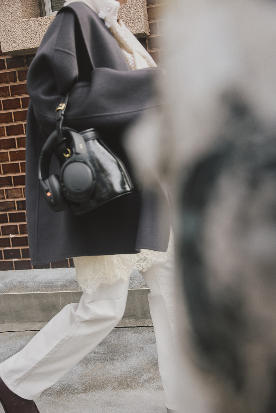 フォルムとチェック柄が印象的で羽織るだけでサマになるコート。冬になると着たくなるホワイトのワントーンコーデに合わせ、コートを主役にしたスタイリングを組みました。今年注目のレースを取り入れて華やかさとトレンド感をプラス。微光沢素材のパンツ、スウェードのバッグを合わせて、冬らしさもありつつ重く見えない素材の掛け合わせを意識しました。