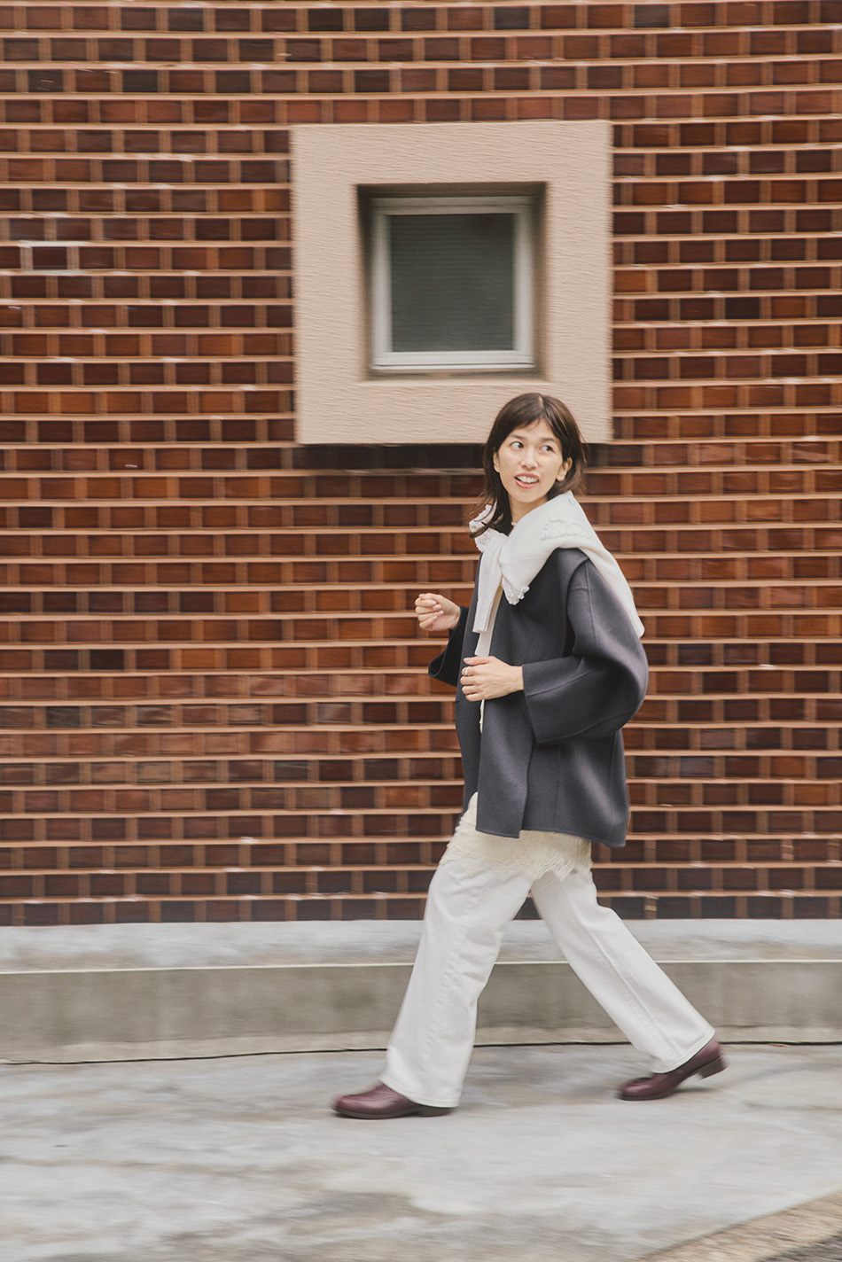 カジュアルなデニムに、上質な素材を組み合わせることでシックに仕上げました。グレーのショールカラーコートにプラスしたのは、カシミヤのニットブランド「BARRIE」のカーディガン。ストールがわりにふんわりと首に巻いて、抜け感のあるスタイリングに。グレー+ホワイトの色合わせで冬のムードを作りたい気分です。