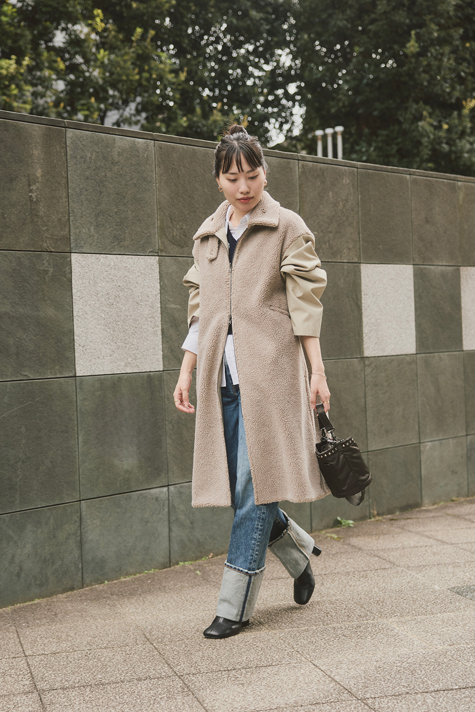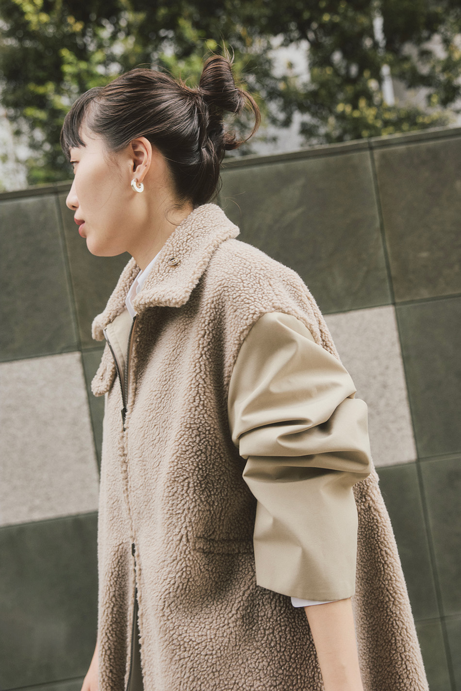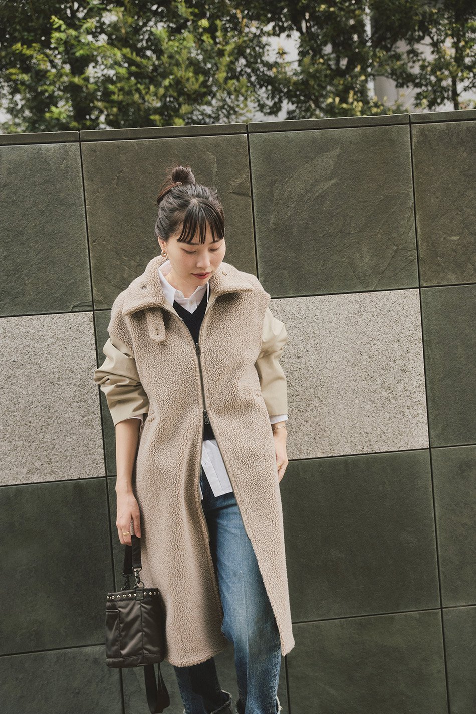 袖を通すだけで様になるリバーシブル仕様のコート。ボアとタフタ生地の異素材から生まれる微配色がモードで洗練された印象で、今年らしい顔に。スモーキーなベージュには白シャツとトレンドデニムでベーシックなアイテムでクリーンにまとめつつ、重ねたネイビーのベストを襟元や裾からZIPの開きで色が見えるバランスで調整しています。カーキに別注したナイロンBAGを持って、デイリーな抜け感をプラスしてみました。