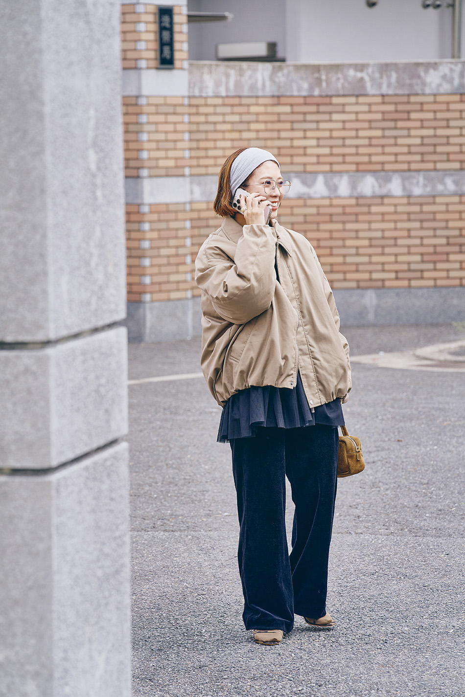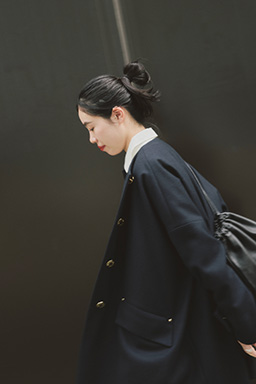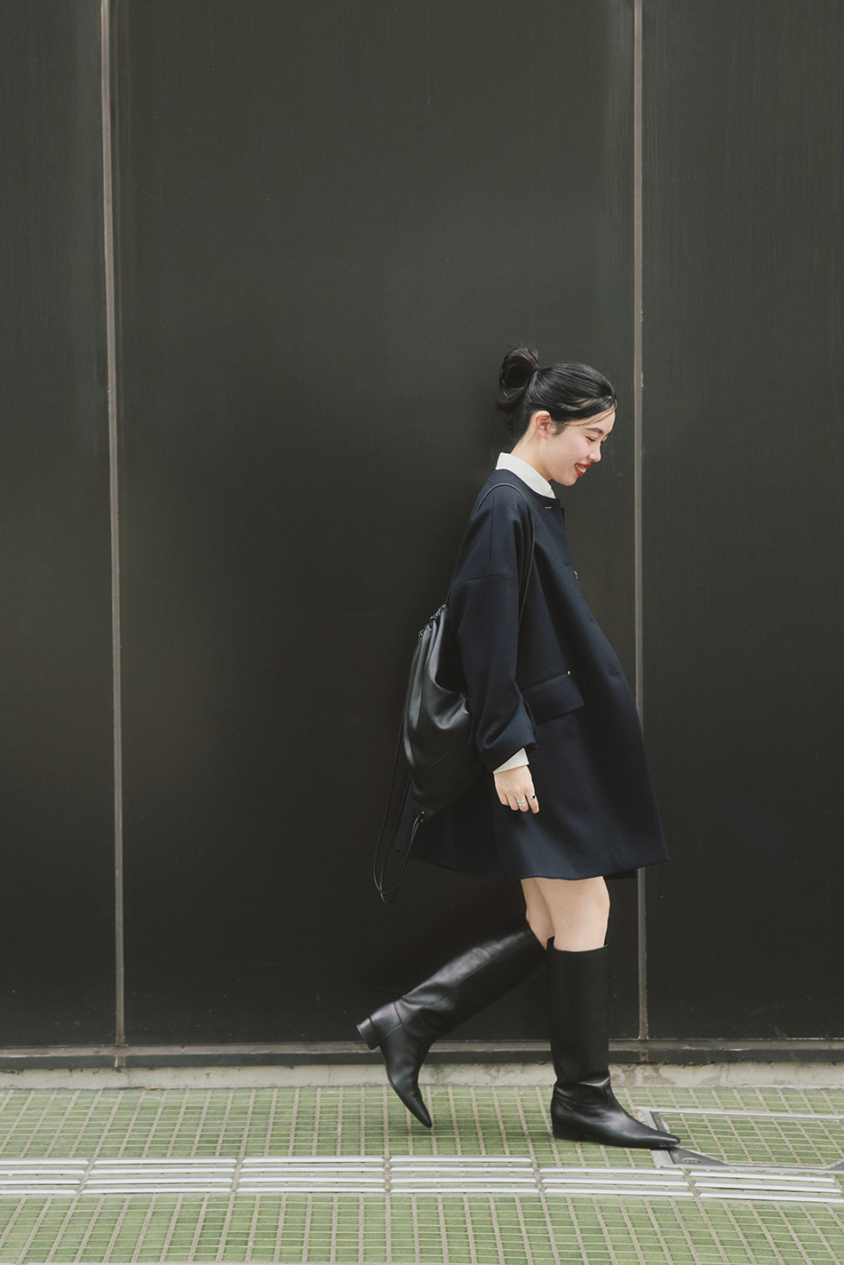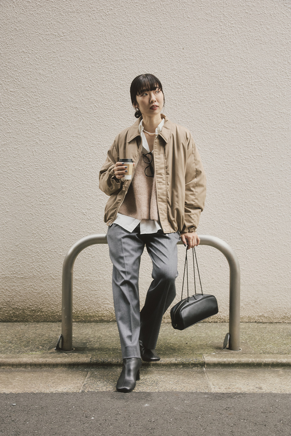 袖を通すだけで様になるリバーシブル仕様のコート。ボアとタフタ生地の異素材から生まれる微配色がモードで洗練された印象で、今年らしい顔に。スモーキーなベージュには白シャツとトレンドデニムでベーシックなアイテムでクリーンにまとめつつ、重ねたネイビーのベストを襟元や裾からZIPの開きで色が見えるバランスで調整しています。カーキに別注したナイロンBAGを持って、デイリーな抜け感をプラスしてみました。