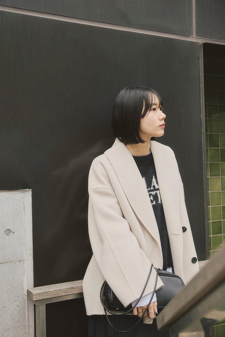 大きめなショールカラーと、後ろ下がりなシルエットのフェミニンさが素敵なハーフコート。上品な素材感とコクーンシルエットに、私らしくカジュアルさをプラス。ロゴニットやサイドゴアブーツを合わせ、甘辛さと、きめすぎないリラックスしたコーディネートにしてみました。カラーはシックなツートーンでまとめて、ショールカラーが主役になるようなバランスに。