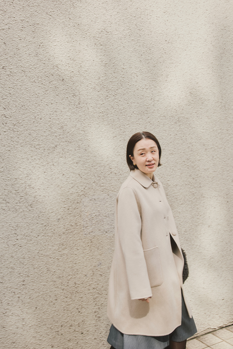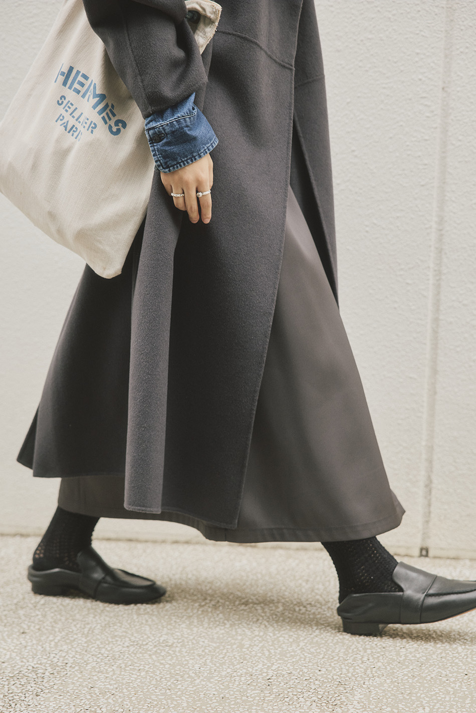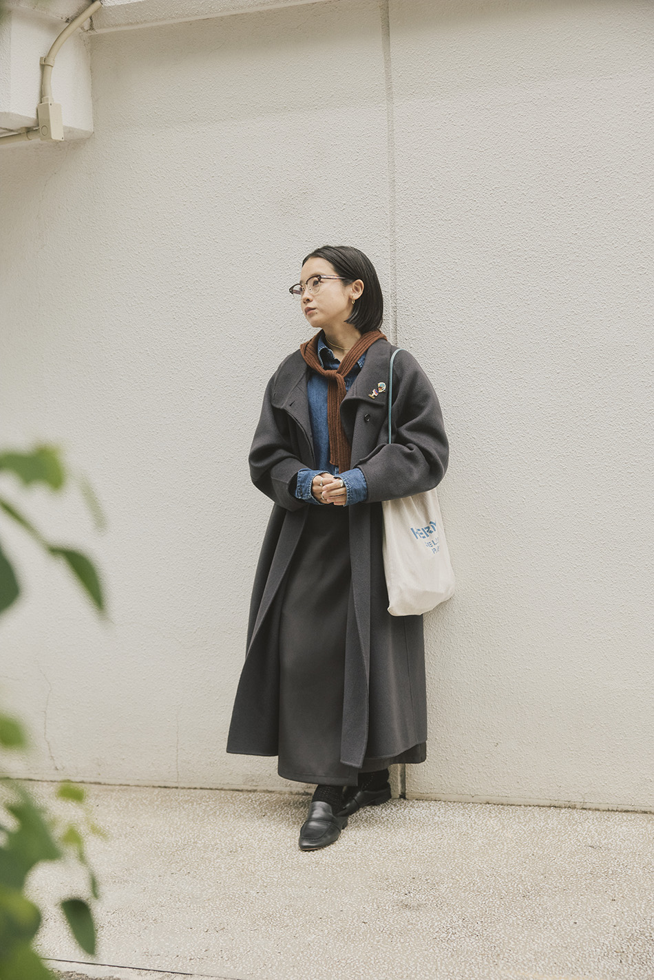 ロング丈のコートにミドル丈のスカートを合わせて、丈感のバランスを楽しむスタイリングにしました。デニム、コットンバッグ、ピンバッジ、メガネなど、、私の好きなカジュアルアイテムをいつもより少し多めに取り入れても、上品にまとめてくれるところが、このコートの好きなポイントです。
