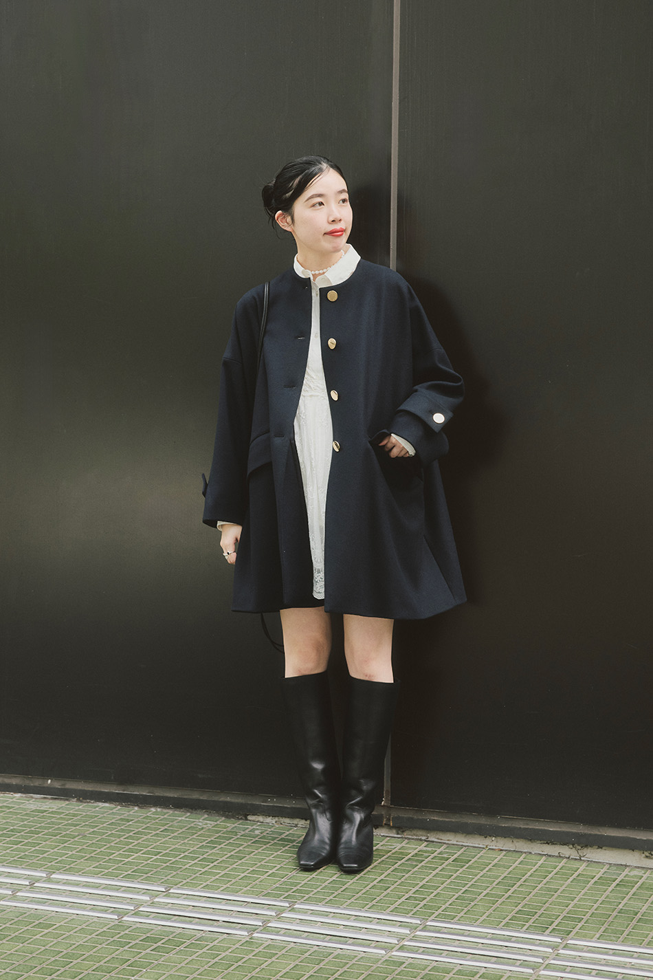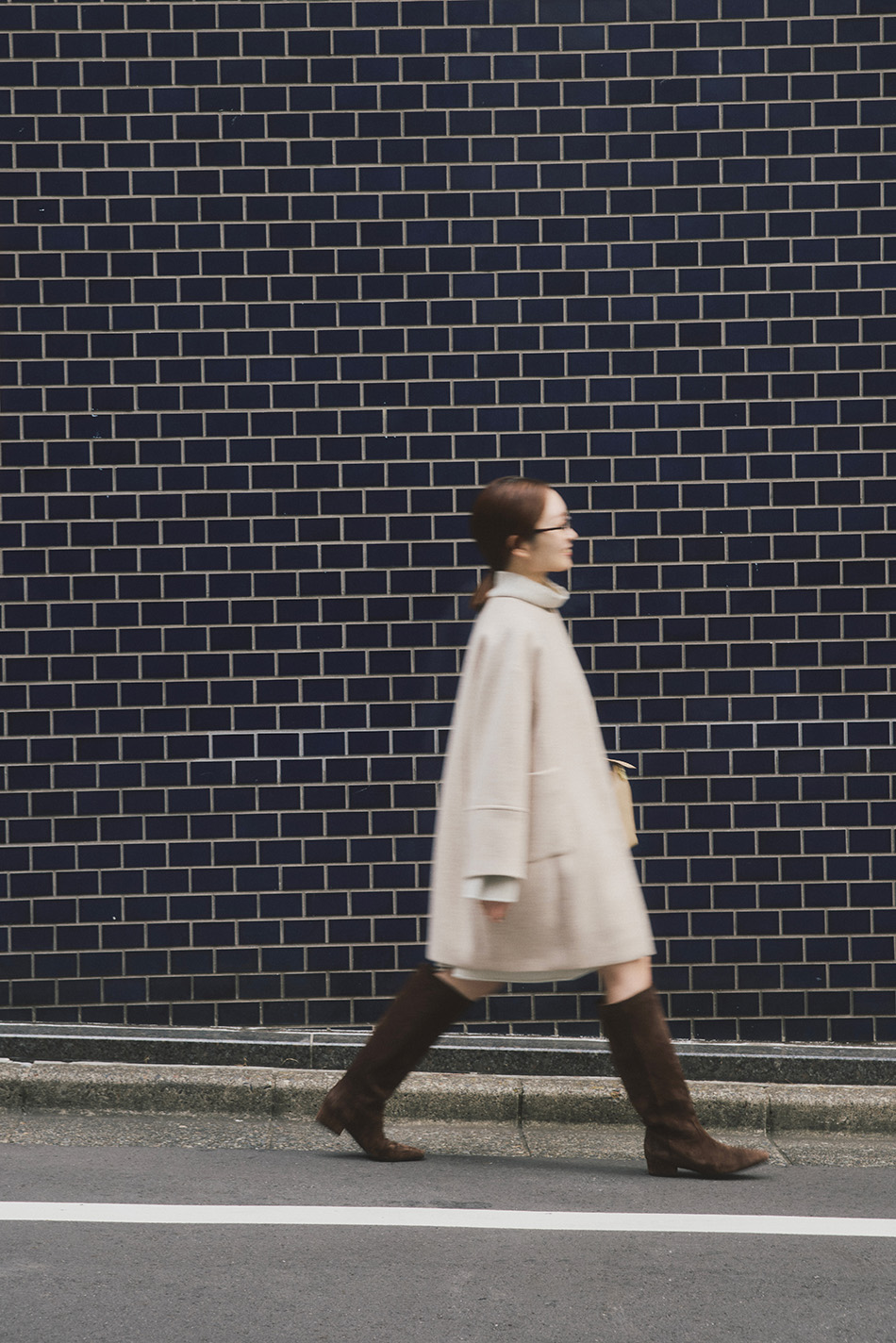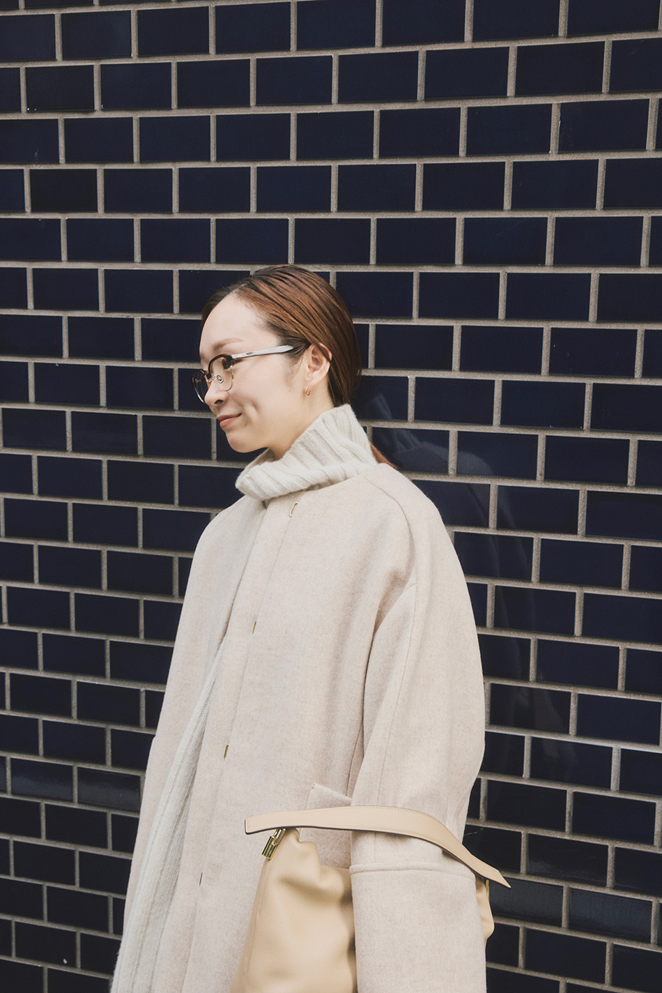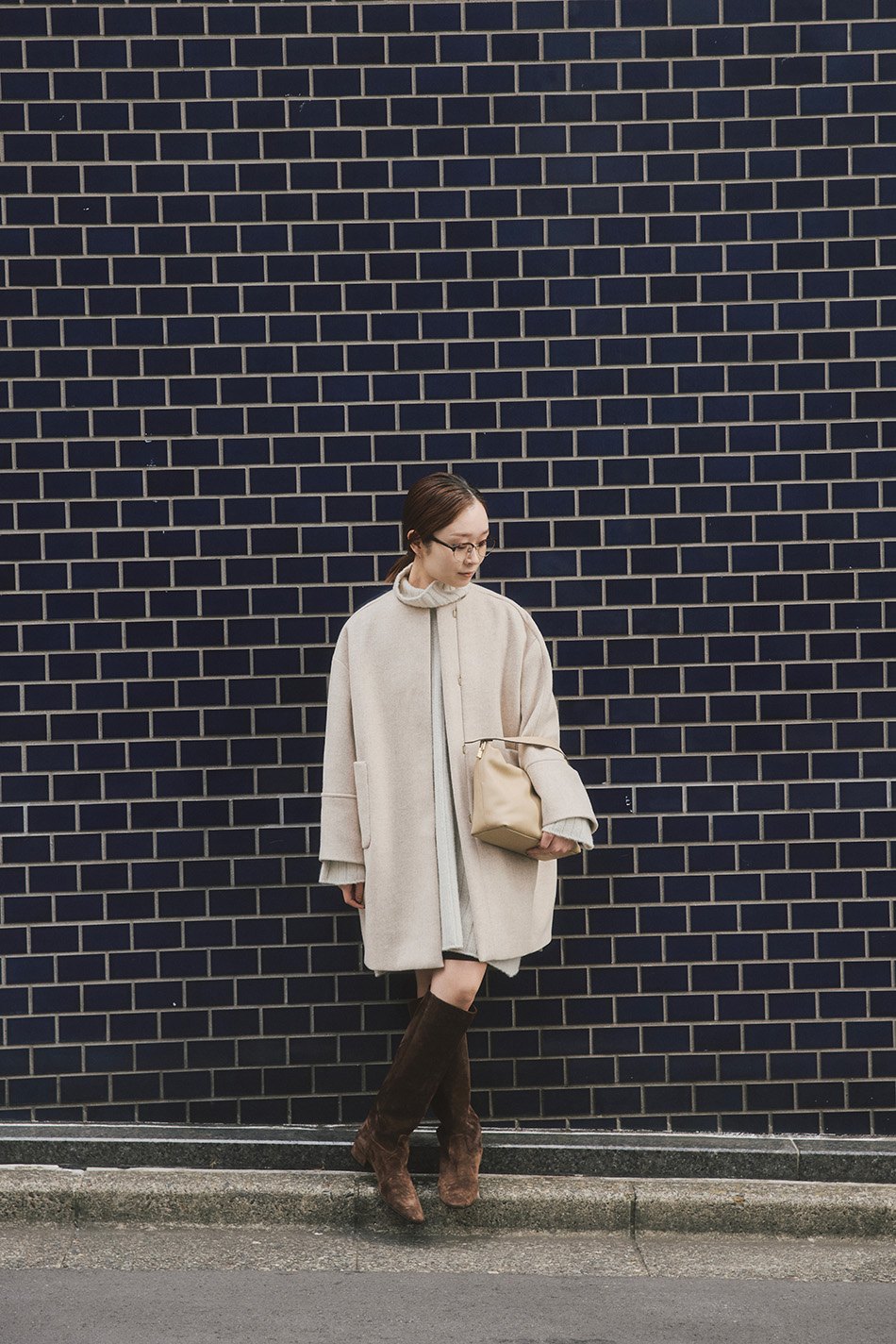 上質な生地のアウターを主役に、ベージュのワントーンでまとめてみました。甘くなりすぎないよう、ハーフパンツ×メガネでトラッドな抜け感をプラスして、重たくなりがちな冬のスタイリングも淡いトーンで軽やかに。ブーツはブラウンで引き締めて、大人っぽくしました。