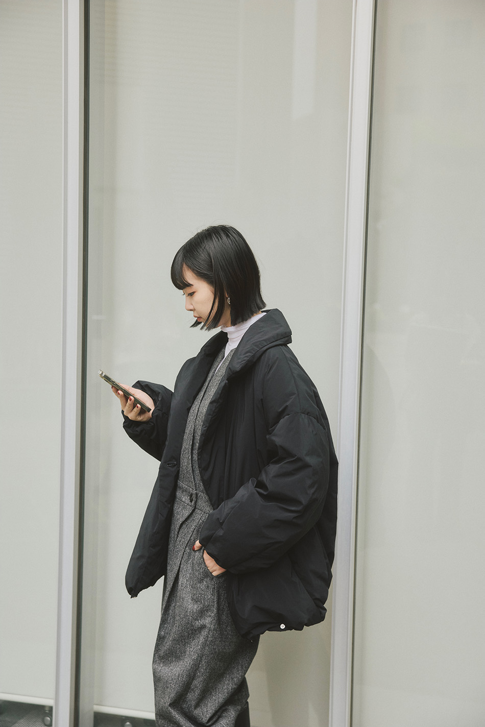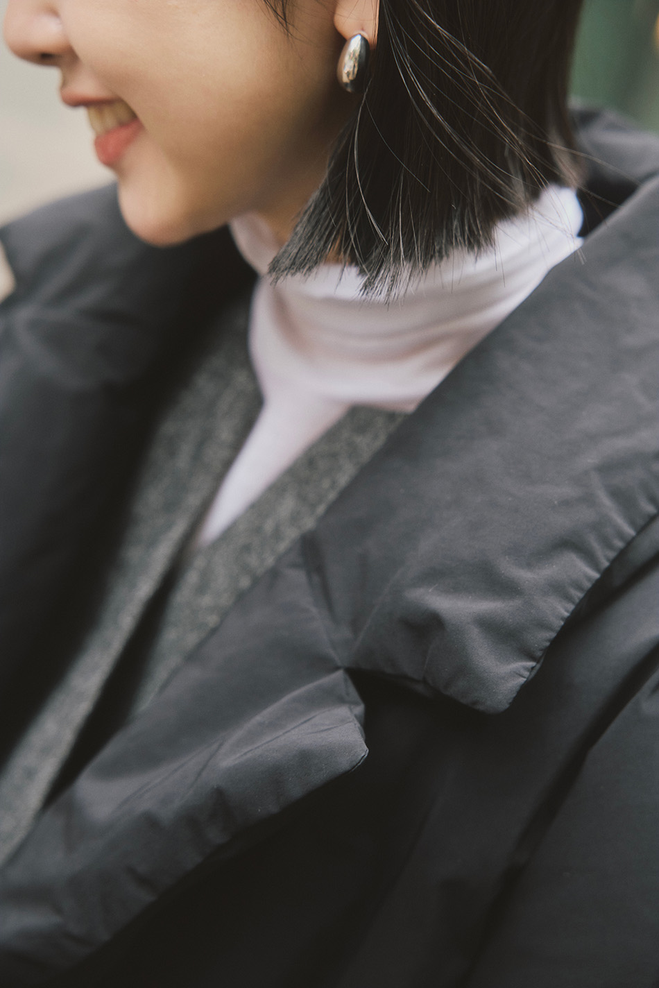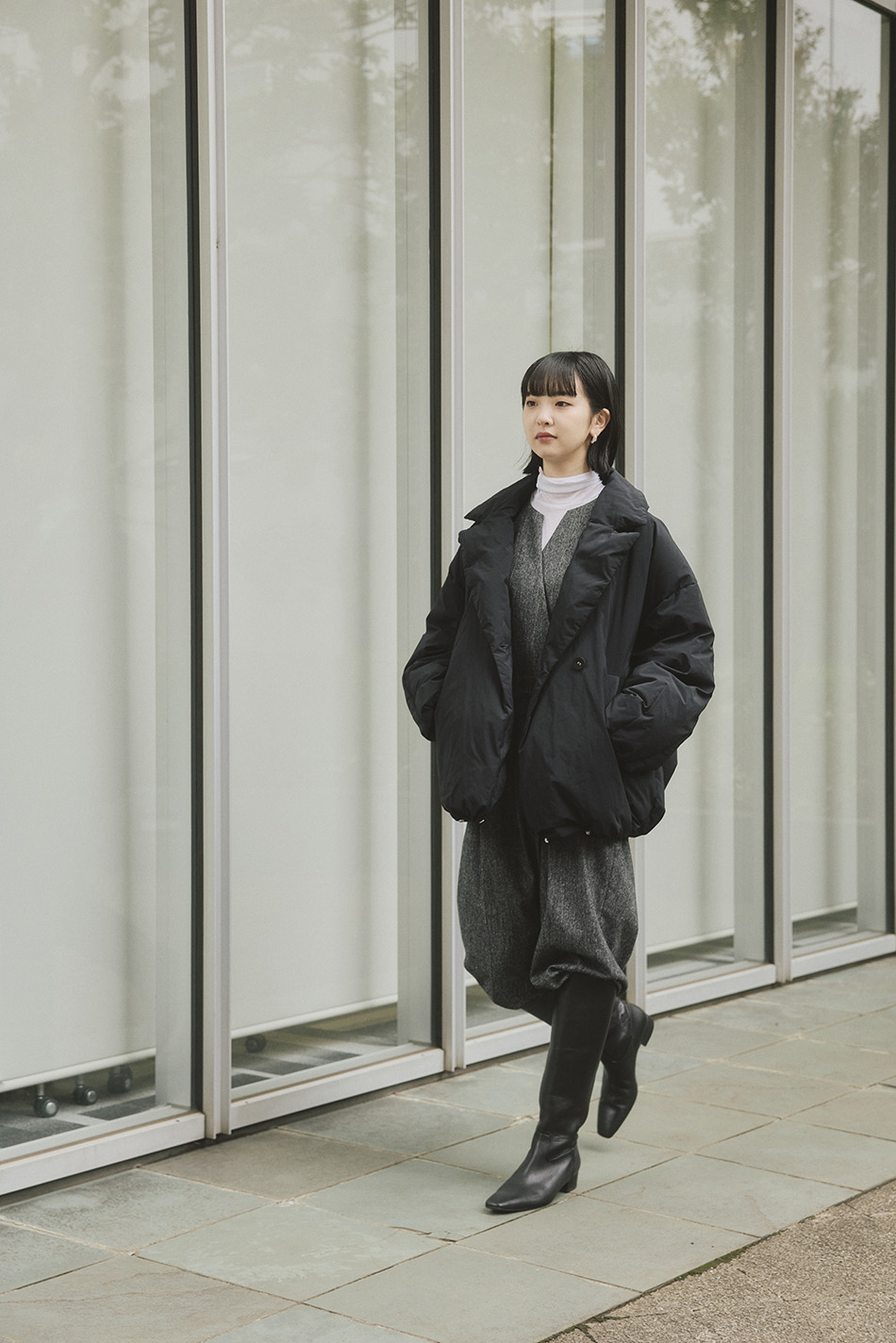 ゆったりとしたコクーンシルエットがこなれ感を出してくれる撥水ダウン。オールインワンをブーツインして雨が降っていても気にせず着れるマニッシュなスタイリングにまとめました。グレーのツイード×ブラックのレザーで洗練されたモードな組み合わせにしました。