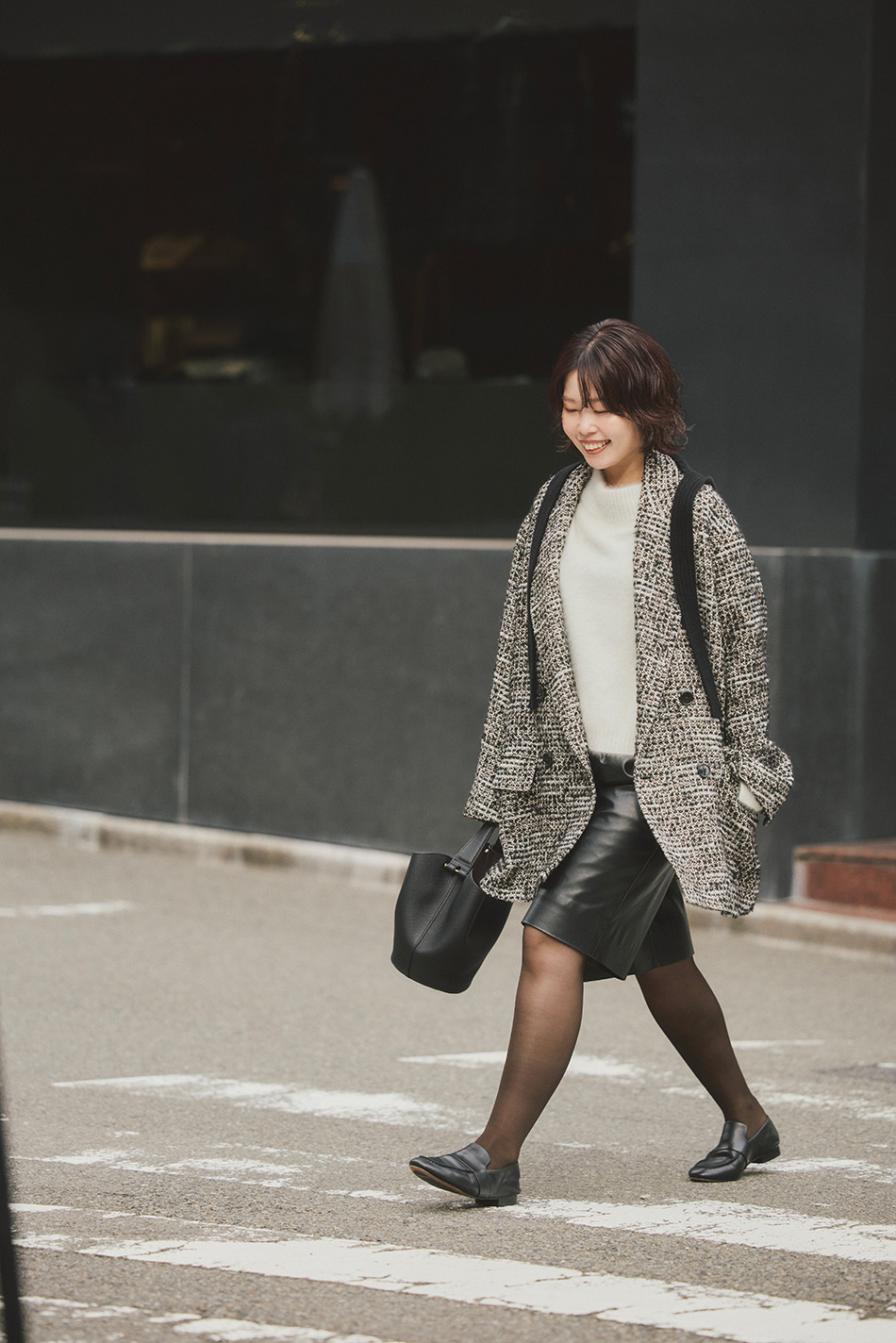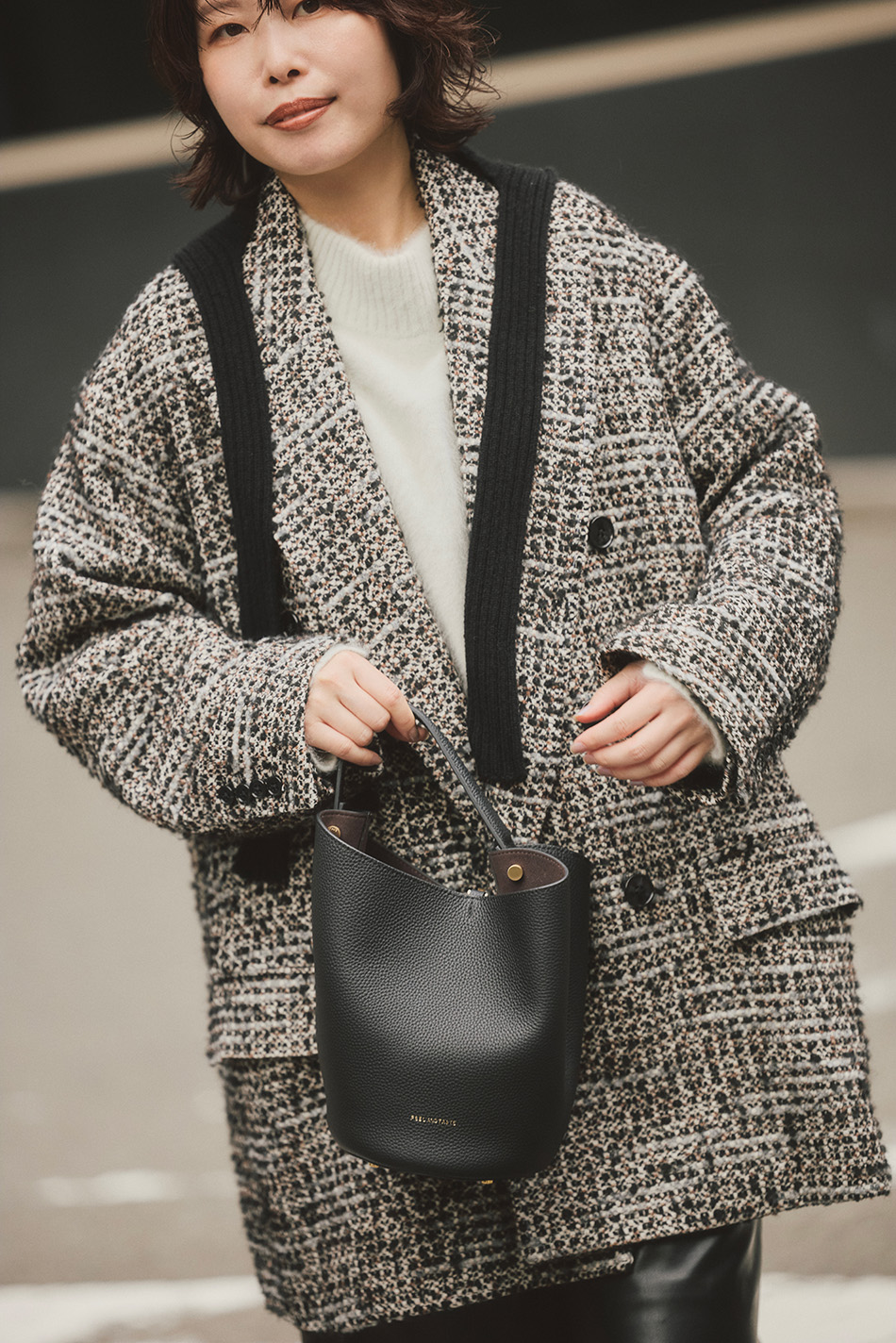 質感で魅せるツイードコートが主役。羽織るだけで雰囲気が出るので、寒い日も気分がぐっと上がります。全体をモノトーンでまとめて、たっぷりとしたシルエットを活かしつつ、ミニ丈のレザーショーツで今っぽさをプラスしました。足元はローファー合わせで、シンプルだけど品が出ます。頑張りすぎずに洒落見えするバランスが好きで、私のリアルな冬のスタイルです。
