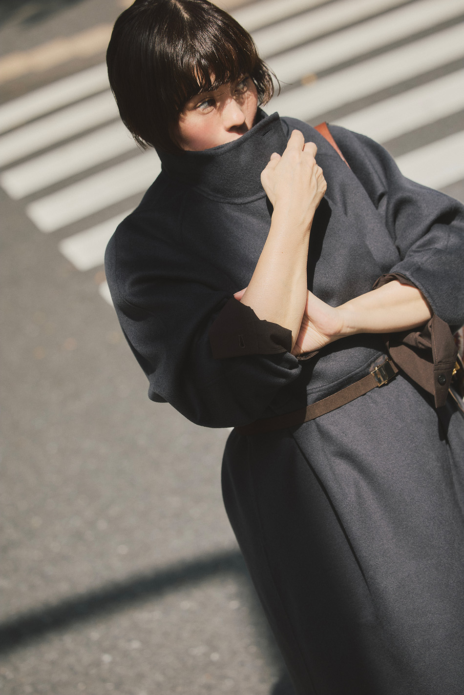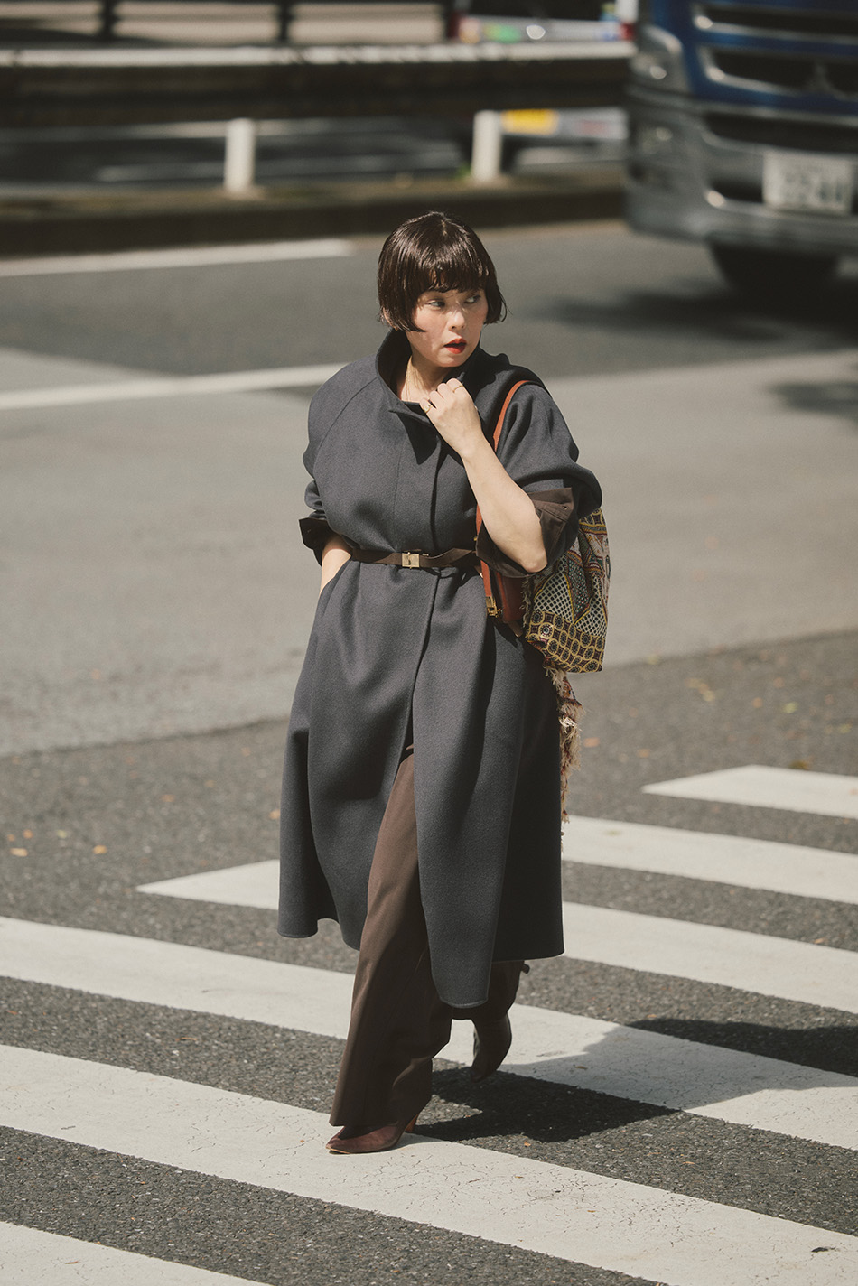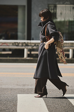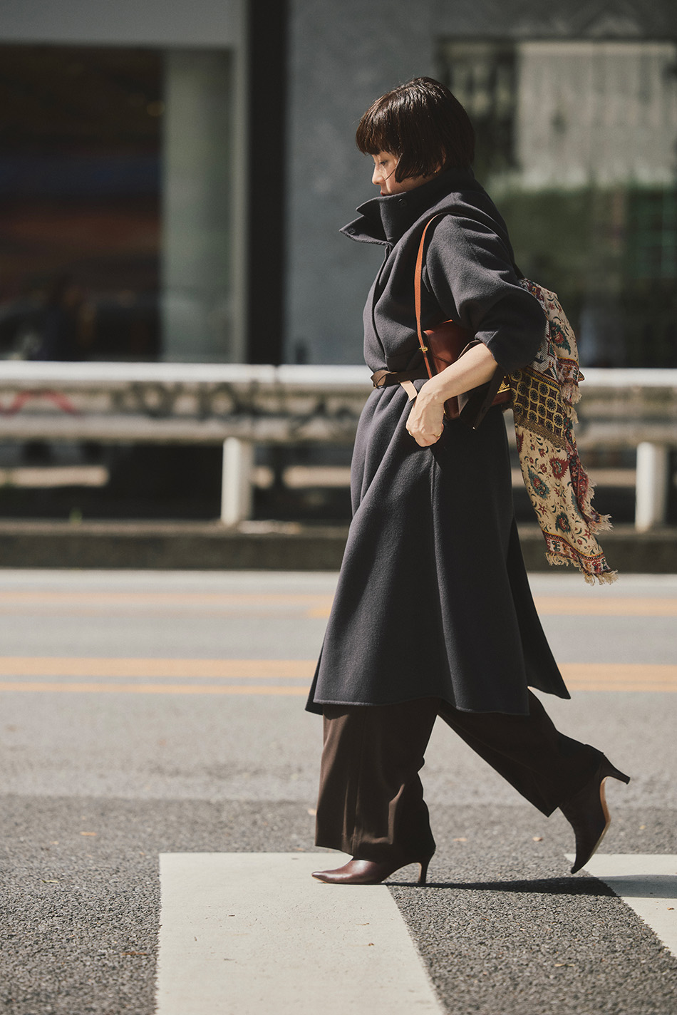コートの美しさを活かしたかったので、スタイリングの主役になるよう、ボタンと留めベルトでウエストマークしました。あとは、カラーバランス。グレー×ブラウンでまとまるよう、コート以外はブラウン系にしています。大判の花柄スカーフはアクセントに。