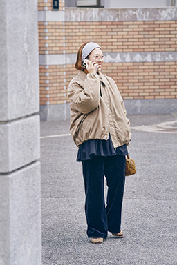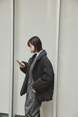 ダウンだけどブルゾンっぽくカジュアルに羽織れるアウターは、車移動や自転車をたくさん乗る私にぴったり。トップスとパンツはブラックで揃えて、アウターが引き立つようにスタイリング。ショート丈でも十分暖かく、低身長の方でもウエスト位置が高く見えてスタイルアップして見えます。程よいボリュームもあって魅力的なシルエットです。