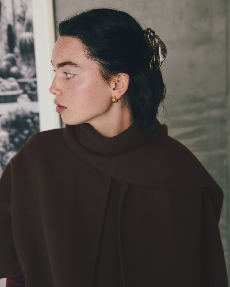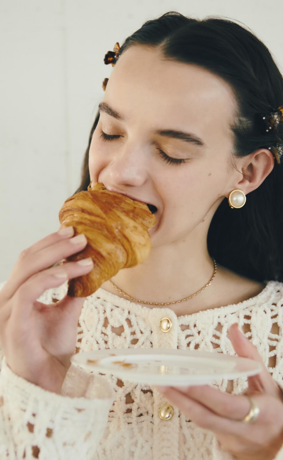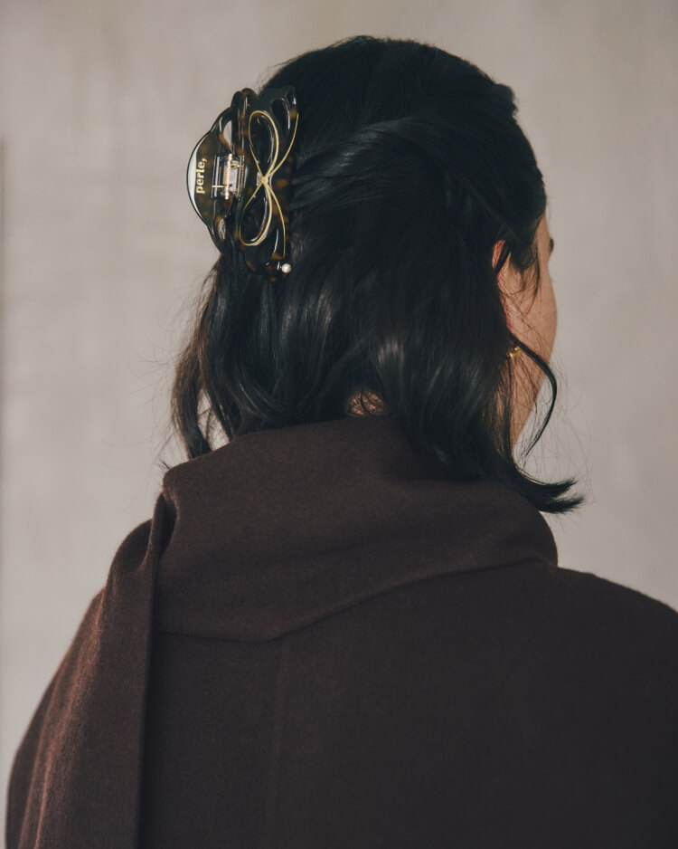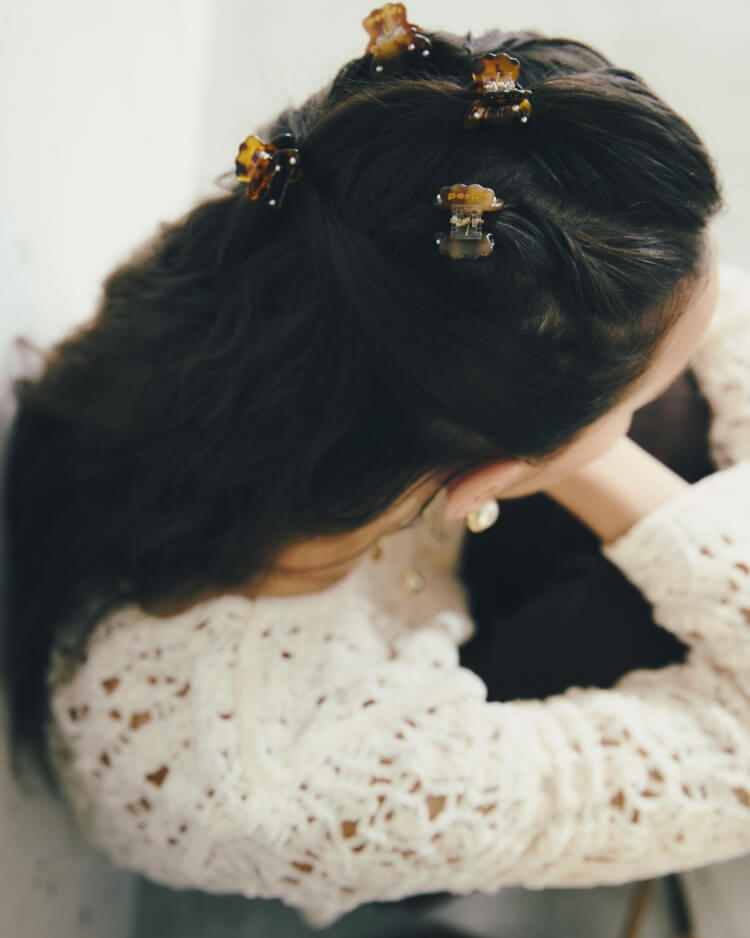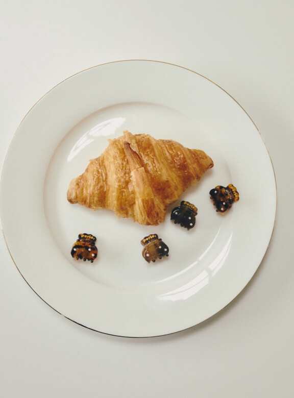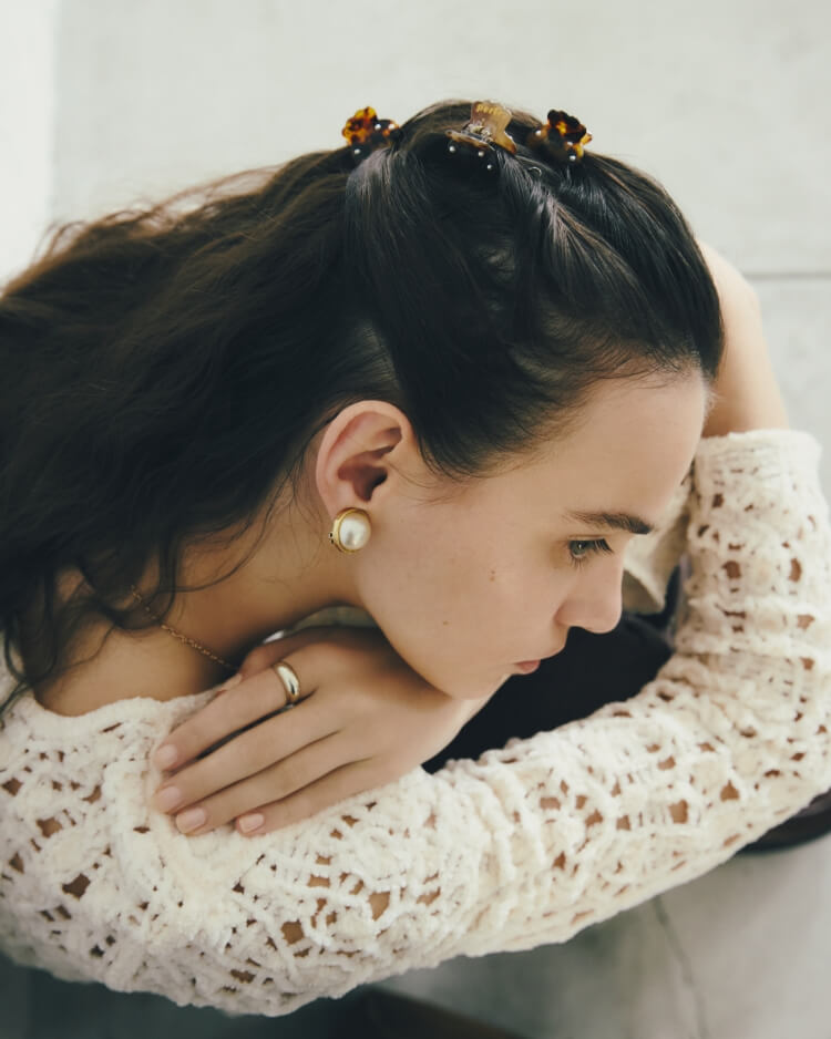 「今回パリで暮らす女性がイメージにあったので、クロワッサンをモチーフにしたものを作りたいと思っていました。小さいミニミニサイズのクロワッサンを頭にちりばめたらとっても可愛いんじゃないかというアイディアのもと、誕生したミニクリップ。色は微妙にカラーが違うべっこう色とマーブルっぽいミルキーなブラウンの2色4個セット。ミックスして使うことで、表情が出て洒落て見えます。小さなパールをランダムにちりばめていて、髪に付けたときに映えるんです。前髪を伸ばし途中の方にもぜひ使ってみて欲しいですね。適当に留めるだけでもお洒落になるのでおすすめです!」