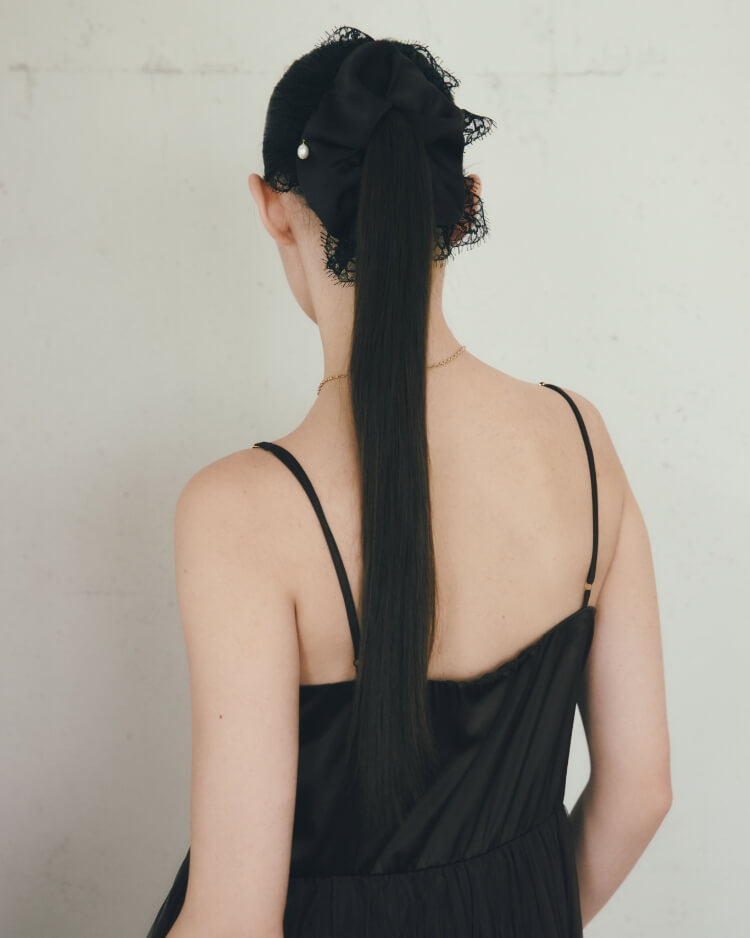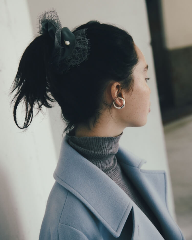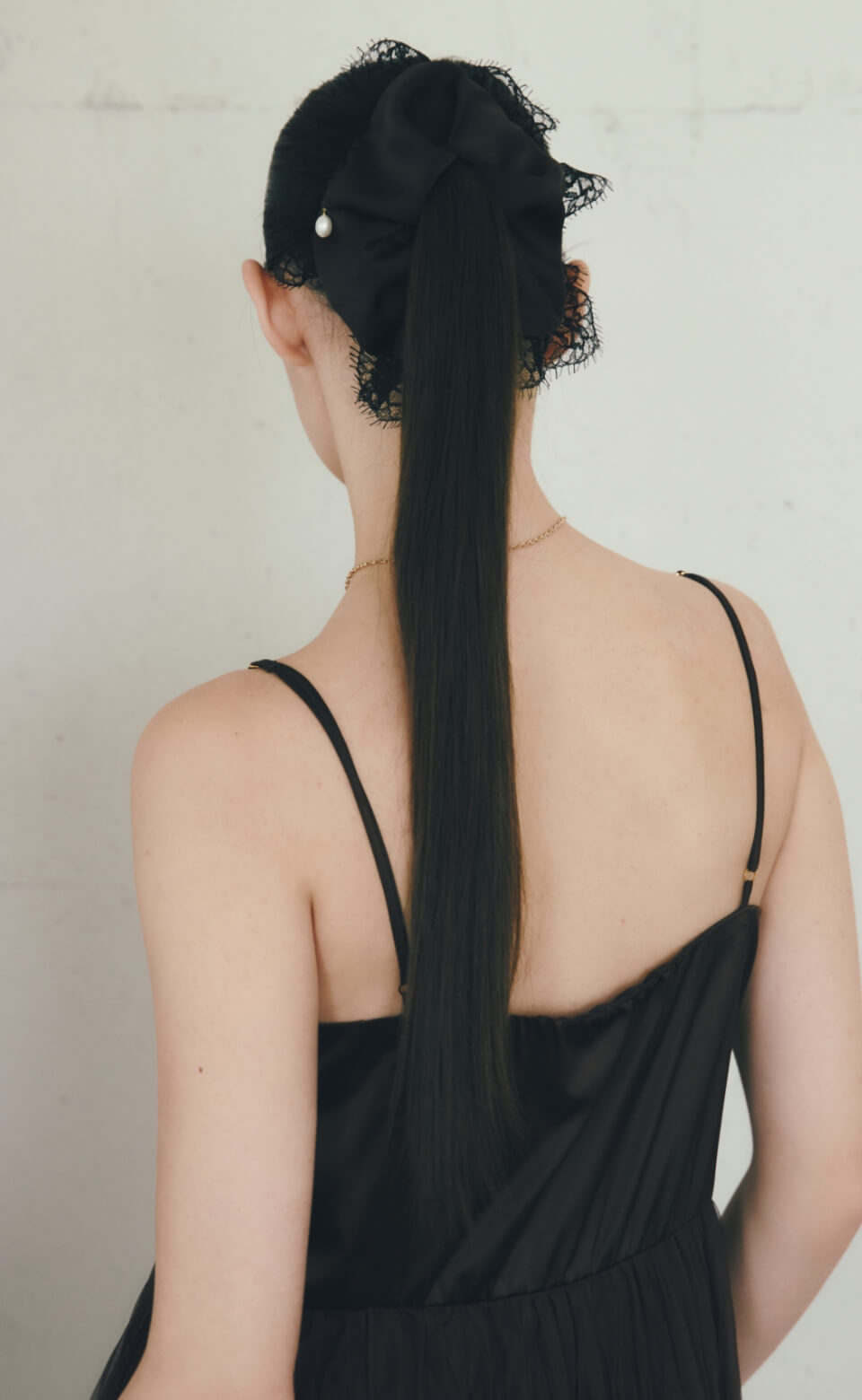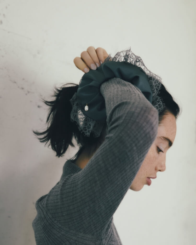 カラーもこだわっていて、肌がきれいに見えて柔らかなニュアンス感が出る、絶妙なグレーとブラウンの2色展開にしました。ランジェリーにも使用している高級感あるレースが、譲れないポイント。シュシュの大きさは結んだ時に前から見てレースが見えるように、贅沢に大きめのサイズで作っていただきました。ポニーテールにした時に頭の上にひらひらっとする感じがすごくかわいいんです。内側の素材はセミマットで高級感がある素材に。何回使ってもハリ感があってシワになりにくく、柔らかいけどふんわりハリ感が出るような素材で作っています。先端で揺れる可憐な淡水パールもポイント。つけた時にパールがチラッと見えるのもポイントです。」