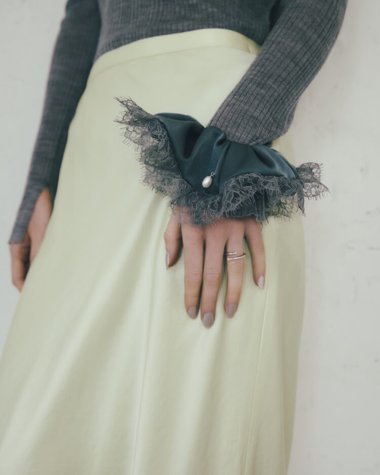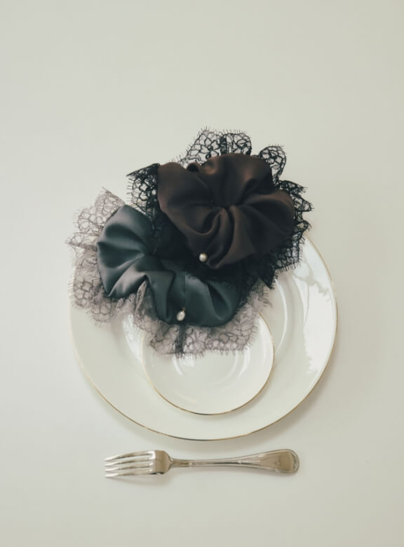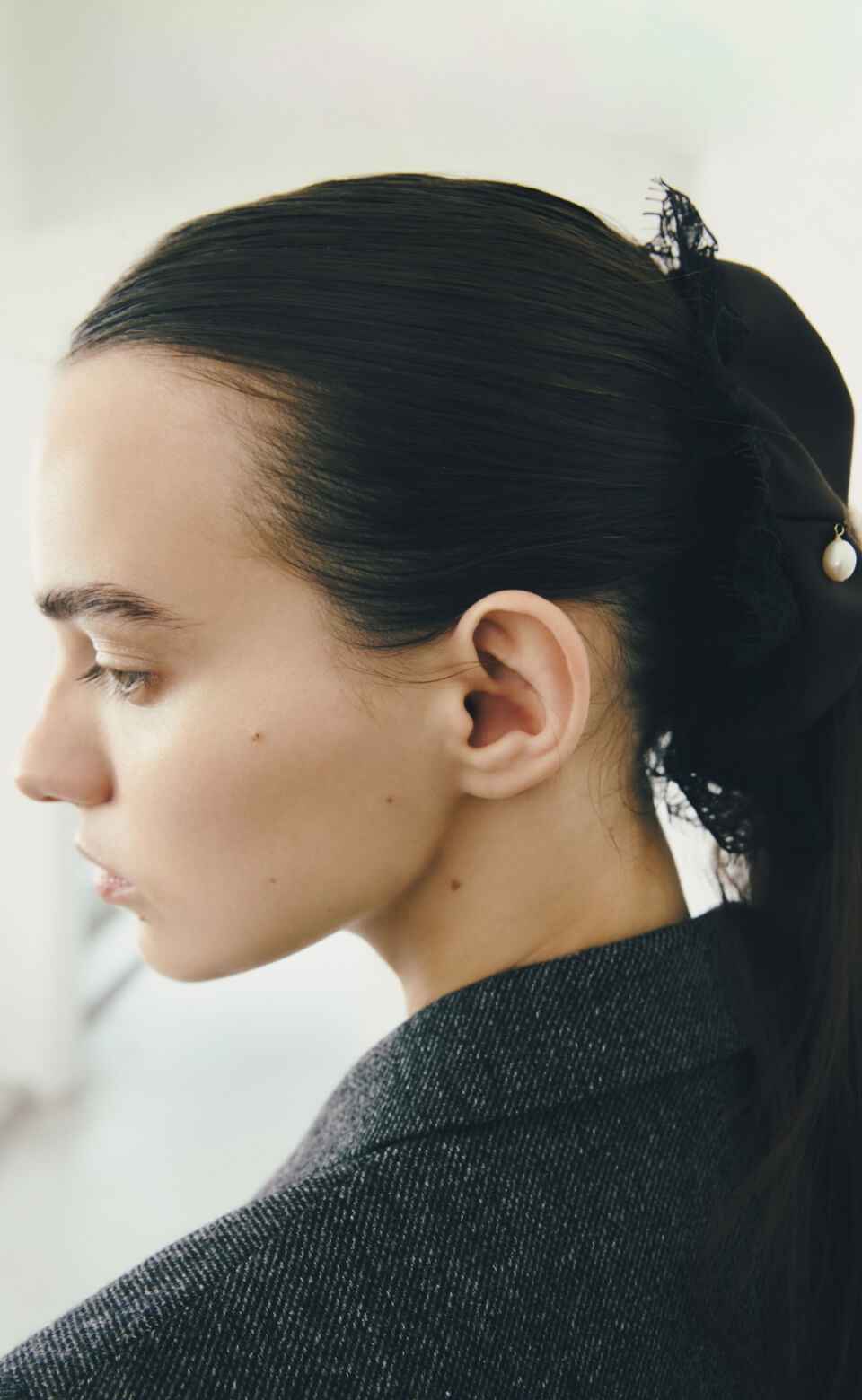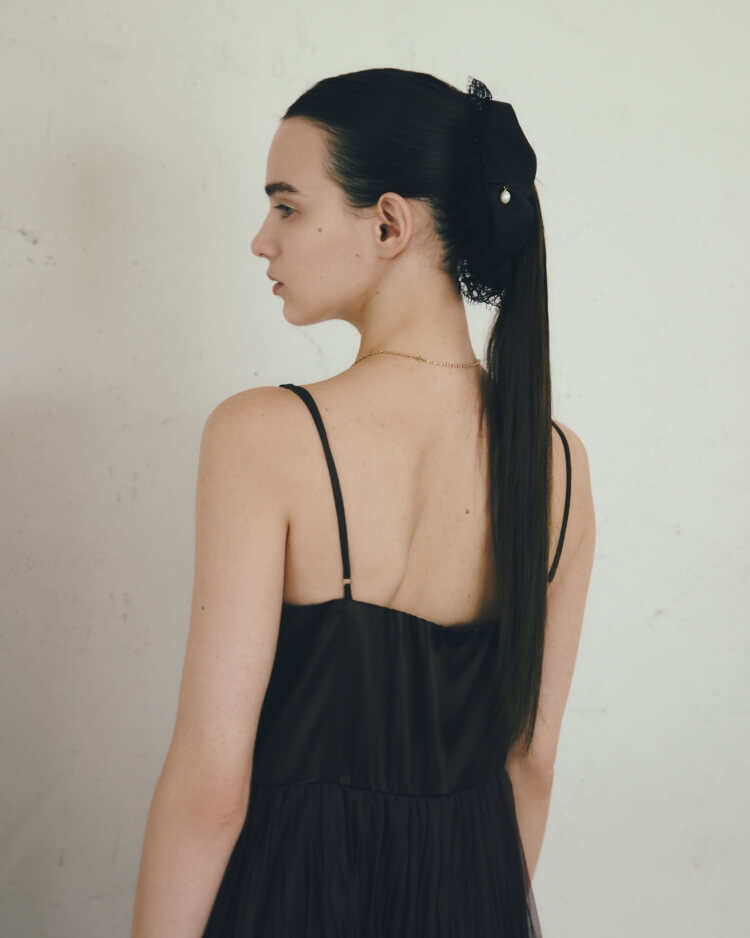 カラーもこだわっていて、肌がきれいに見えて柔らかなニュアンス感が出る、絶妙なグレーとブラウンの2色展開にしました。ランジェリーにも使用している高級感あるレースが、譲れないポイント。シュシュの大きさは結んだ時に前から見てレースが見えるように、贅沢に大きめのサイズで作っていただきました。ポニーテールにした時に頭の上にひらひらっとする感じがすごくかわいいんです。内側の素材はセミマットで高級感がある素材に。何回使ってもハリ感があってシワになりにくく、柔らかいけどふんわりハリ感が出るような素材で作っています。先端で揺れる可憐な淡水パールもポイント。つけた時にパールがチラッと見えるのもポイントです。」