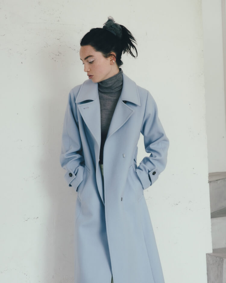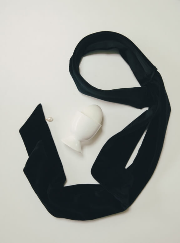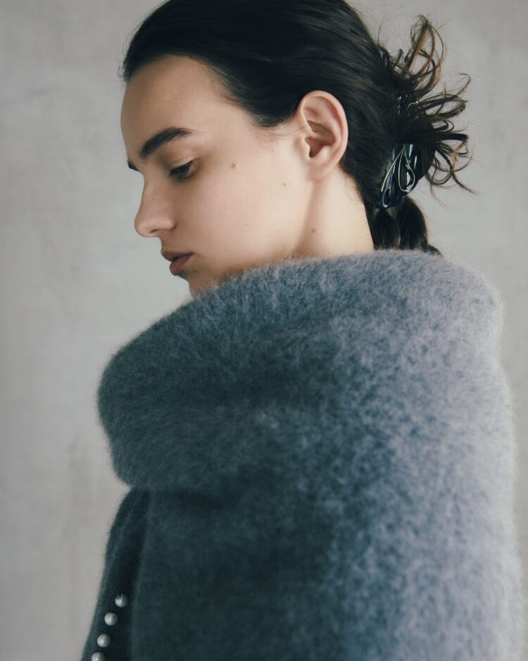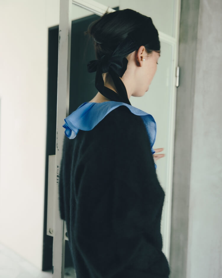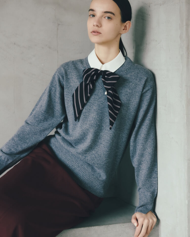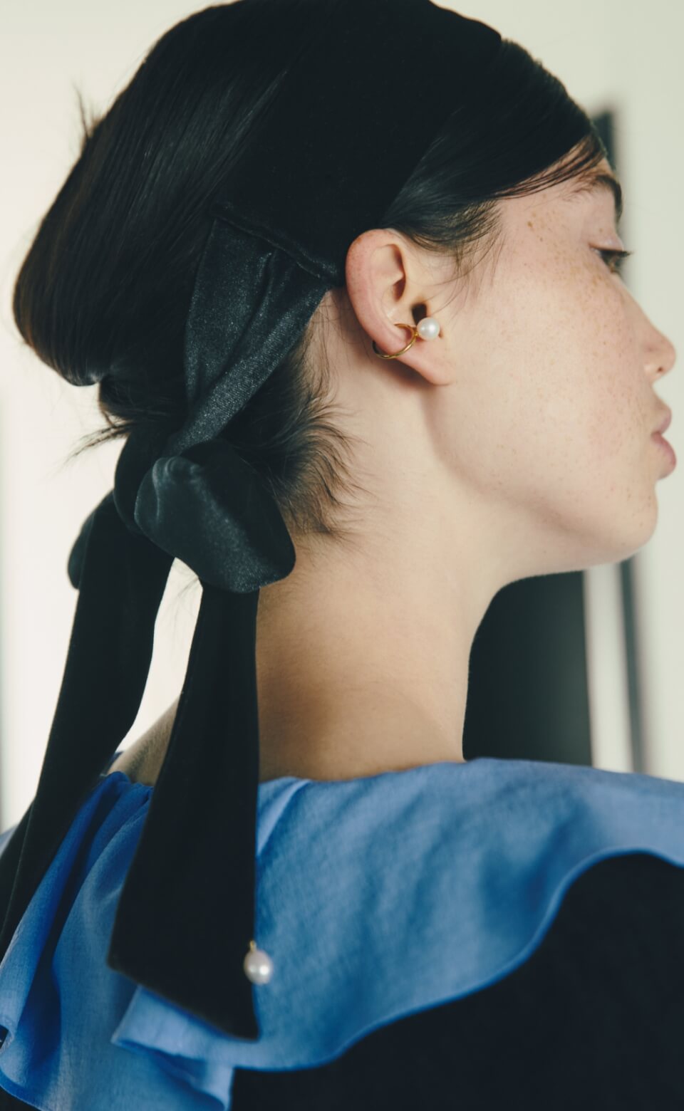 今は秋冬トレンドのグレーやブルー、白シャツにこのリボンを付けるだけで、今季らしいスタイリングになるので、ぜひブローチ使いもして欲しいです。ニットにつけても良いですし、いろんなアレンジができます。」