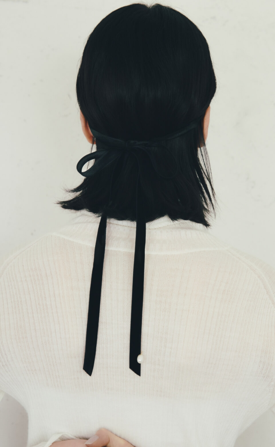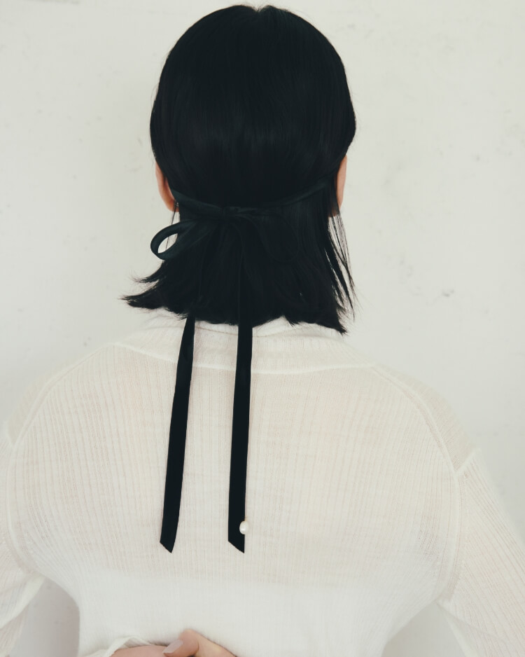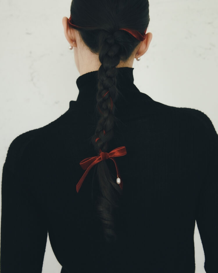 リボンの先端につけた淡水パールが、髪にリボンを編み込んで垂らした時もポイントになります。