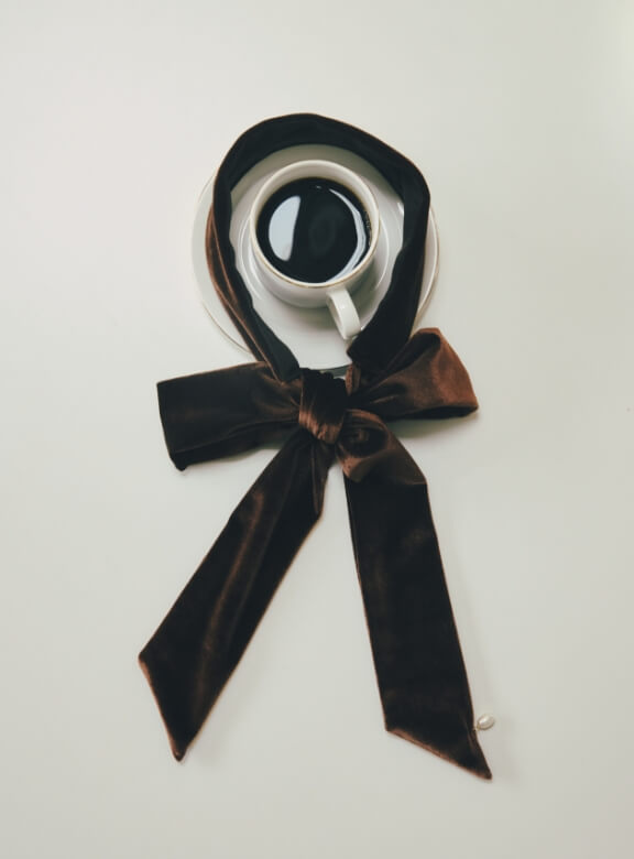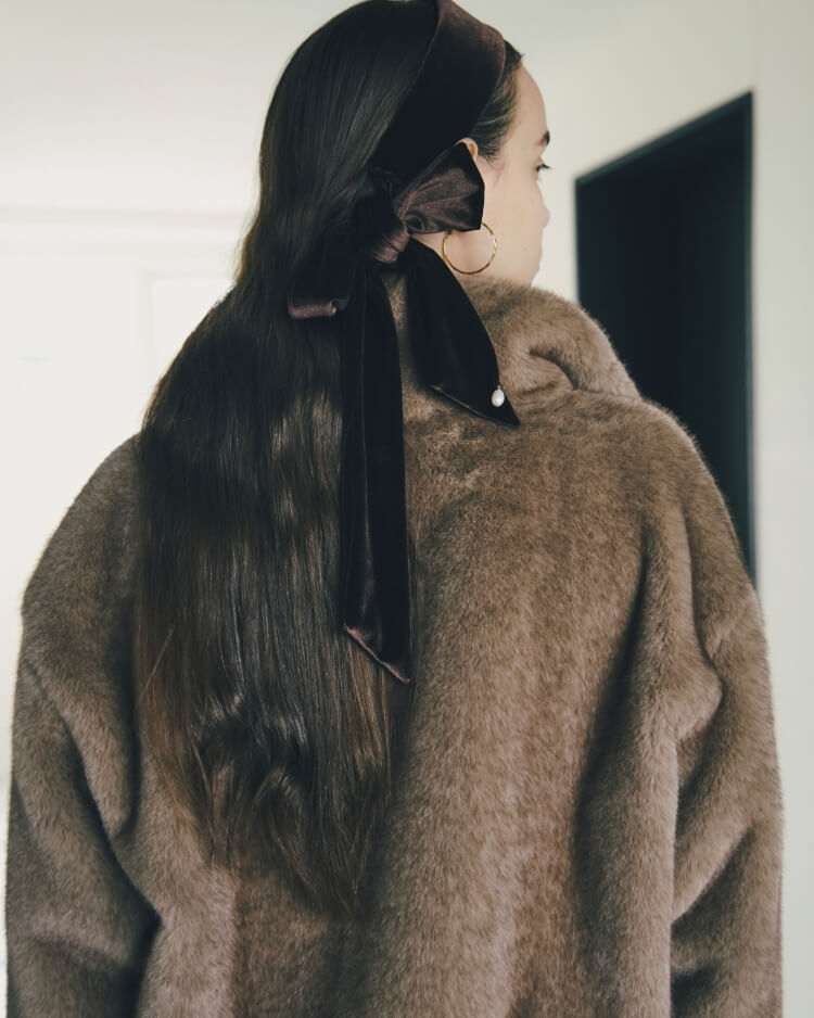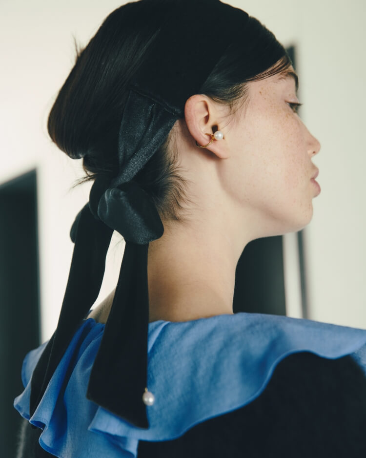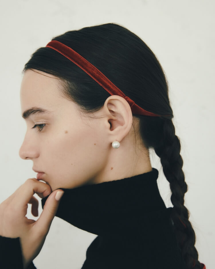 「Soeur(スール)はフランス語で妹という意味。太いリボンのカチューシャRuban(リュバン)の妹として名付けました。パリの女の子が、長いリボンをそのままクルっと頭に巻き付けたみたいなニュアンスで、使えるカチューシャにしたかったので、リボン仕立てで付けやすい細さにこだわりました。