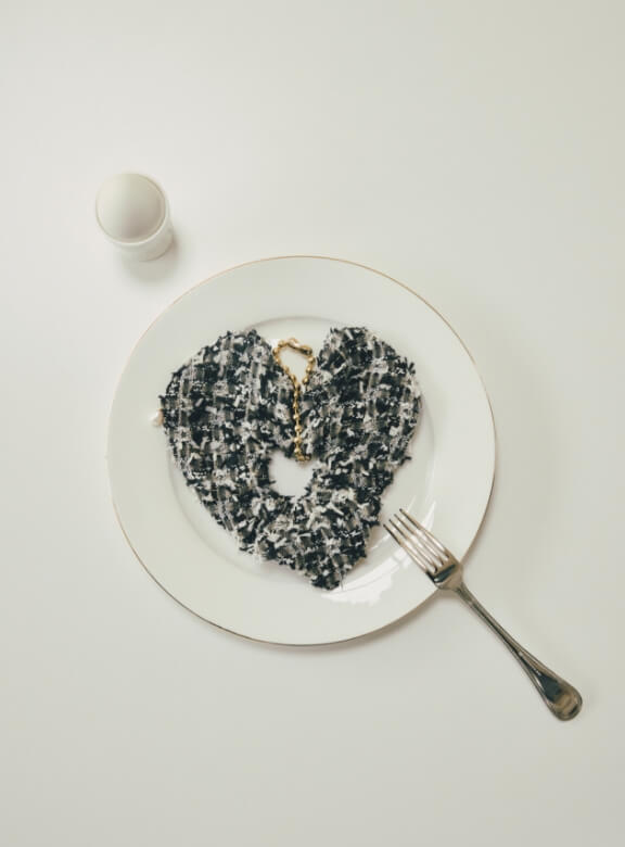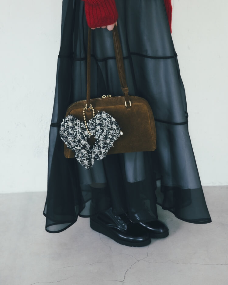「Amourは『ホリデー前にテンションが上がるアイテムを作ろう!』と思いついたんです。ツイードだったり華やかな素材でシュシュを作るとなった時に、「遊び心も入れたいな。」「キーホルダーにもなったら面白いんじゃないか」と思いつきました。“ハートがピアスを付けてる”ようなイメージで、サイドに淡水パールをつけています。