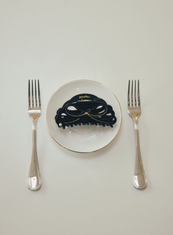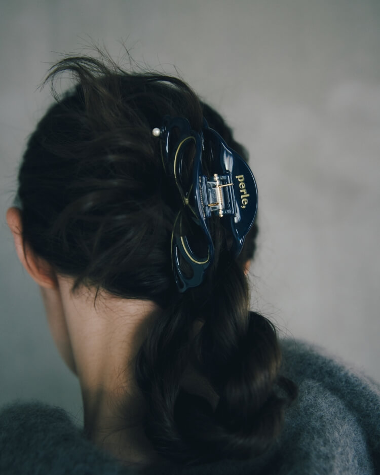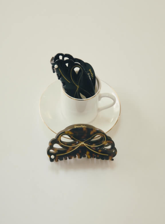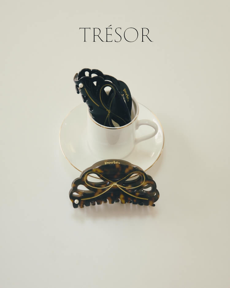 「Trésor(トレゾール)とはフランス語で宝物という意味。まるで“女の子の好きなものを詰め込んだ宝物”それがこのリボンが描かれたクリップTrésorです。髪をサッとまとめて付けるだけでパリの雰囲気が出るように仕上げました。リボンのモチーフをゴールドで入れることで高級感を出し、さりげなくつけたパールや、他にはないスカラップのデザインが、髪に付けたときに華やかさと立体感を出してくれます。スカラップの大きさも調整して大人の女性にぴったりなキュンとするクリップに仕上げました。リボンの印字も地を彫って、ゴールドの色を入れたこだわりの仕様に。カラーはソリッドなネイビーと、使いやすいべっこうのカラーで展開しています。