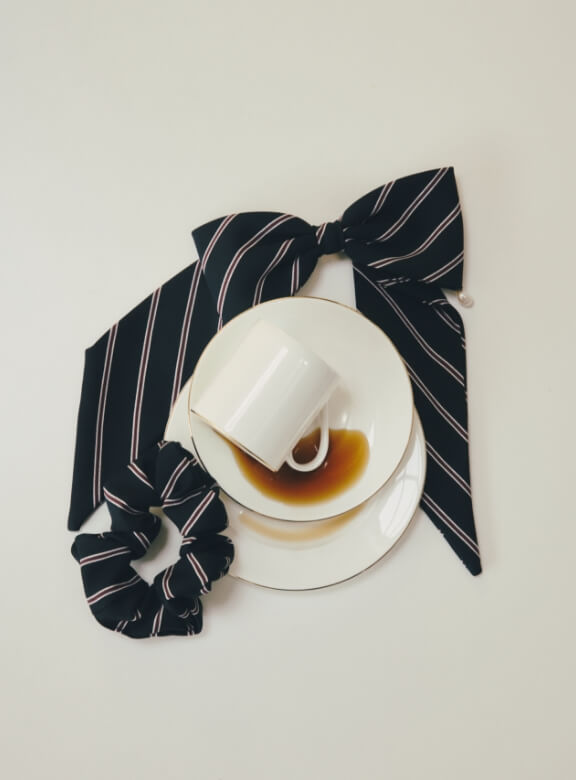「アイテム名はGentille(ジャンティーユ)少しハンサムな、紳士的なものも作りたいと思って柄をレジメン柄にしました。ハンサムだけど大きめで、中途半場な甘さではなくエッジが利いていてモードに付けられるリボンにしています。大人ハンサムに付けられるモードなリボンシュシュって他にないので、お勧めです。実はシュシュ本体とリボンが別々で使えるので、蝶ネクタイとしても使っていただけます。