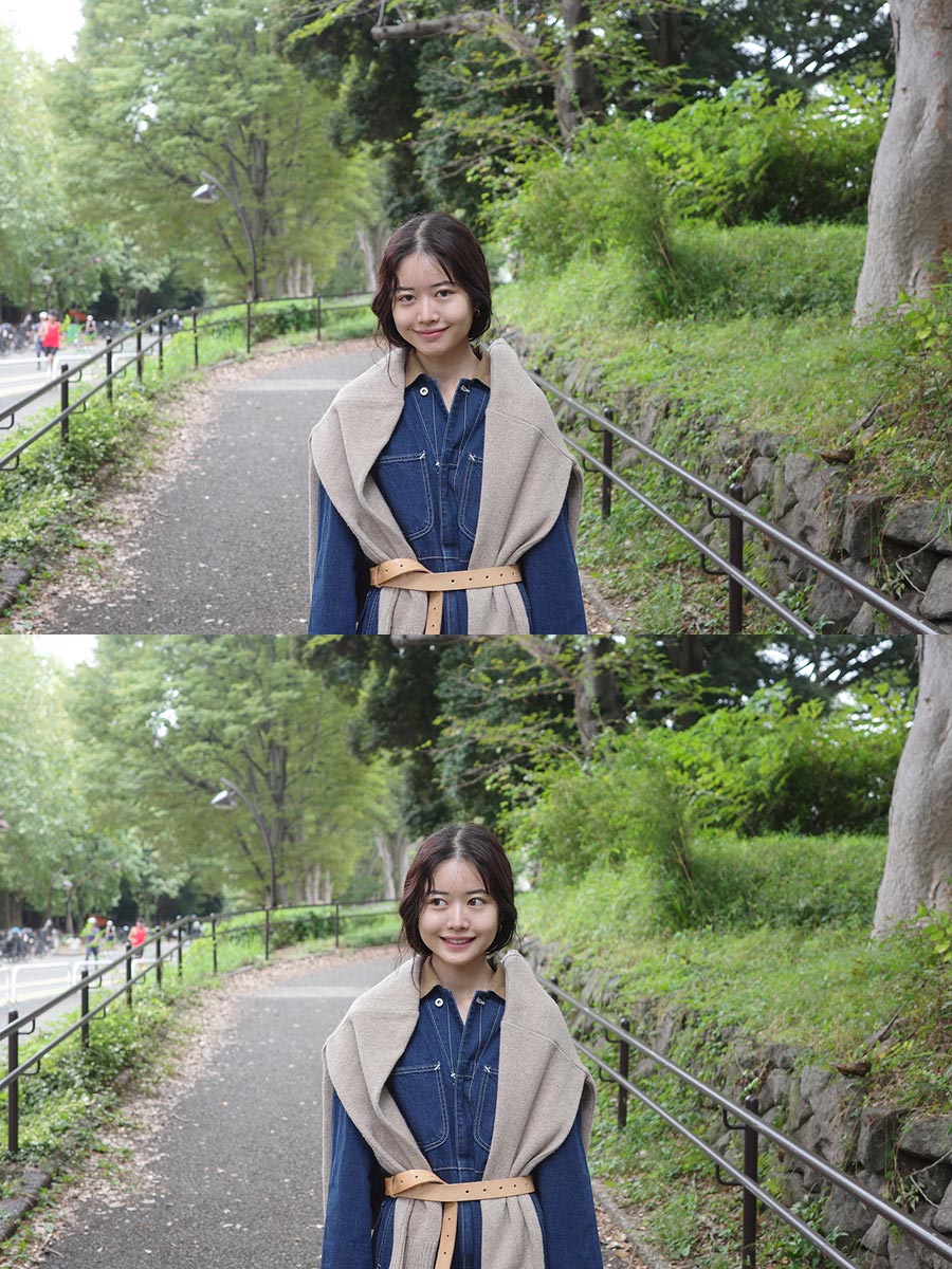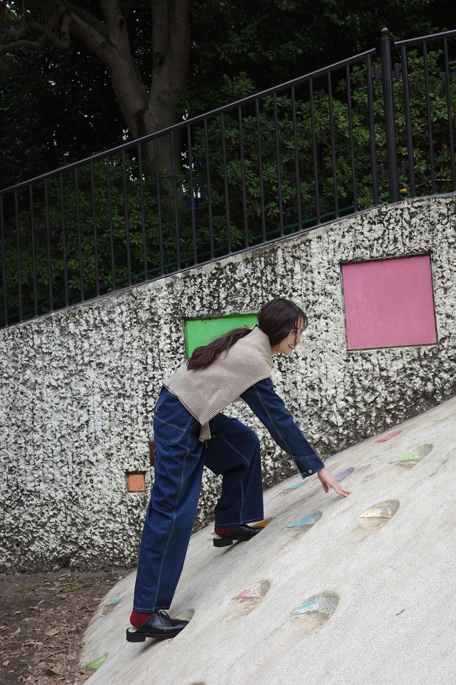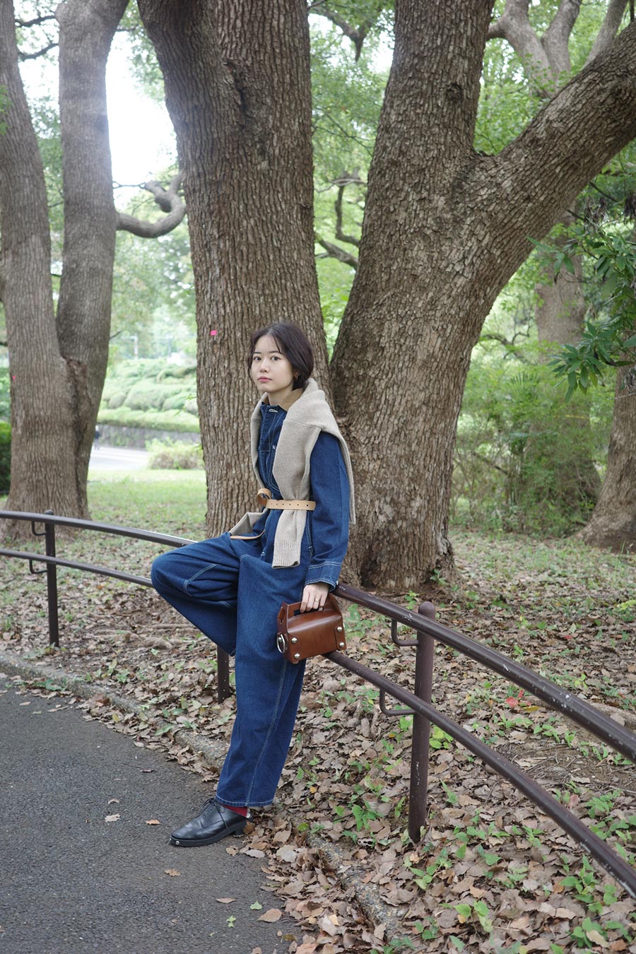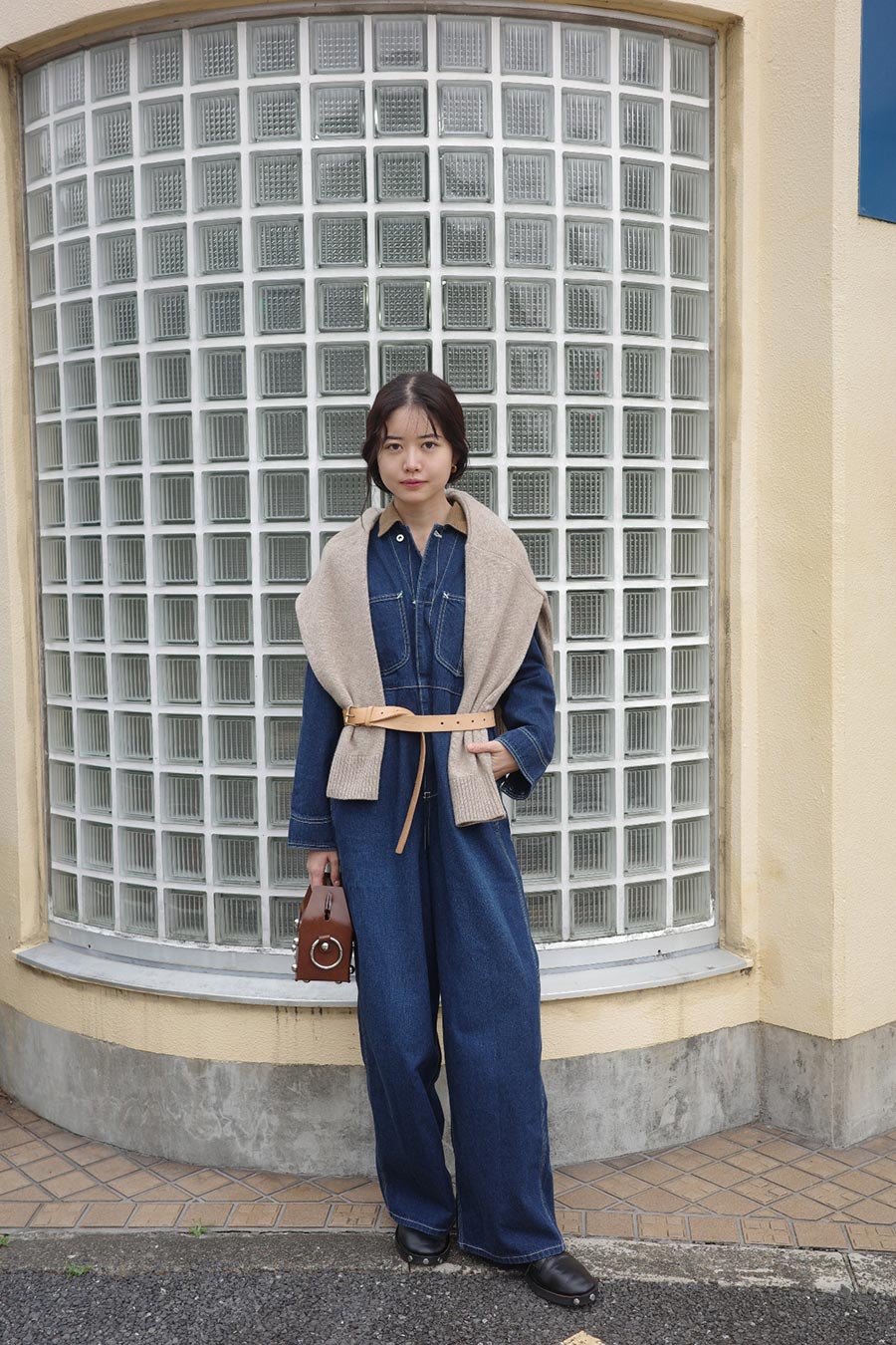 コーデュロイの襟がクラシックな雰囲気でシンプルに1枚で着用はもちろん、これからの季節はトップスにシャツやスウェット、ニットを仕込んでスタイリングが楽しめる。裾は大胆に折り返してアレンジすることも。
